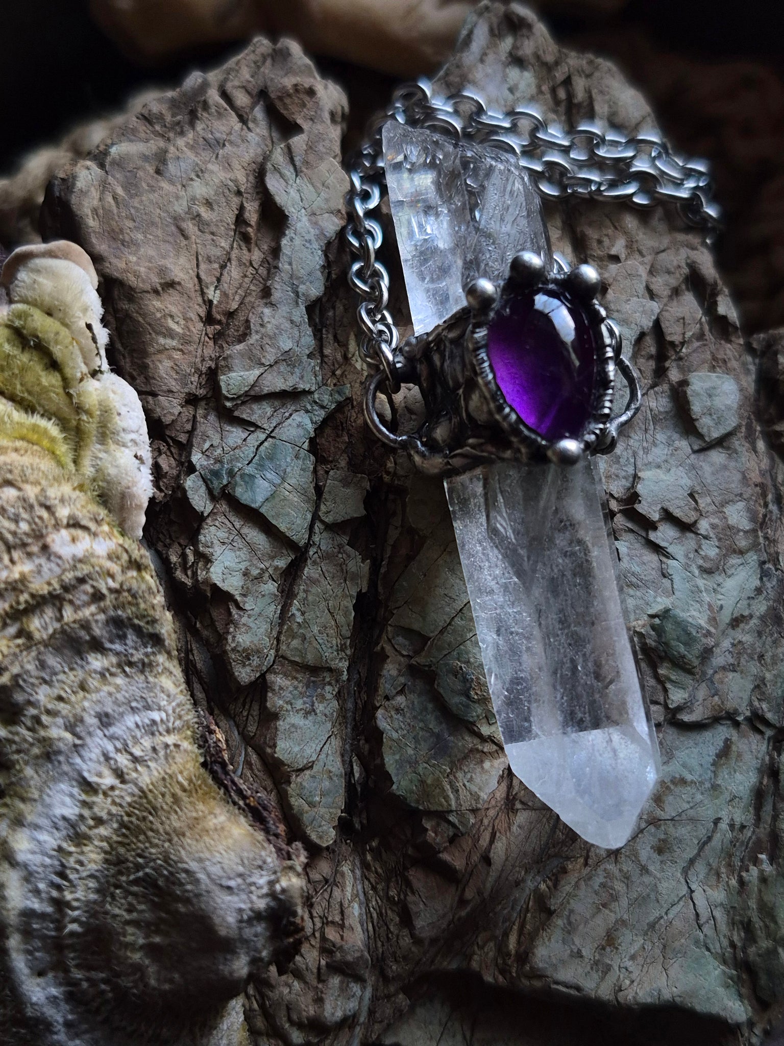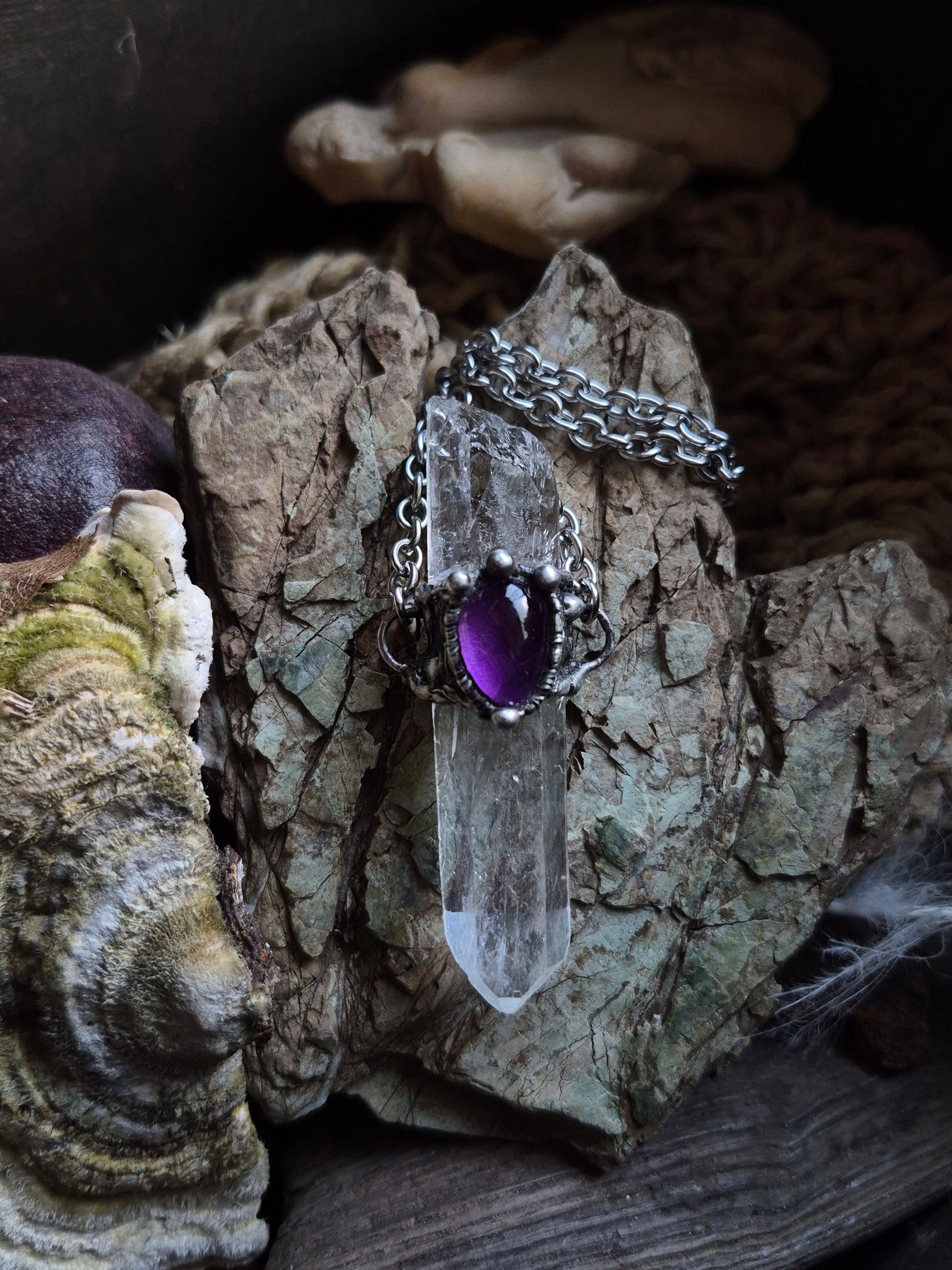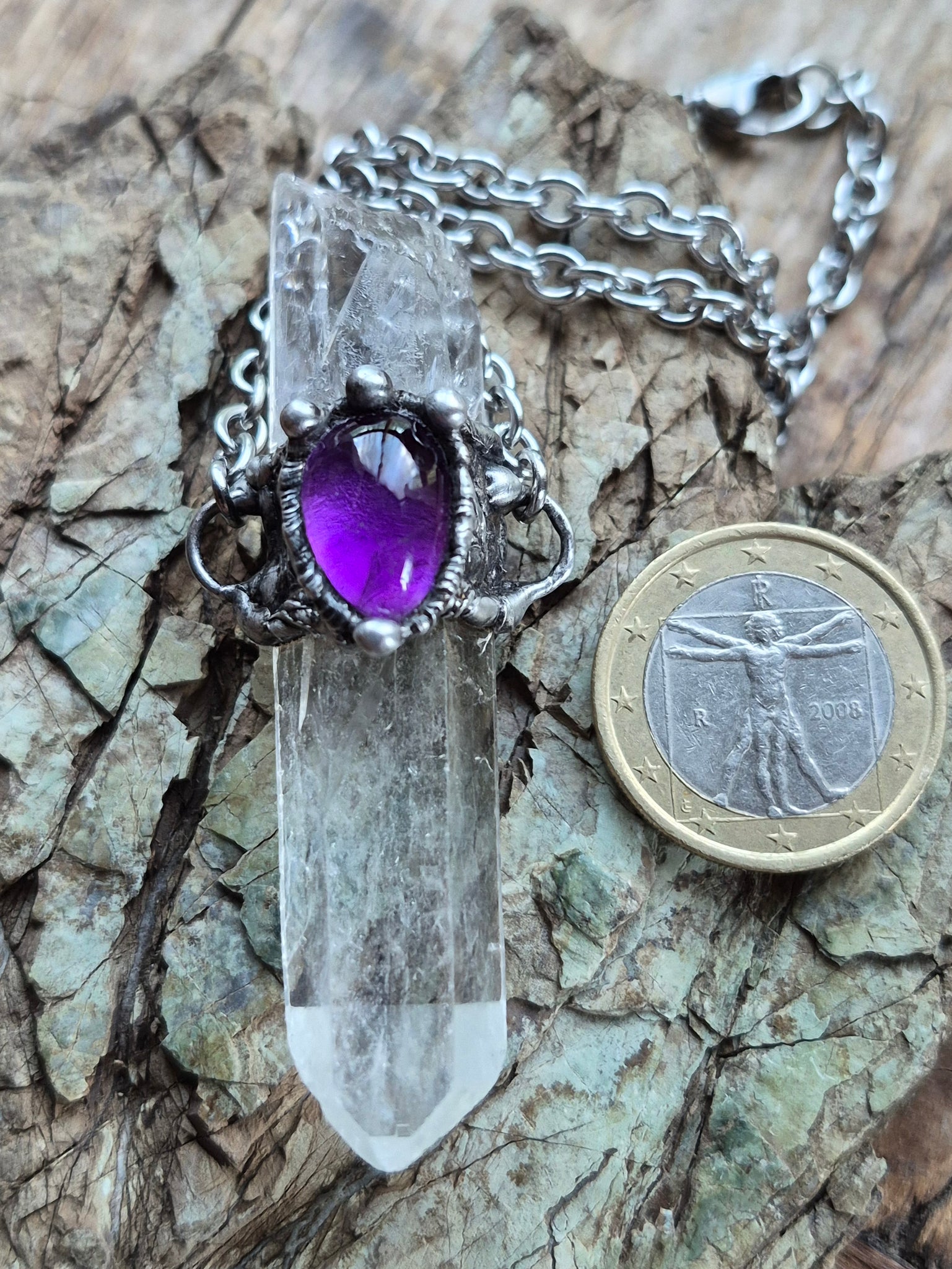 Il quarzo è avvolto da un intreccio organico di peltro, lavorato artigianalmente per sembrare materia viva, radici d'argento che emergono da un tempo dimenticato. Questo metallo, nobile e antico, non si limita a sorreggere; protegge e sigilla l'unione tra le pietre, conferendo all'amuleto un peso e una presenza che vibrano sulla pelle.