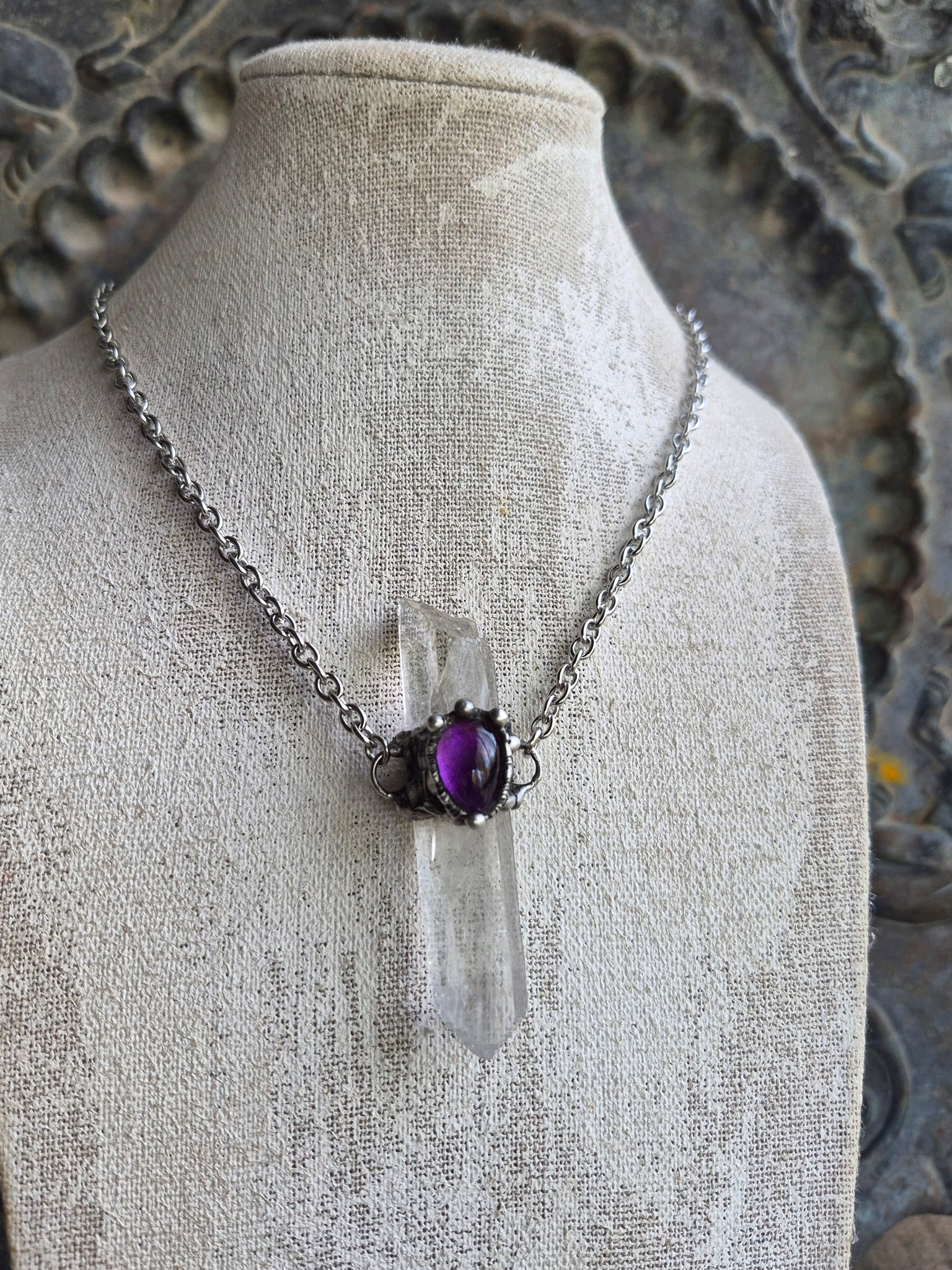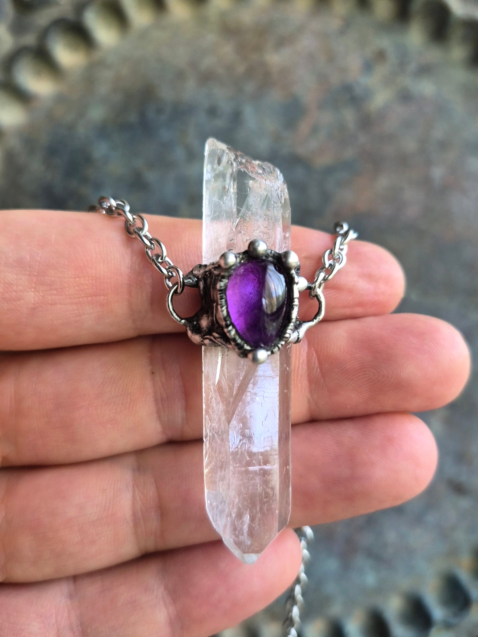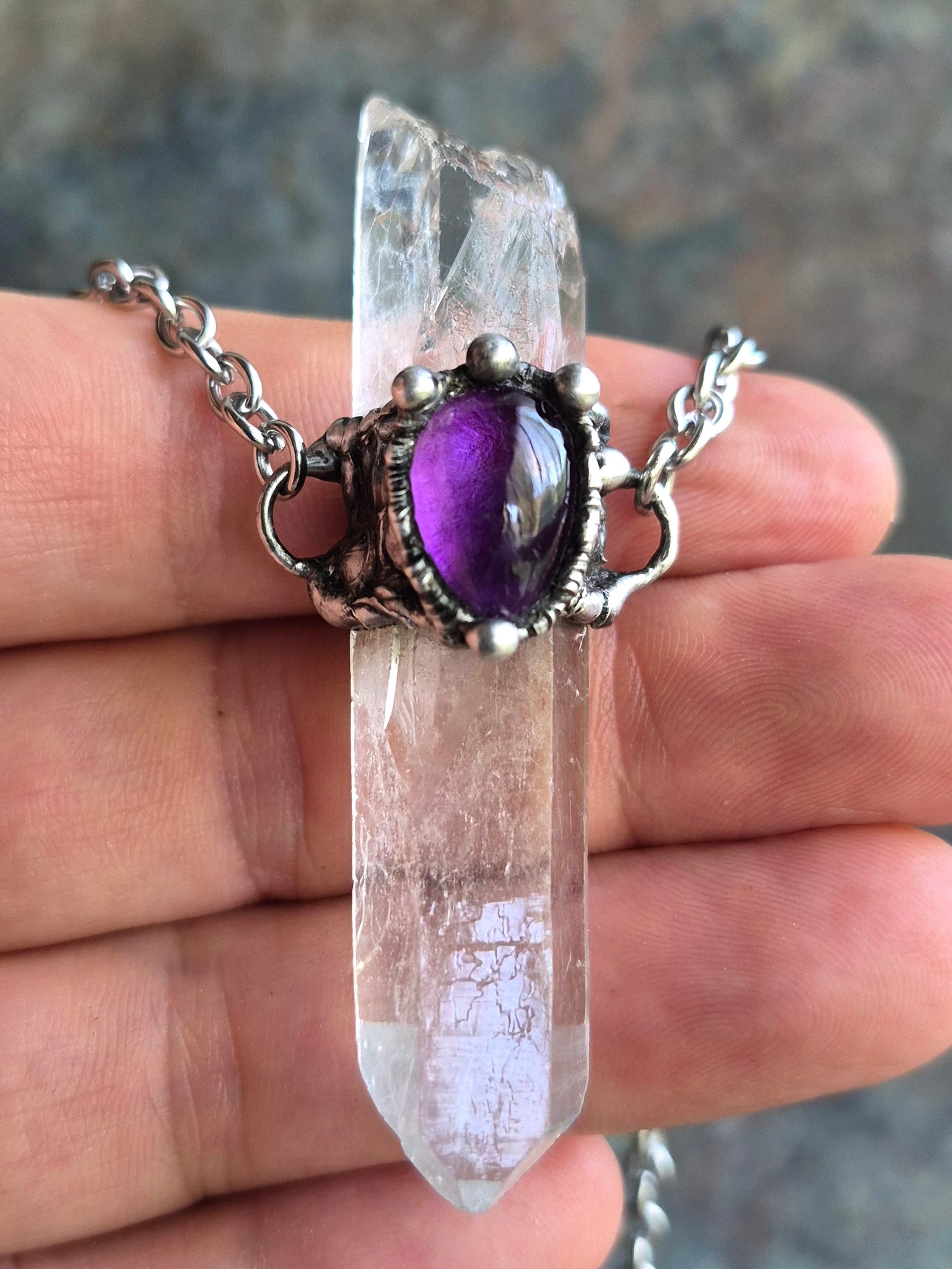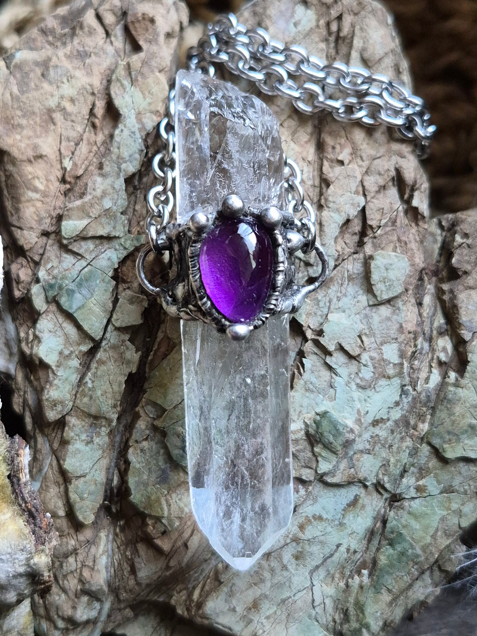 Il quarzo è avvolto da un intreccio organico di peltro, lavorato artigianalmente per sembrare materia viva, radici d'argento che emergono da un tempo dimenticato. Questo metallo, nobile e antico, non si limita a sorreggere; protegge e sigilla l'unione tra le pietre, conferendo all'amuleto un peso e una presenza che vibrano sulla pelle.