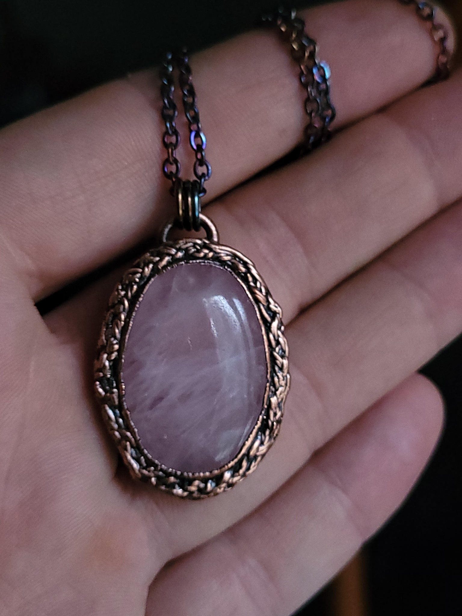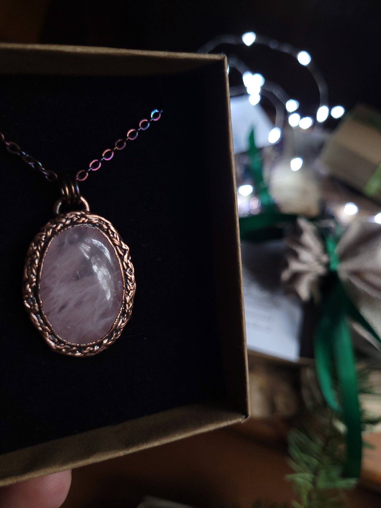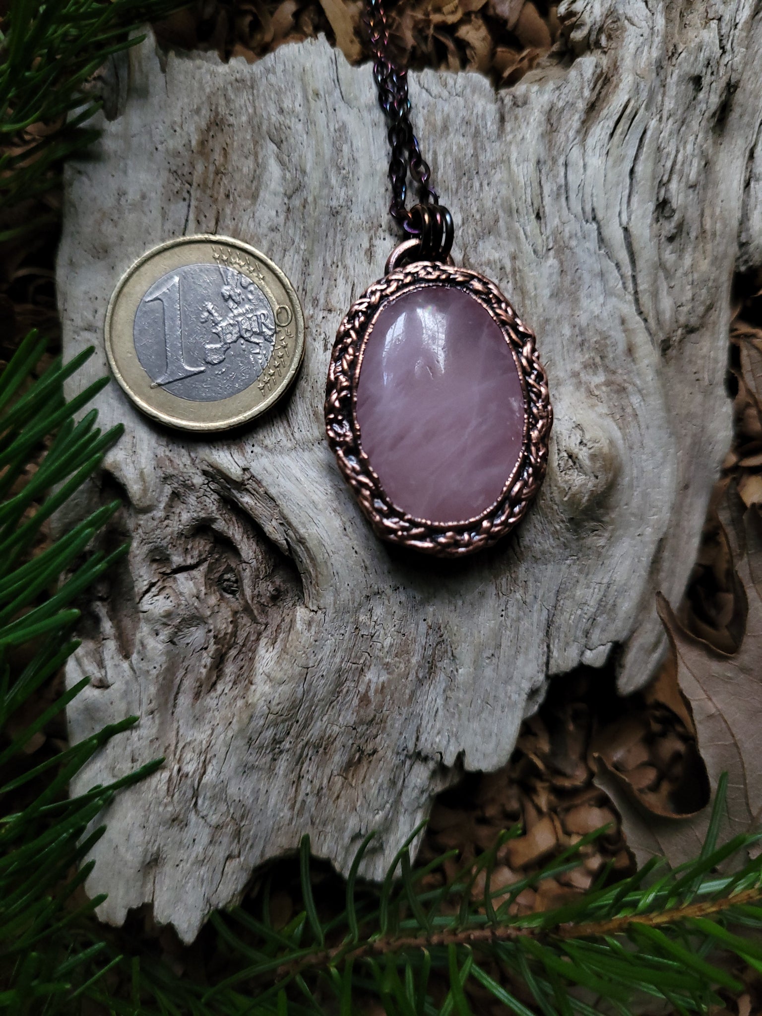 In questo Amuleto un bellissimo esemplare di Quarzo rosa è avvolto da una trama intessuta a mano e fissata per l' eternità dal robusto rivestimento in rame anticato.