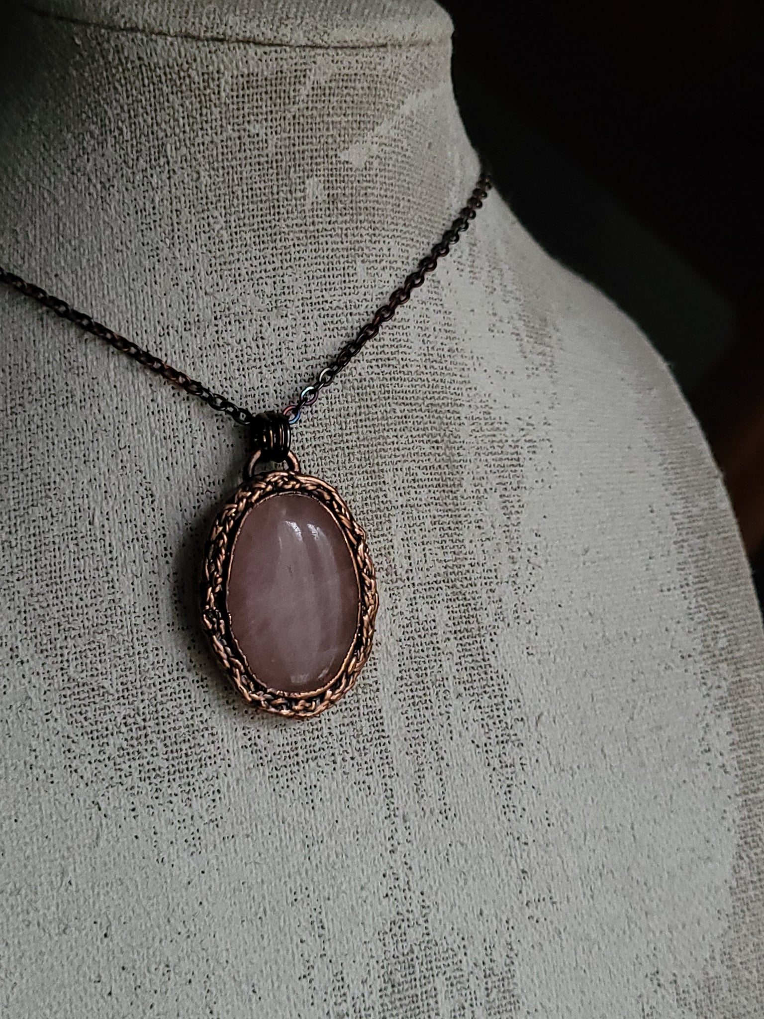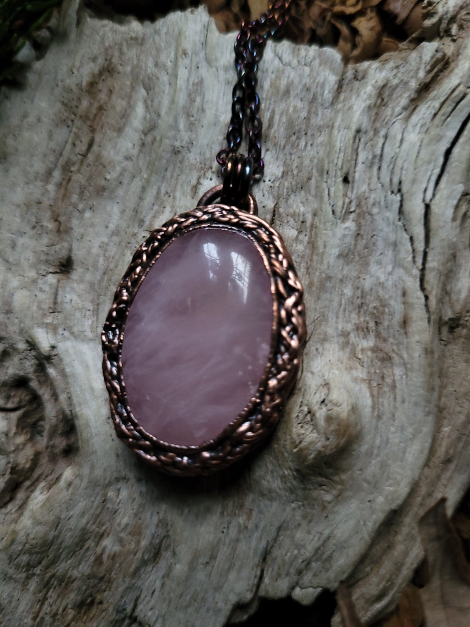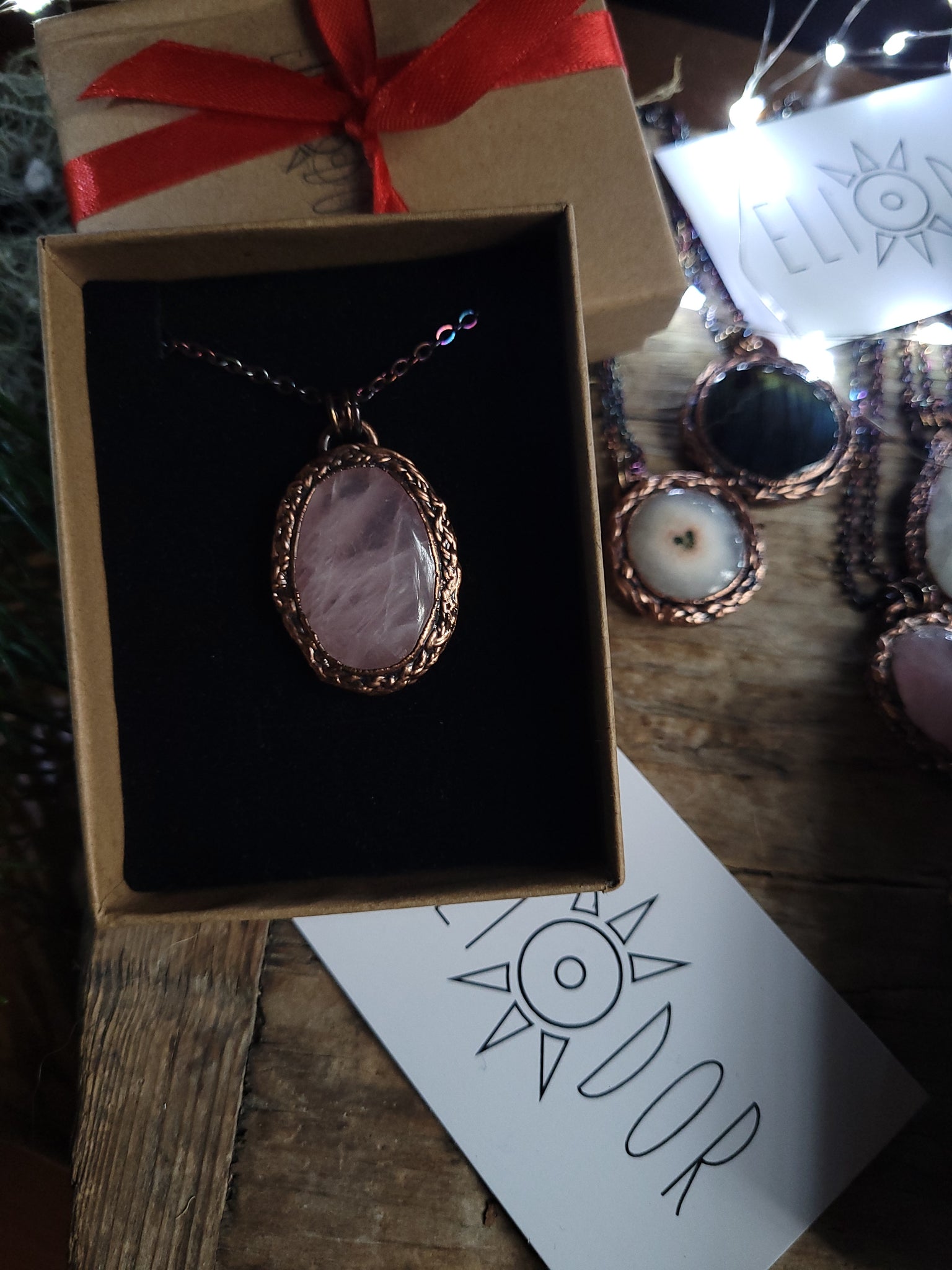 In questo Amuleto un bellissimo esemplare di Quarzo rosa è avvolto da una trama intessuta a mano e fissata per l' eternità dal robusto rivestimento in rame anticato.