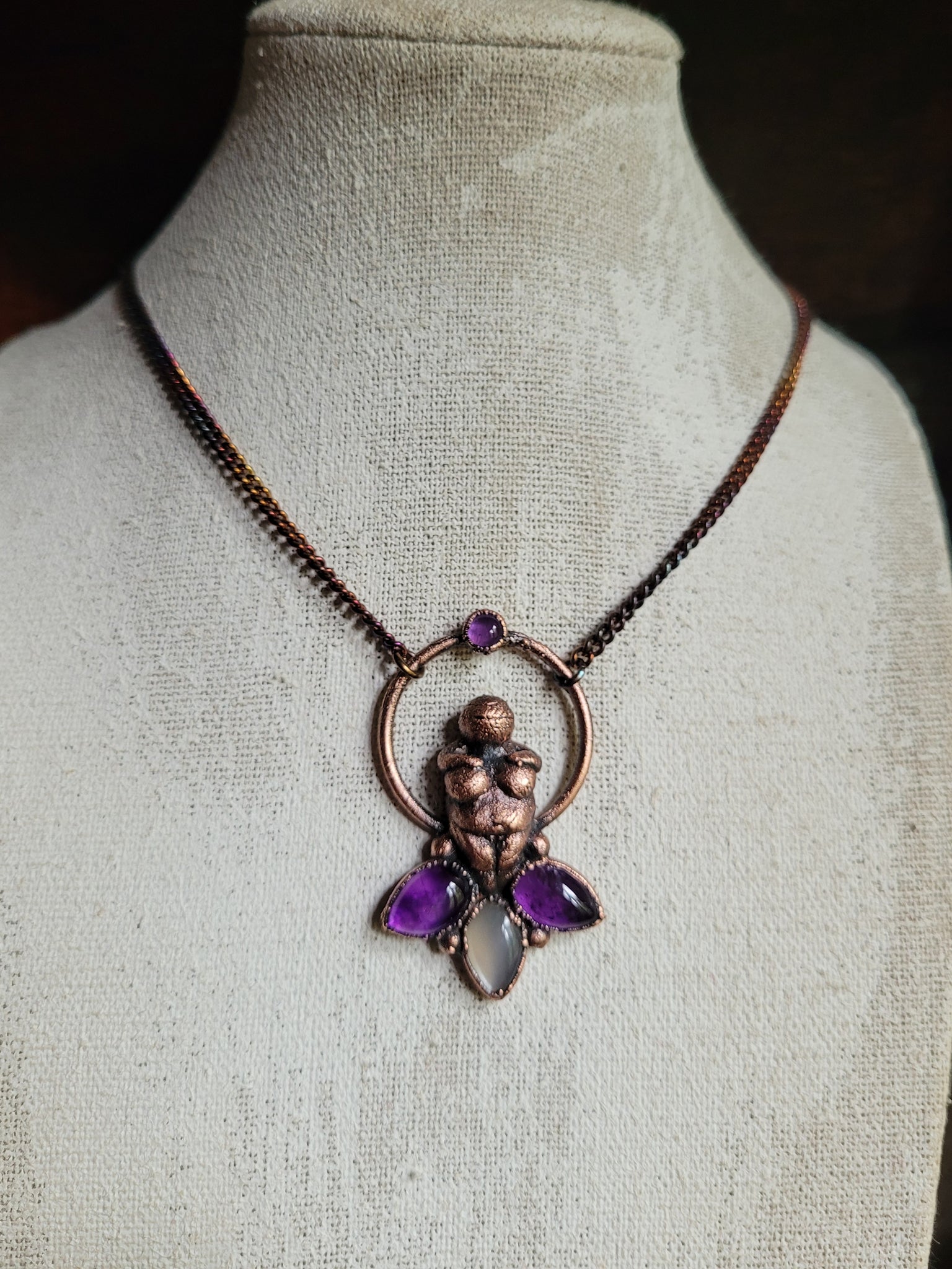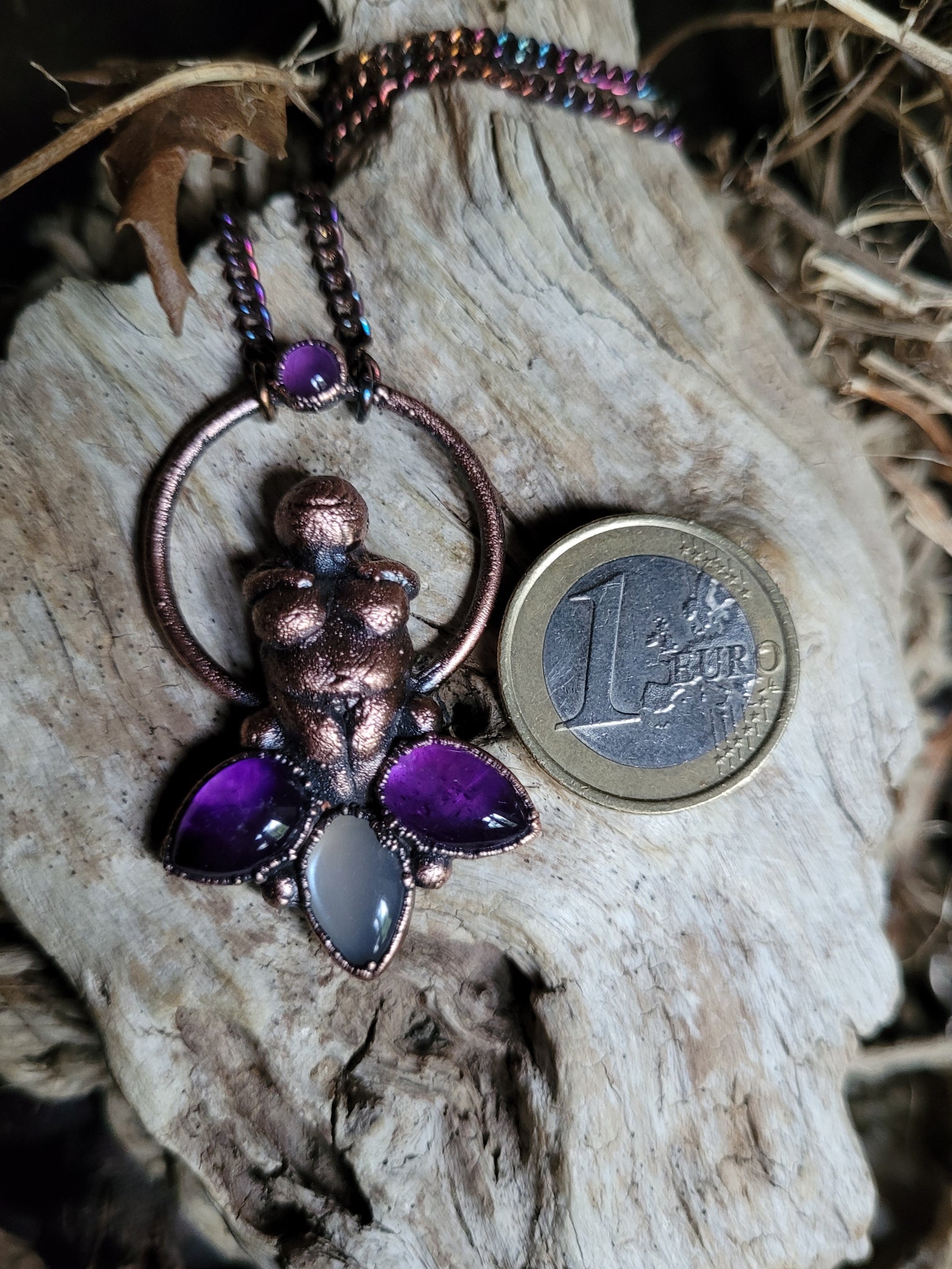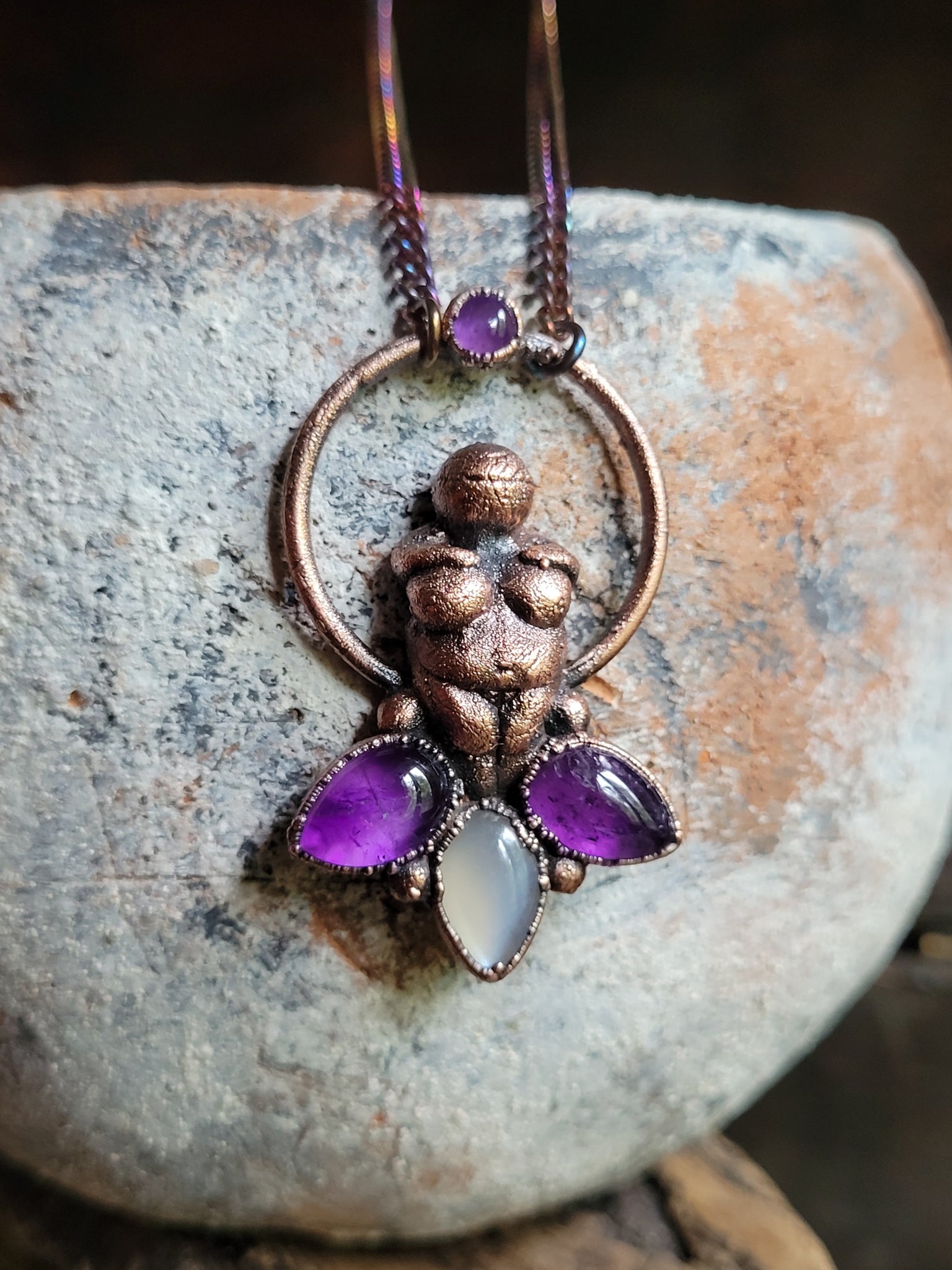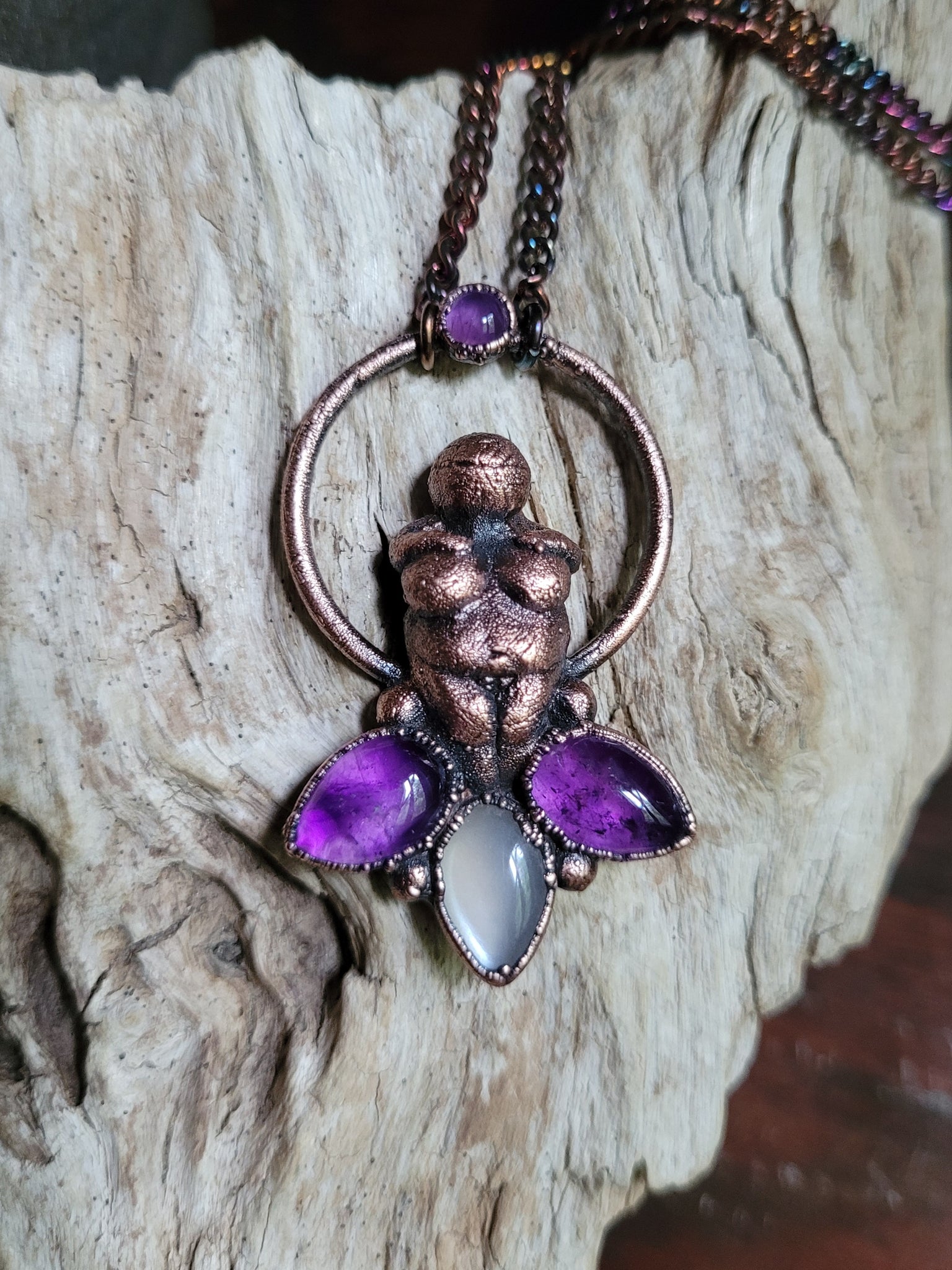 La Dea si erge maestosa sopra due petali di Ametista, pietre dal profondo viola che da sempre simboleggiano l'intuizione, la spiritualità e la calma interiore, accompagnate da un petalo di Adularia, la pietra di luna, che con i suoi riflessi perlescenti evoca il mistero, il potere femminile e la saggezza intuitiva.