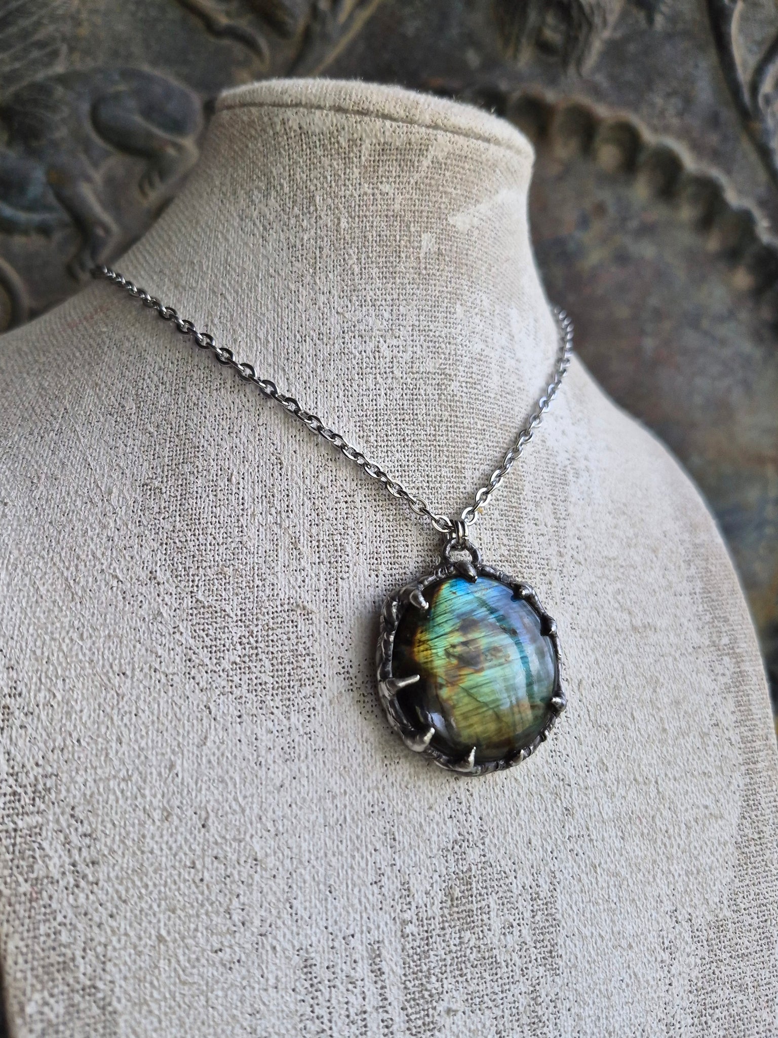 Per chi pratica la cristalloterapia o che sente il richiamo ancestrale della terra, questo pendente è un richiamo costante alla propria verità. La Labradorite è nota per la sua capacità di far emergere i ricordi dimenticati e di fortificare l'intuizione; unita alla solidità del peltro, diventa un talismano di radicamento e protezione.