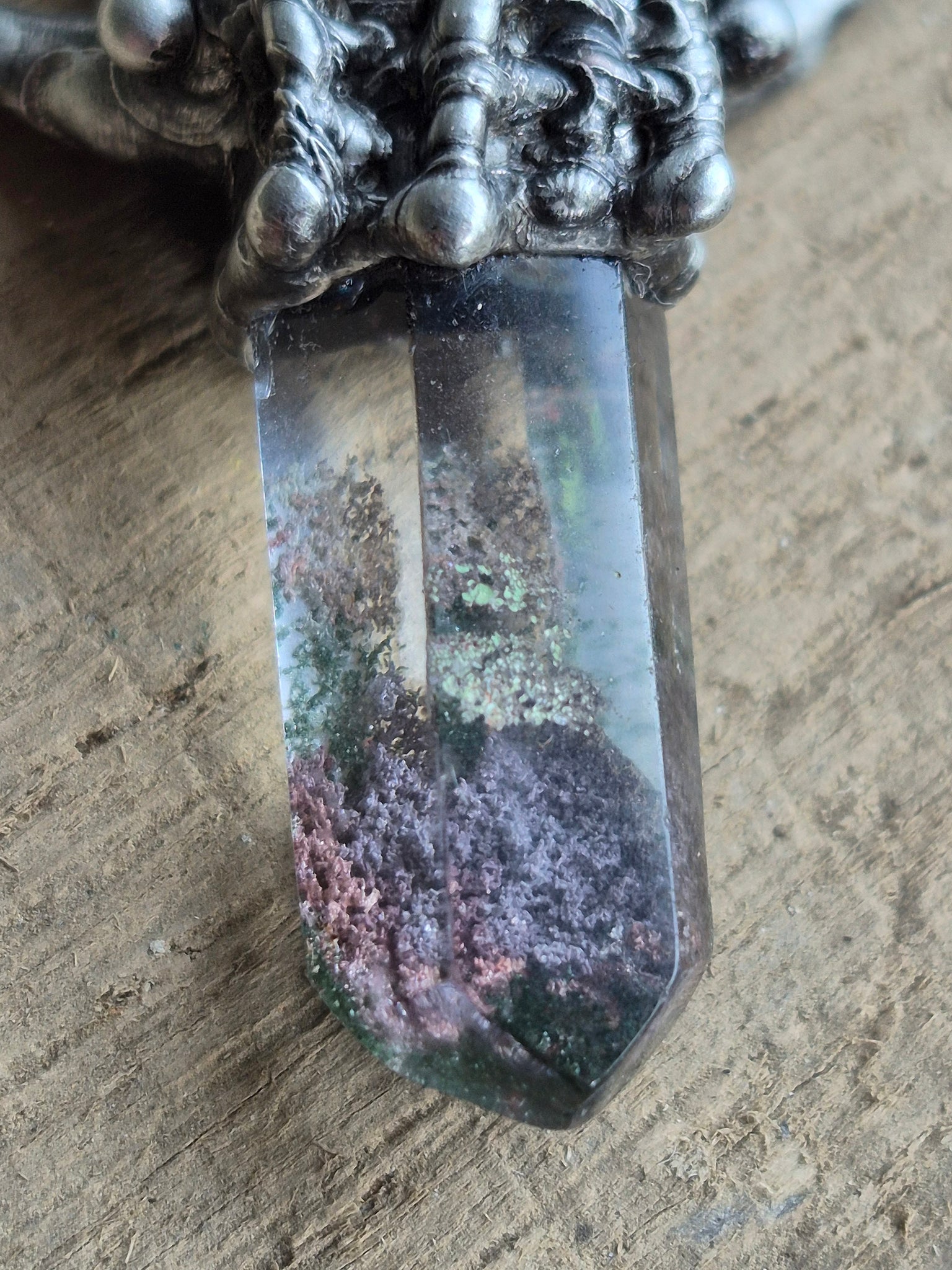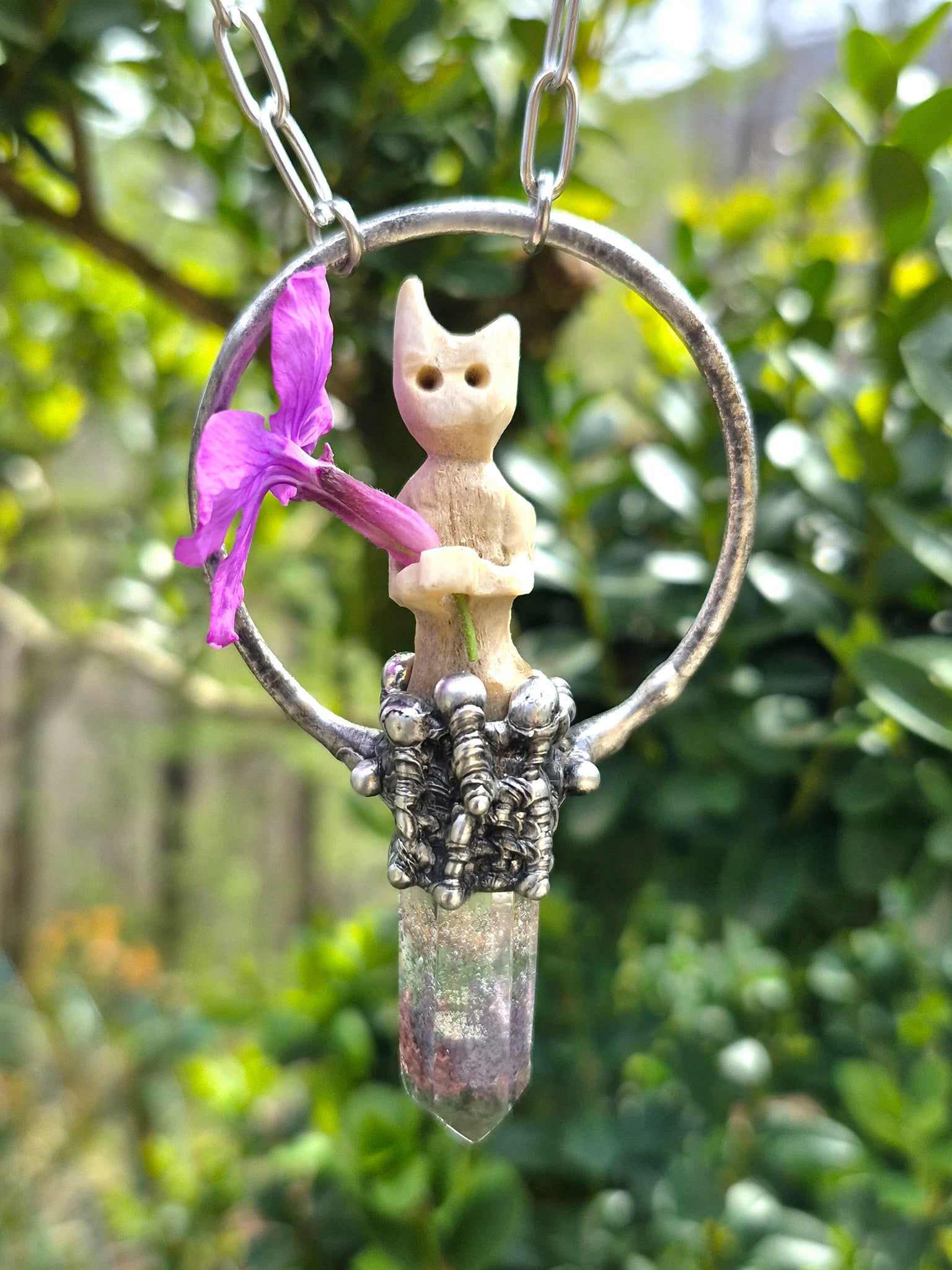 Al centro di questa creazione risiede un’anima antica: un essere del Piccolo Popolo, modellato con devozione artigianale da un palco di capriolo, testimone silenzioso dei cicli della foresta. Egli siede custode sopra un Quarzo Lodolite, la pietra "Giardino" che racchiude al suo interno paesaggi onirici e foreste sommerse, offrendo una profondità che sembra respirare.