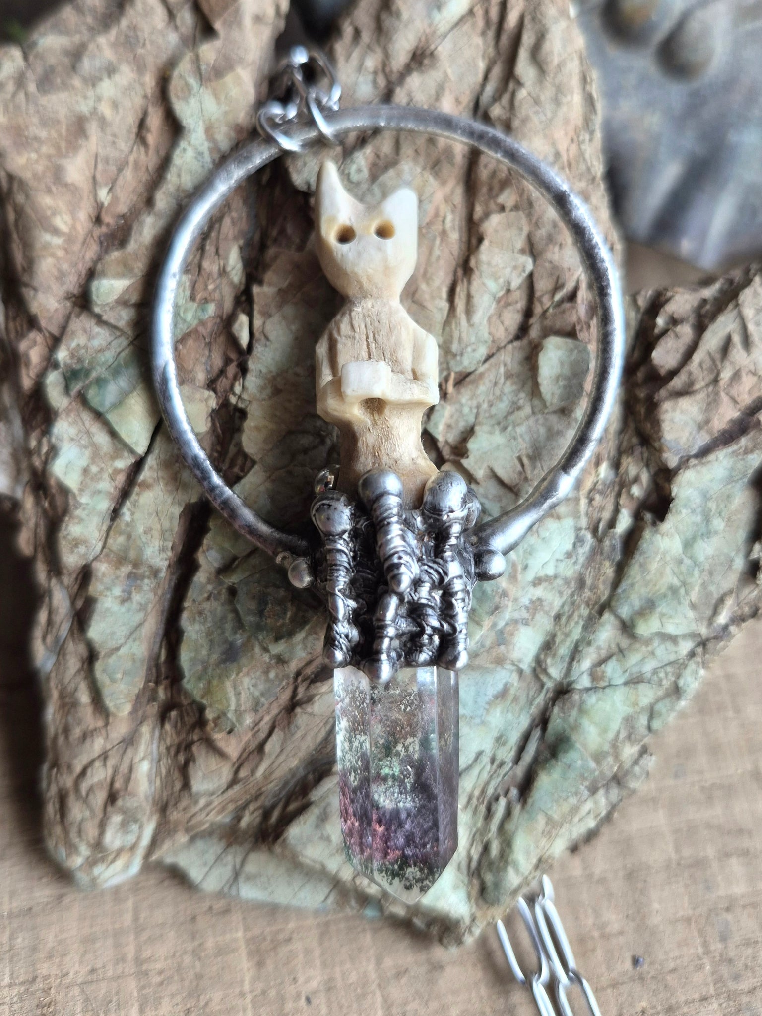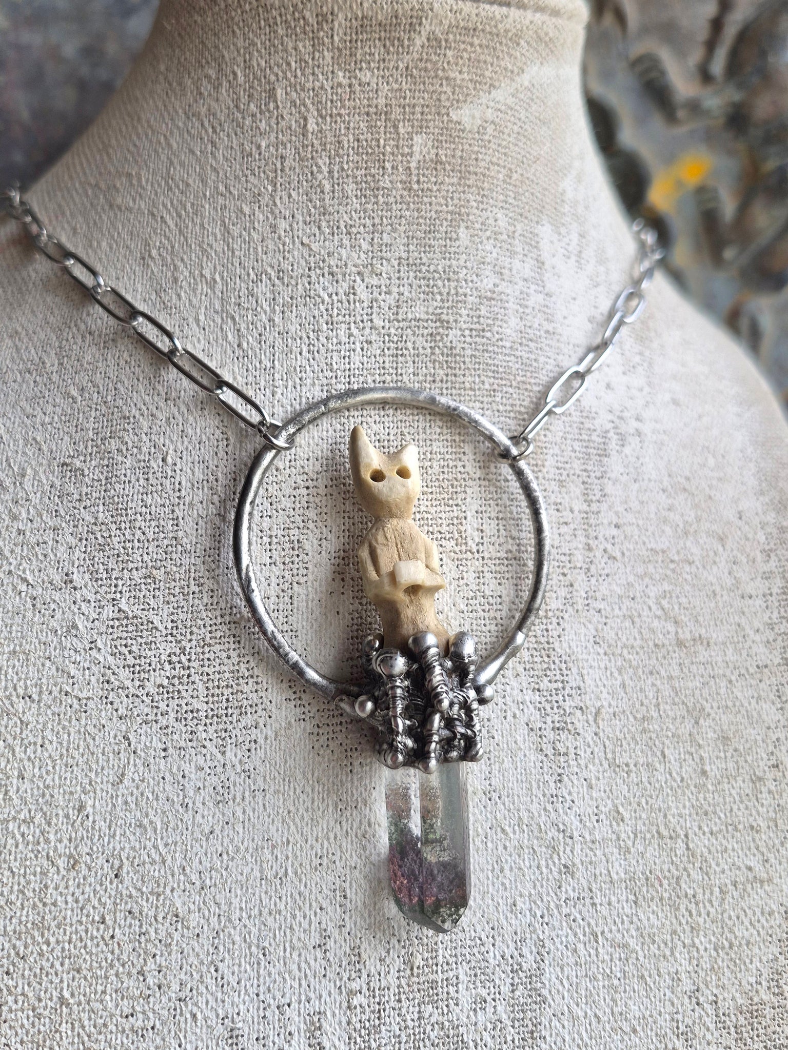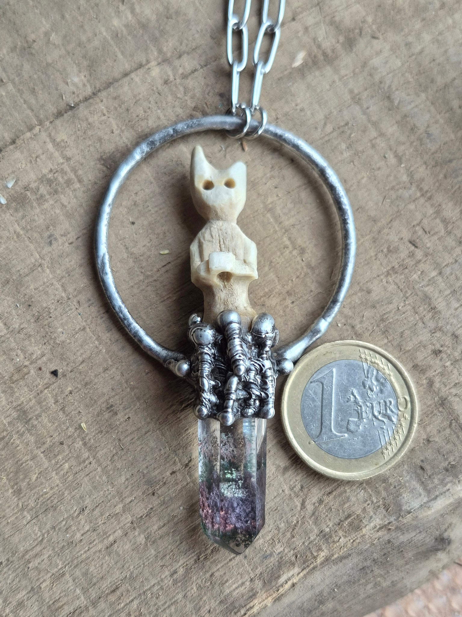 - Materiali: Palco di capriolo (reperito eticamente), Quarzo Lodolite naturale.