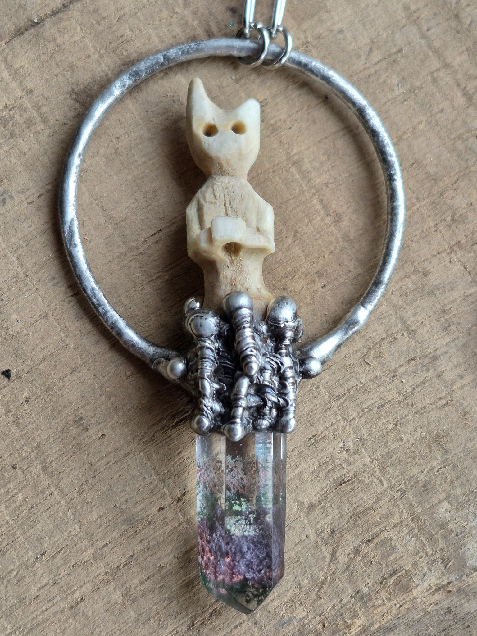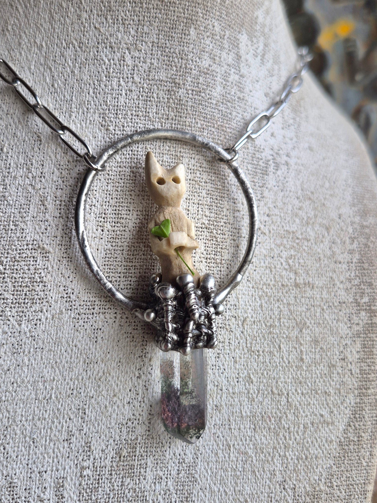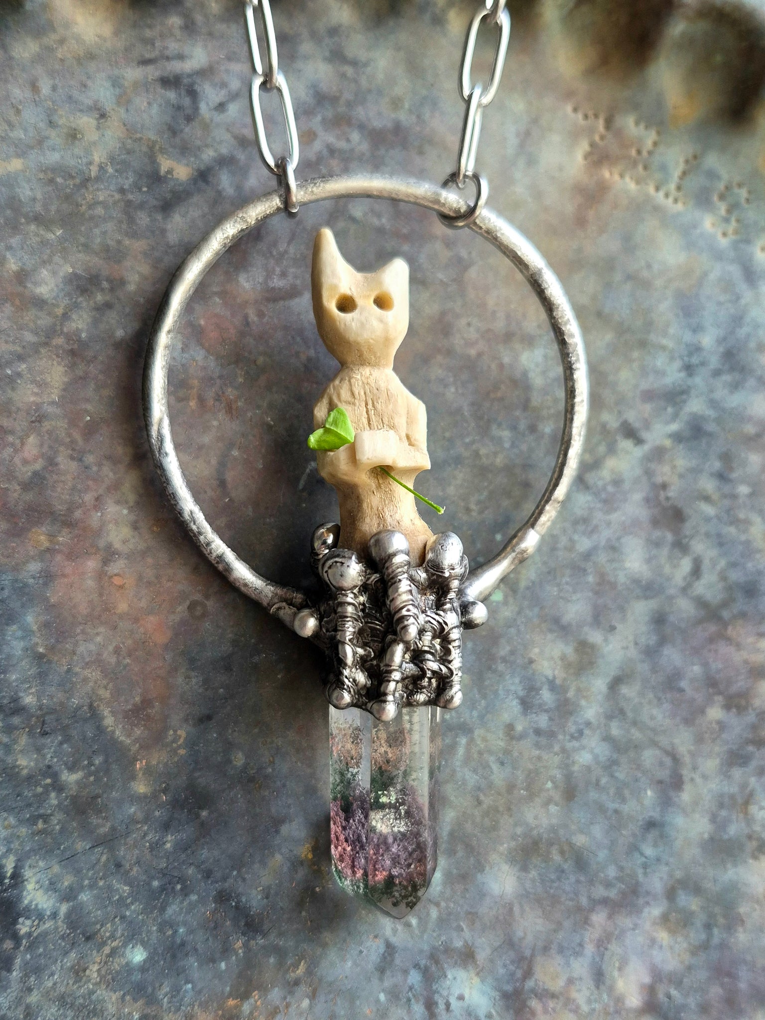 - Materiali: Palco di capriolo (reperito eticamente), Quarzo Lodolite naturale.