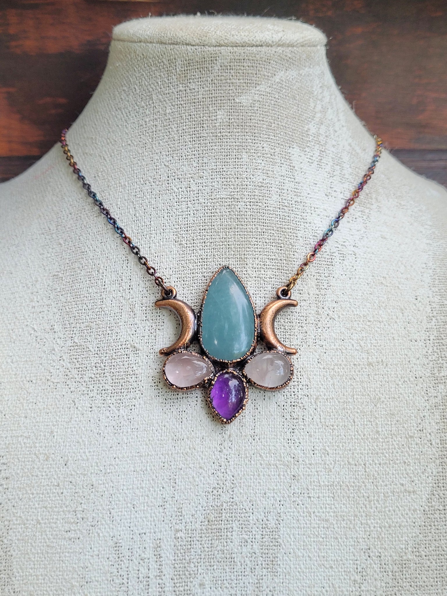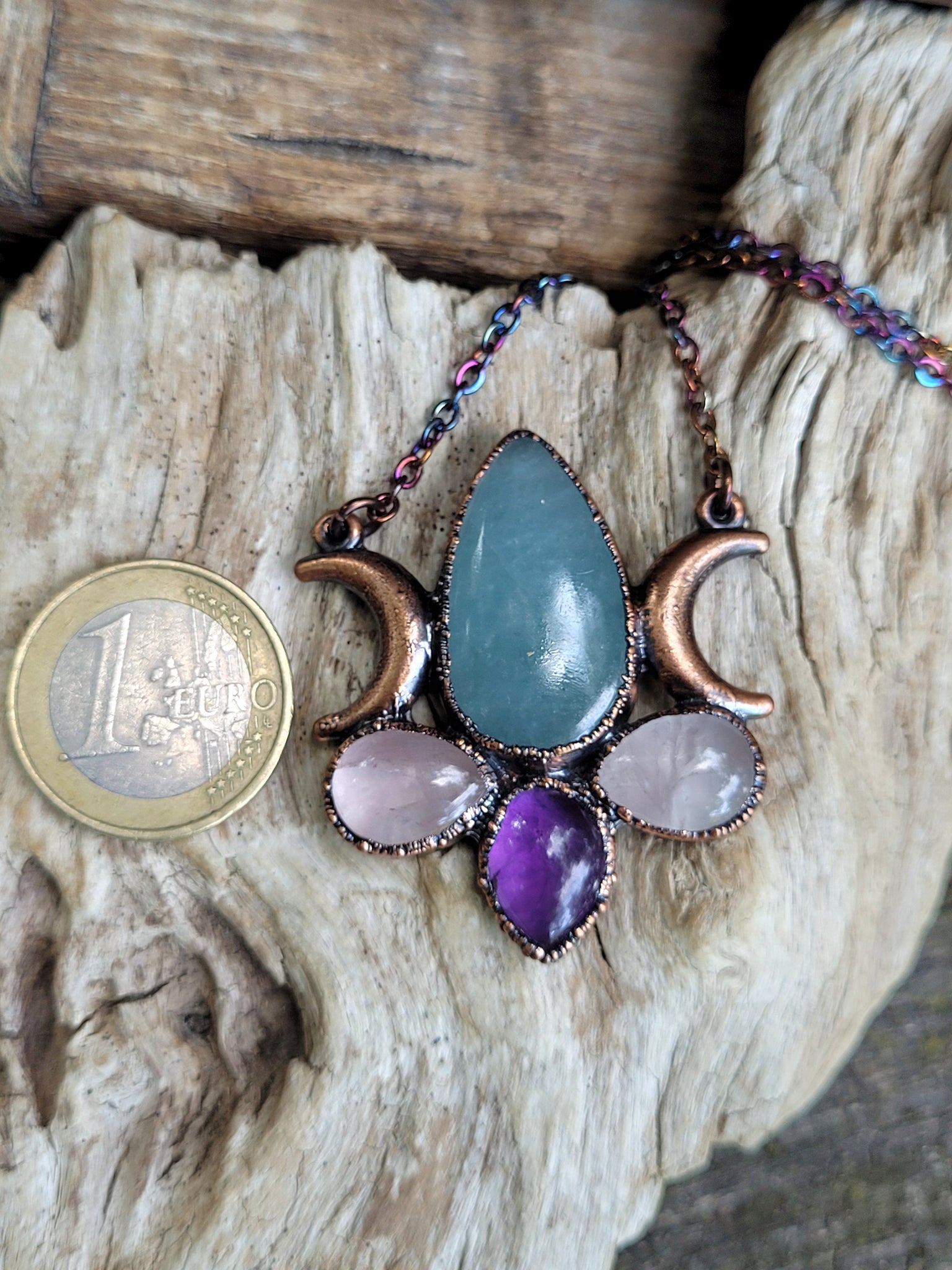 Il pendente è custodito da falci di luna, un simbolo antico che evoca il potere dell'intuizione e la ciclicità delle emozioni.