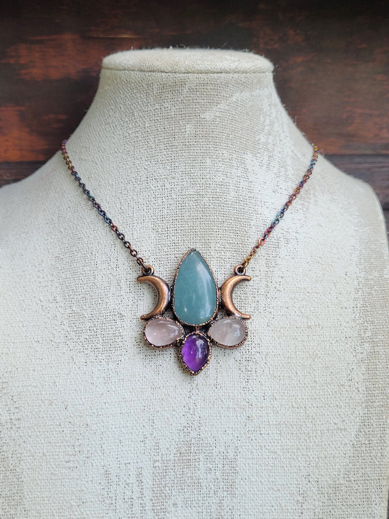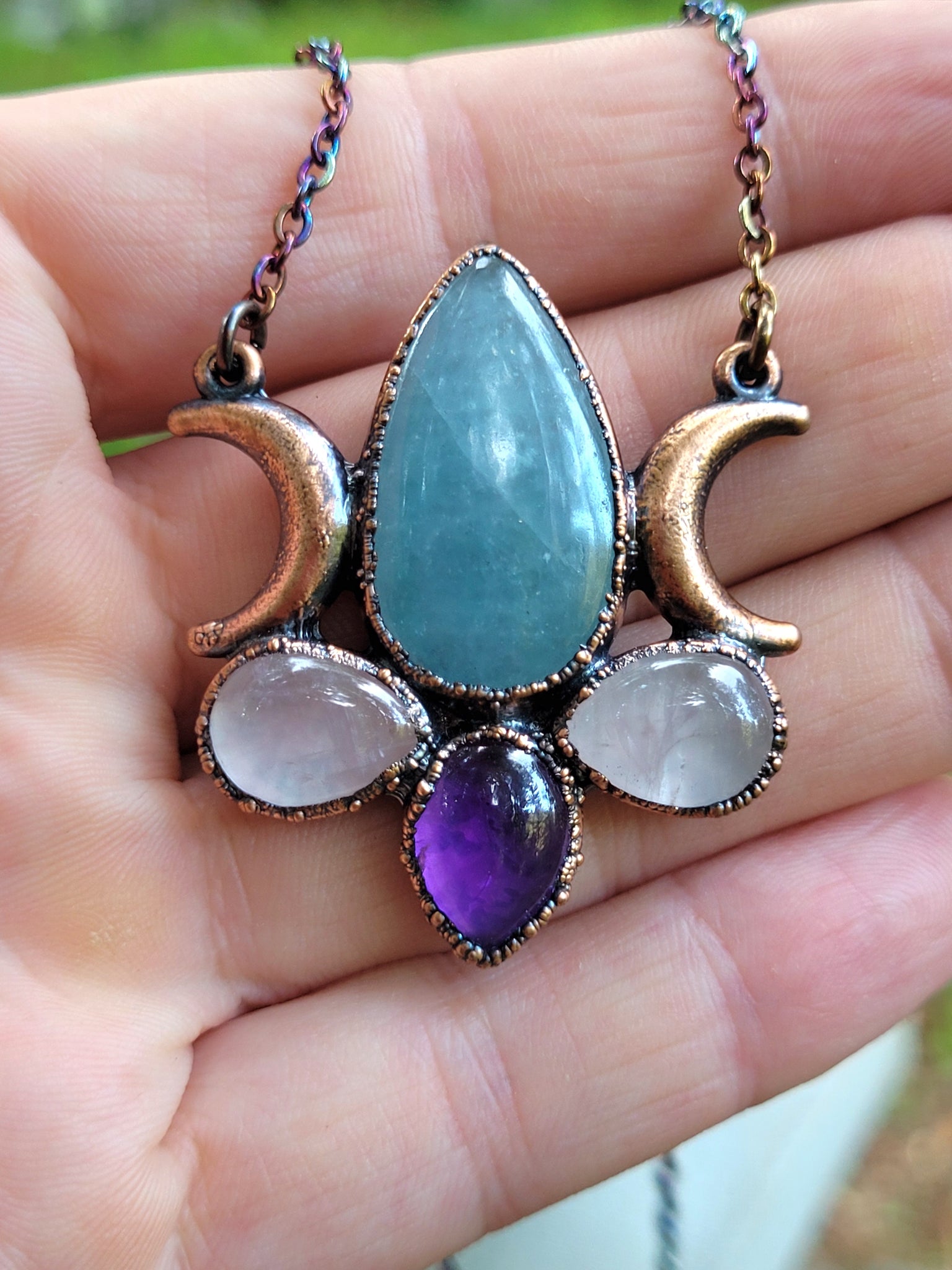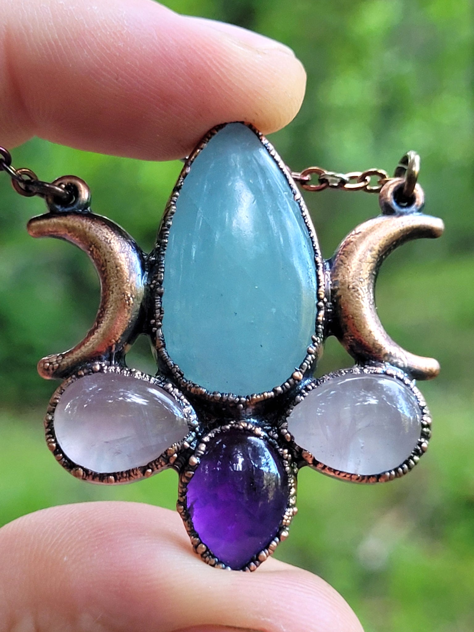 Al suo interno, tre cristalli si fondono in un'armonia perfetta: la calma profonda dell'Acquamarina, la dolcezza del Quarzo Rosa, che risuona con il battito del cuore, e la serenità dell'Ametista.