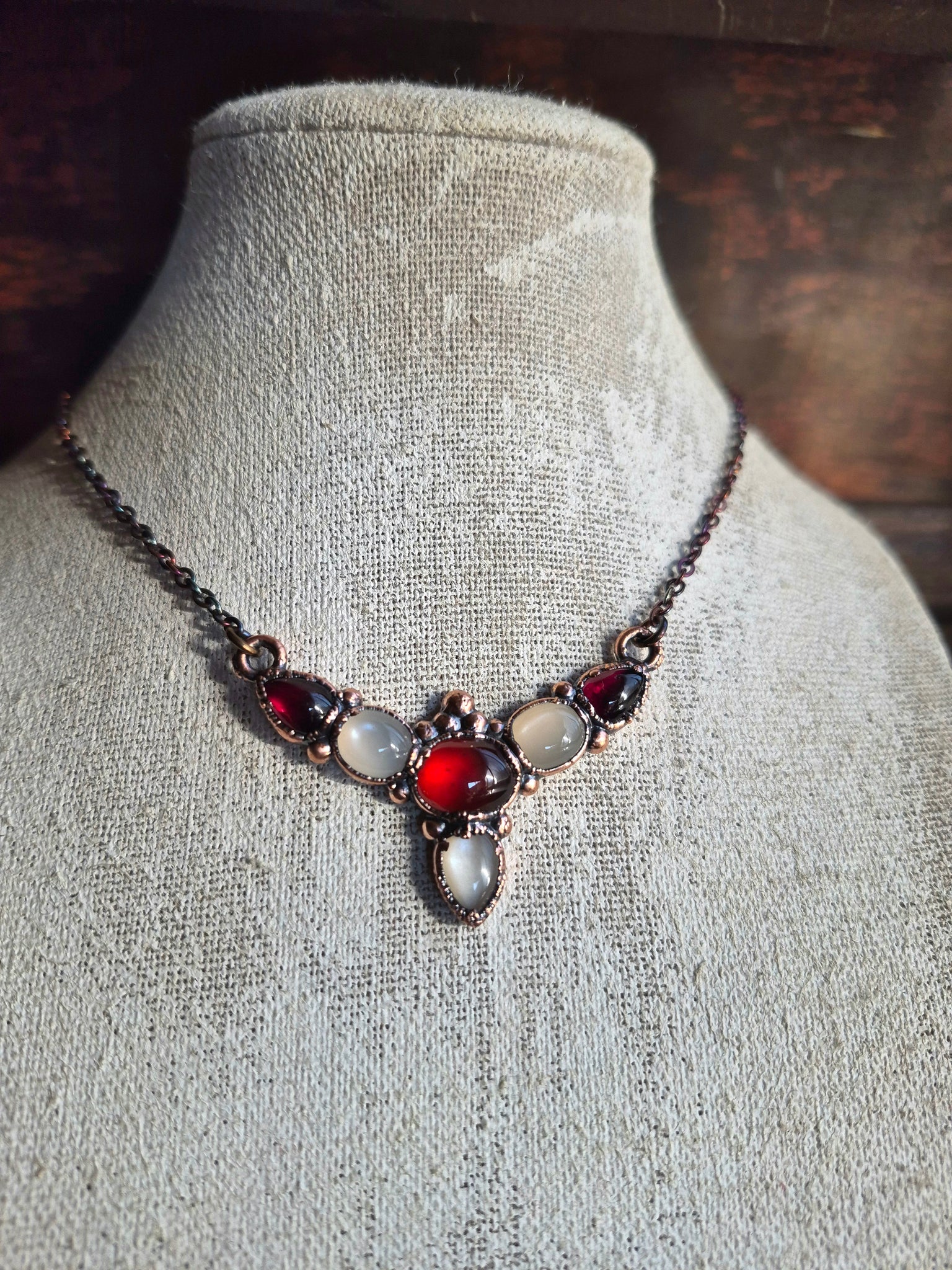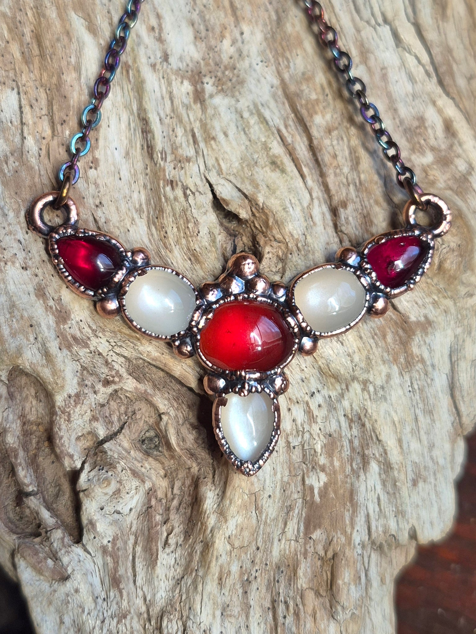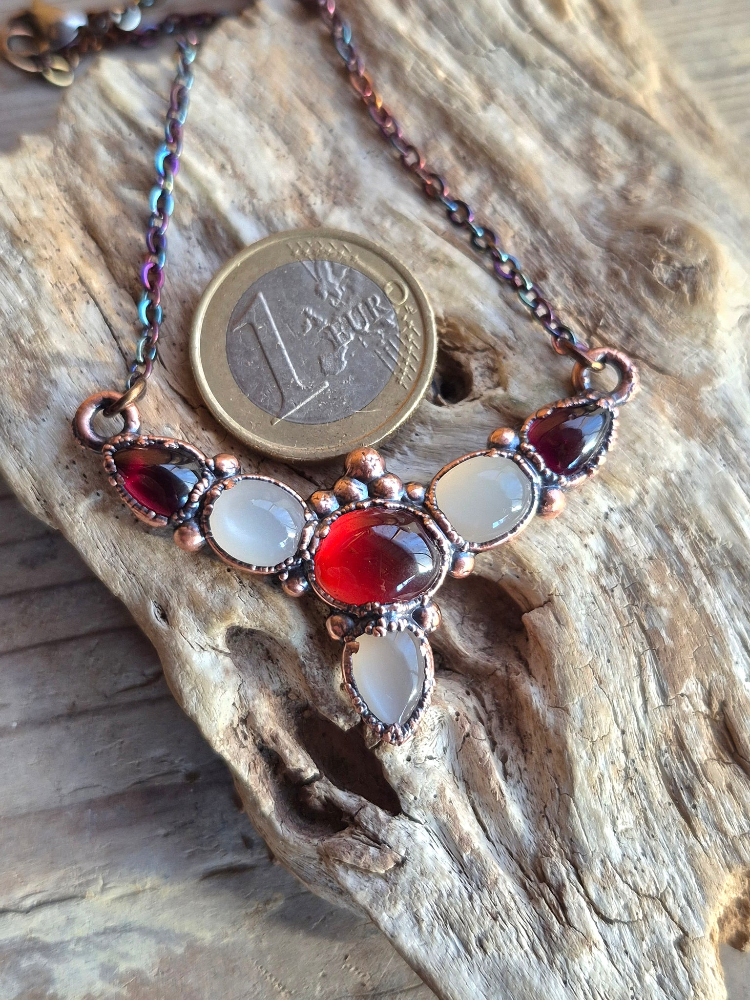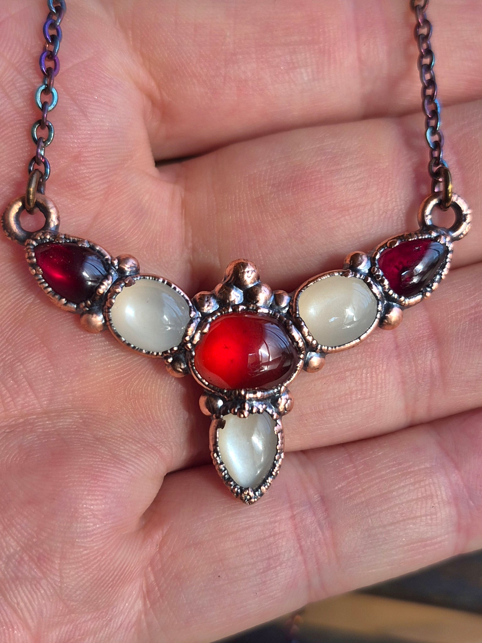 Pietre: Adularia (Pietra di Luna) di prima scelta, Hessonite aranciata, Granato rosso profondo.