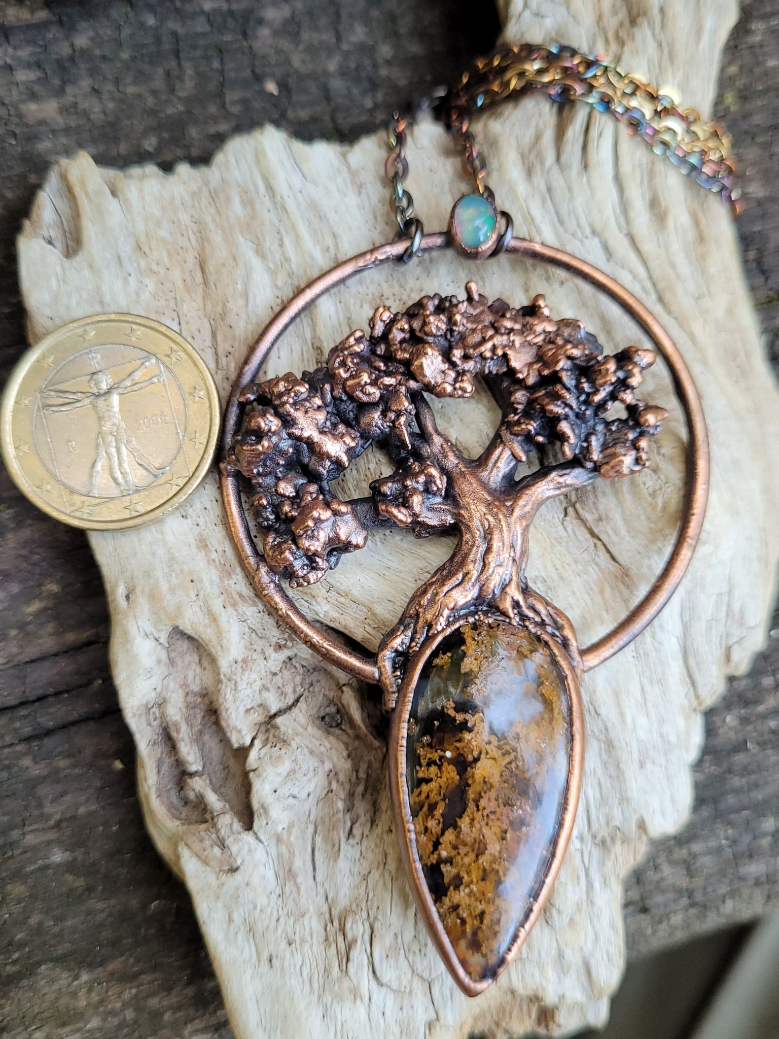 La figura della Quercia è realizzata completamente a mano, il rame di cui è composto il monile è trattato con una patina anticante per un aspetto magico e fuori dal tempo,  viene fornito con una catenina in acciaio policromo di 45 centimetri