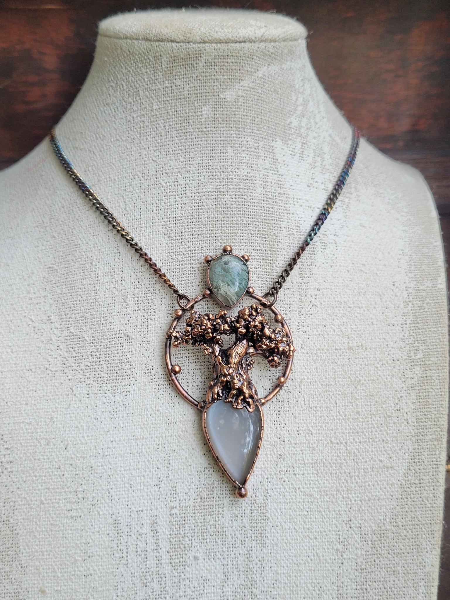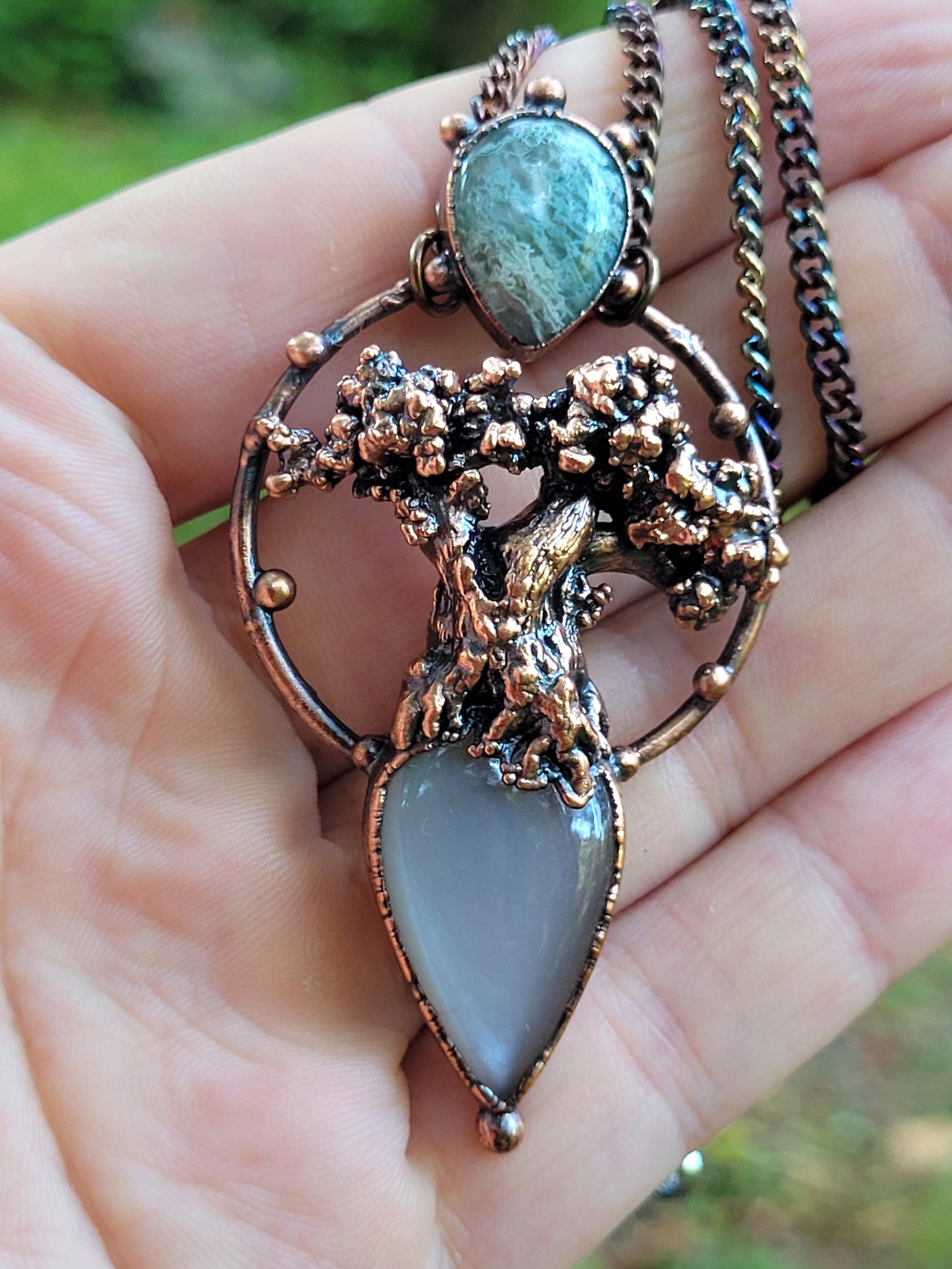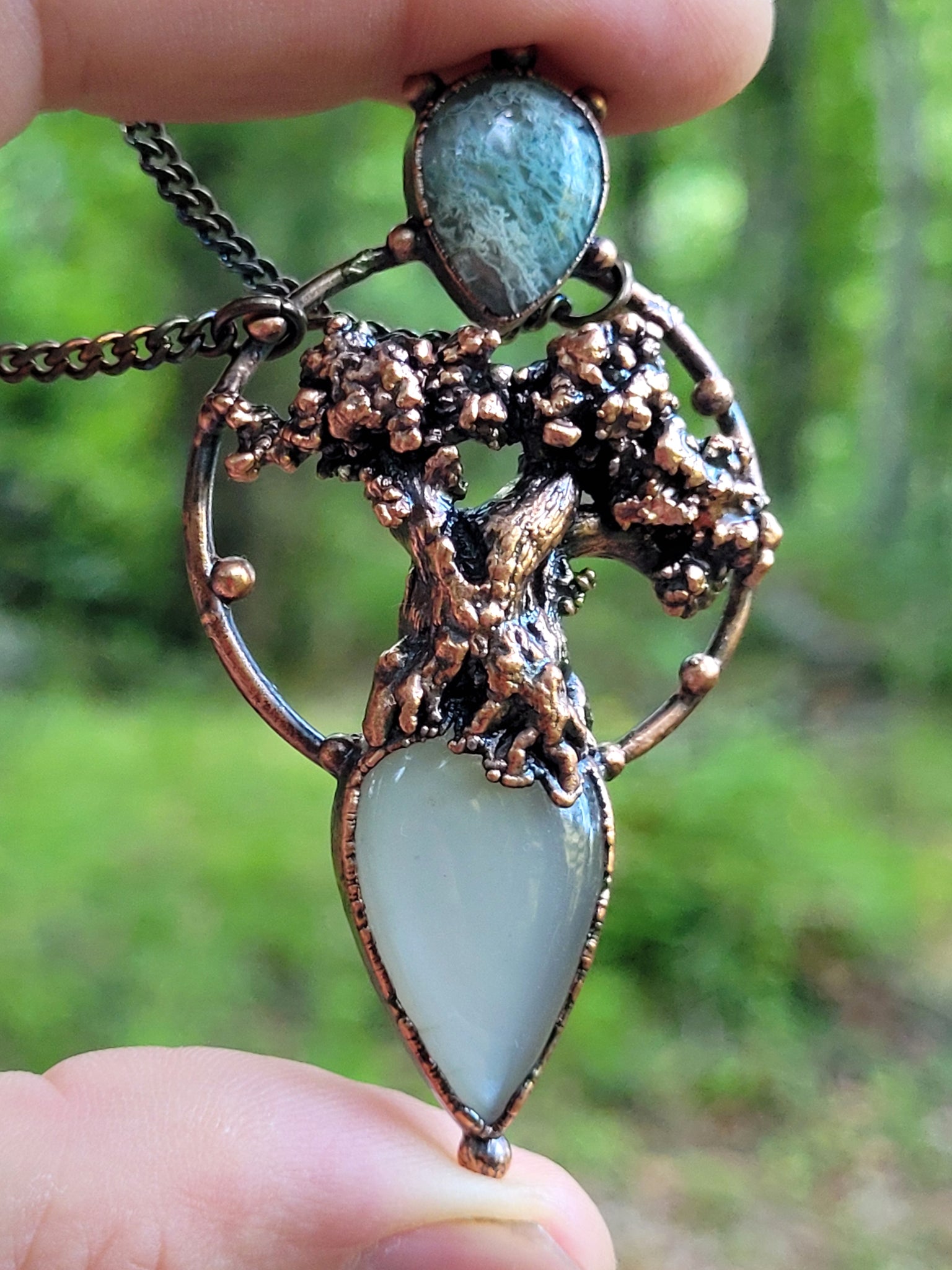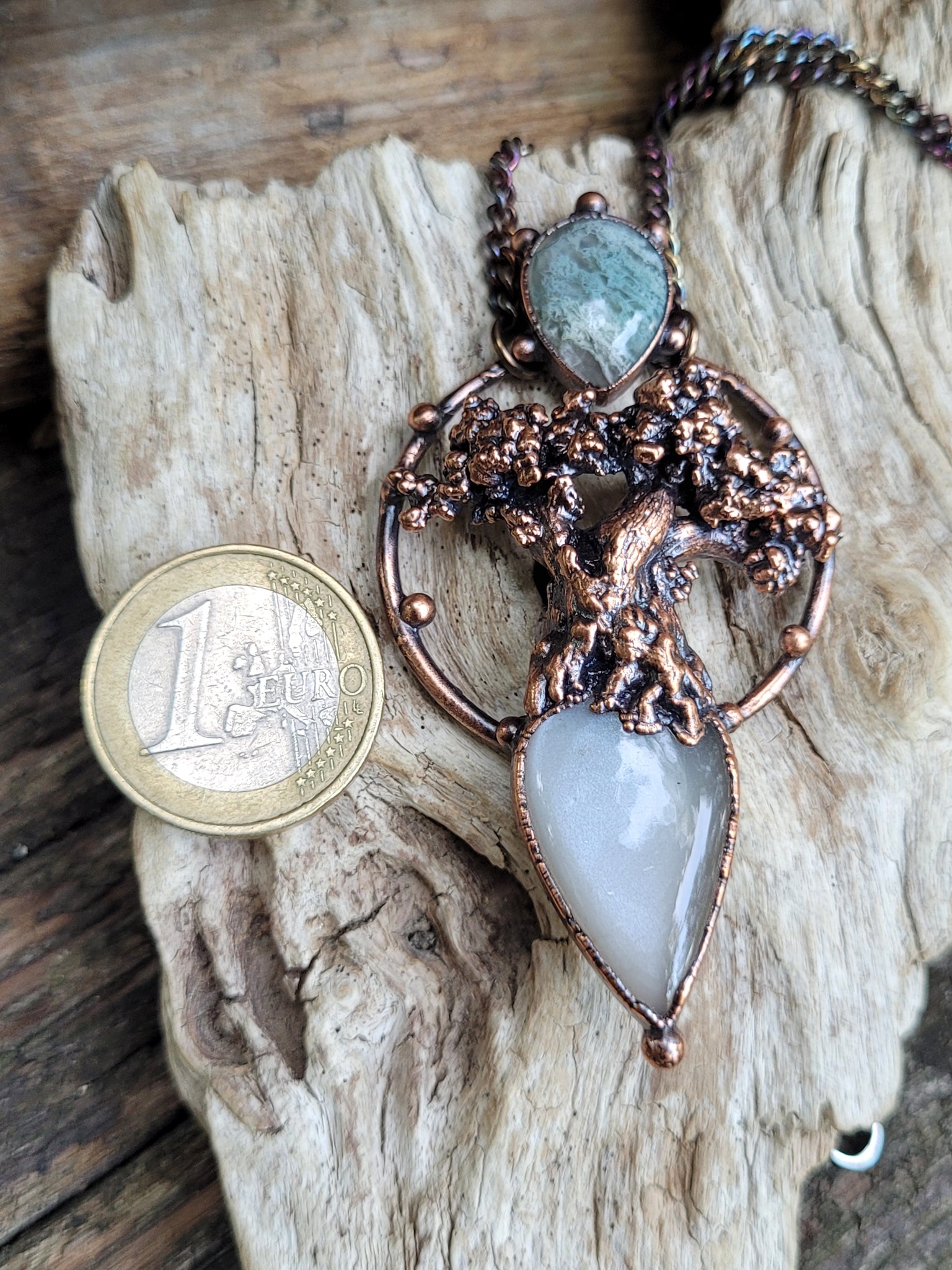 La figura dell'ulivo è realizzata completamente a mano, il rame di cui è composto il monile è trattato con una patina anticante per un aspetto magico e fuori dal tempo,  viene fornito con una catenina in acciaio policromo di 45 centimetri