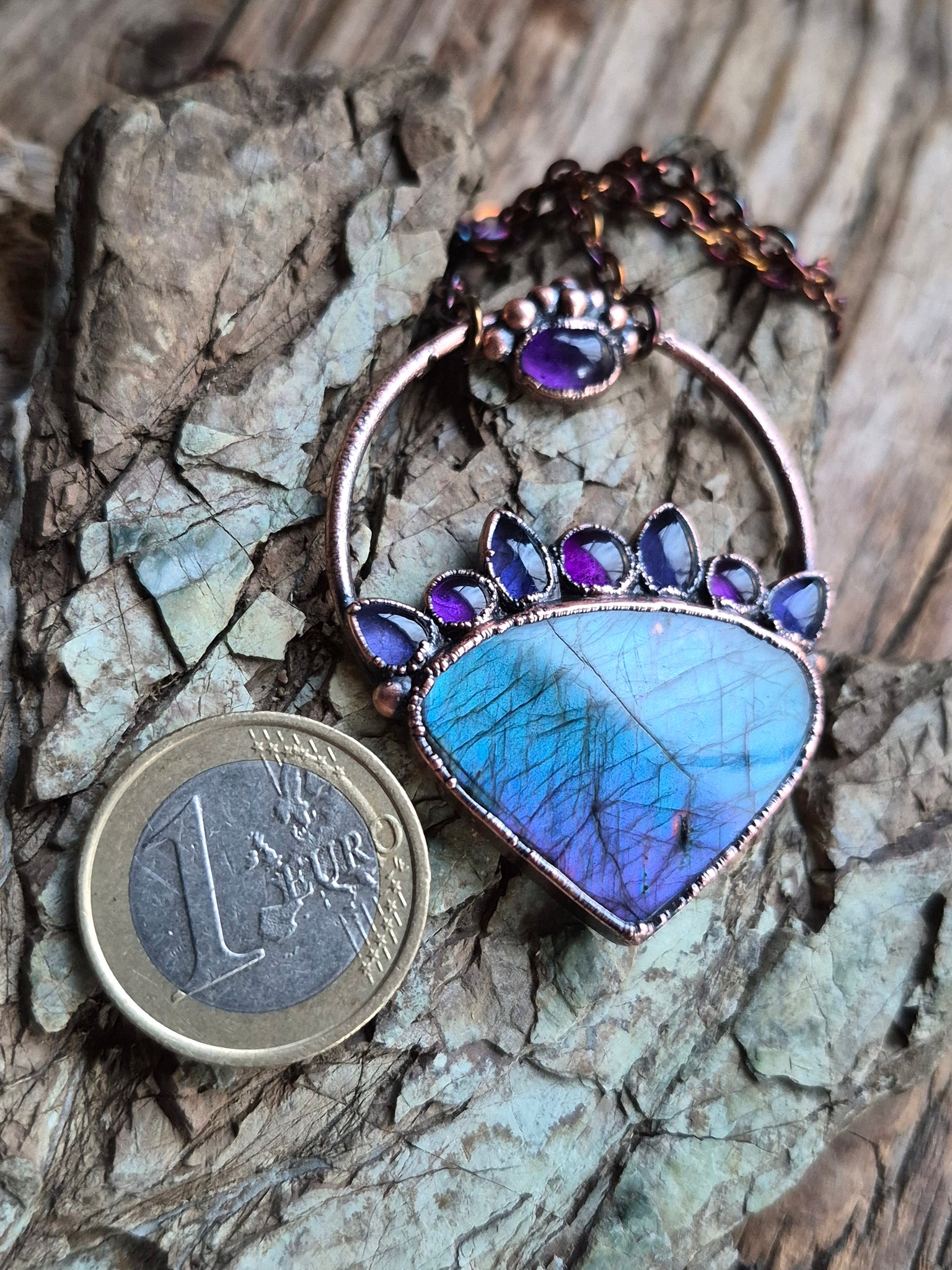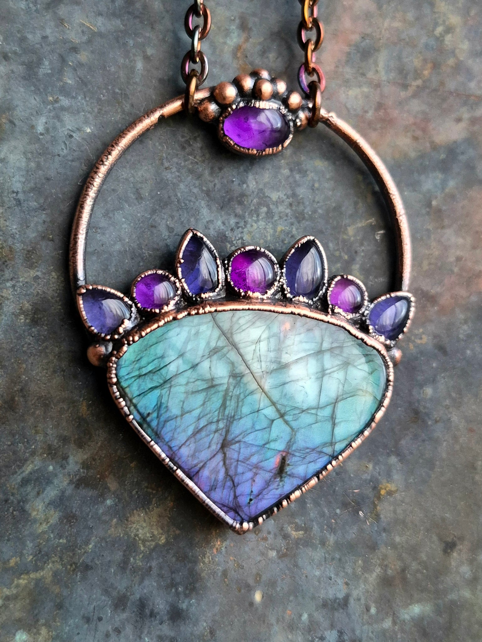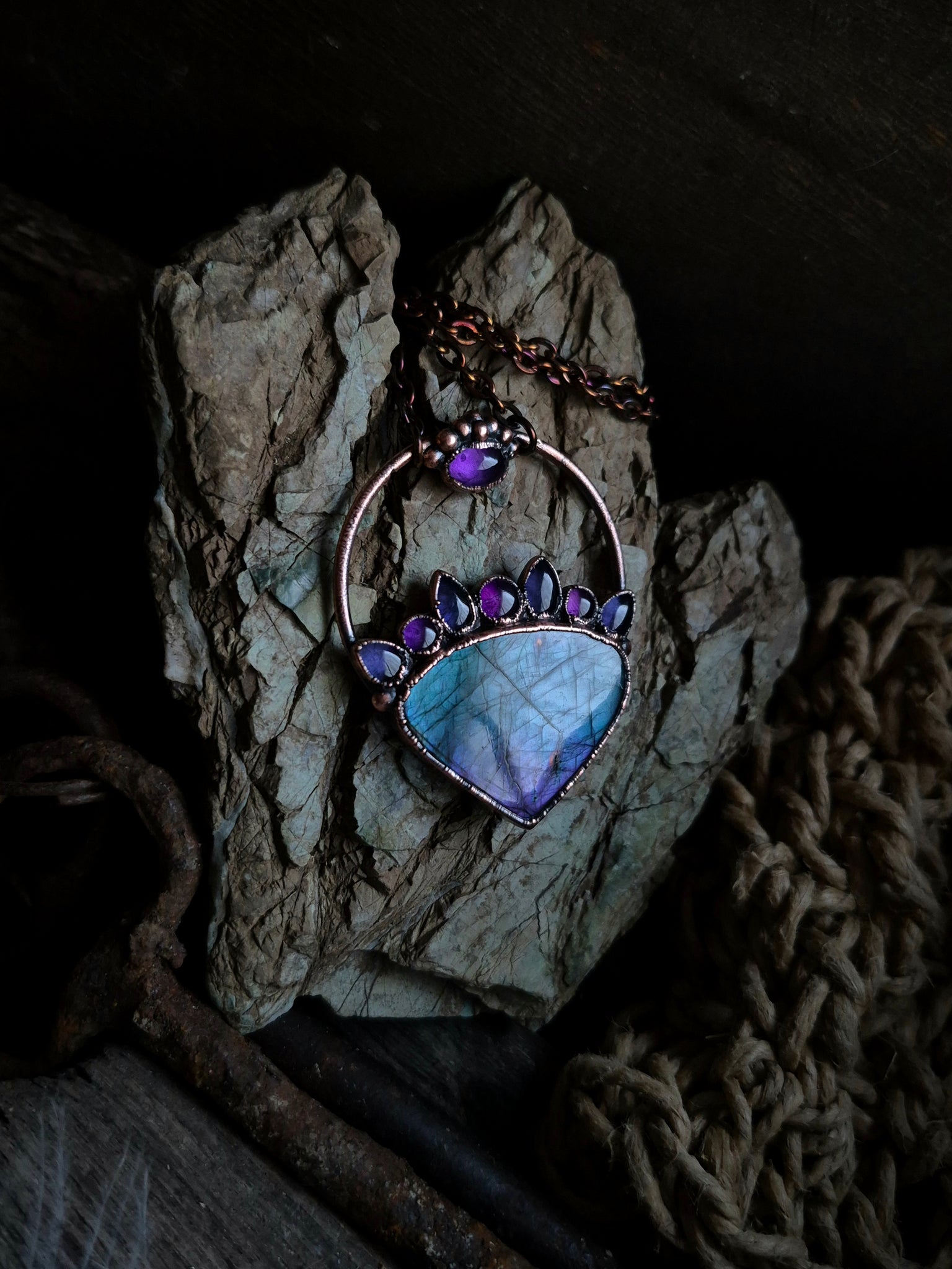 Oltre la luce dei cristalli, l'anima di questo gioiello risiede nella sua struttura in Rame, metallo conduttore per eccellenza, qui sublimato da una patina anticante stesa a mano.