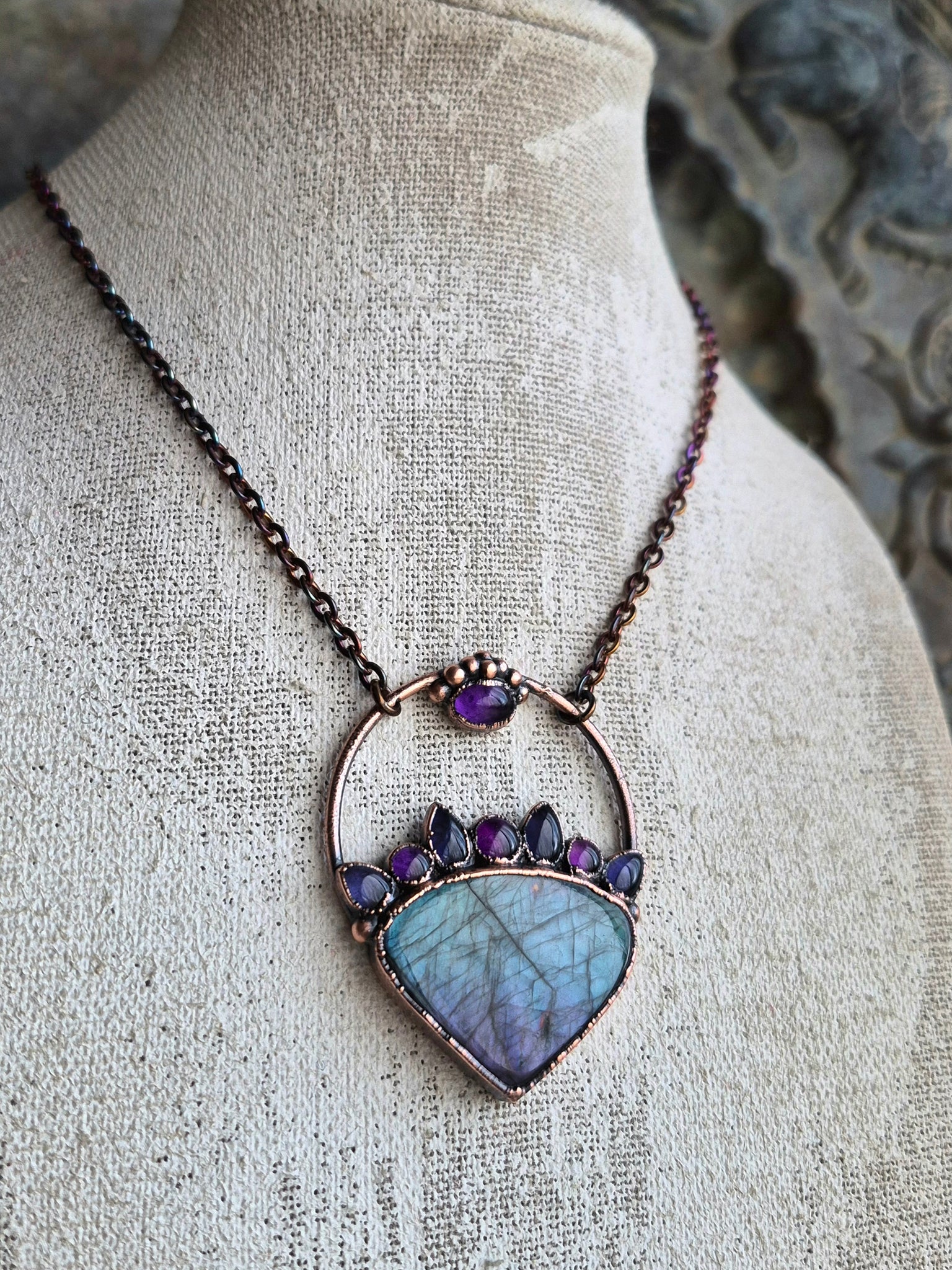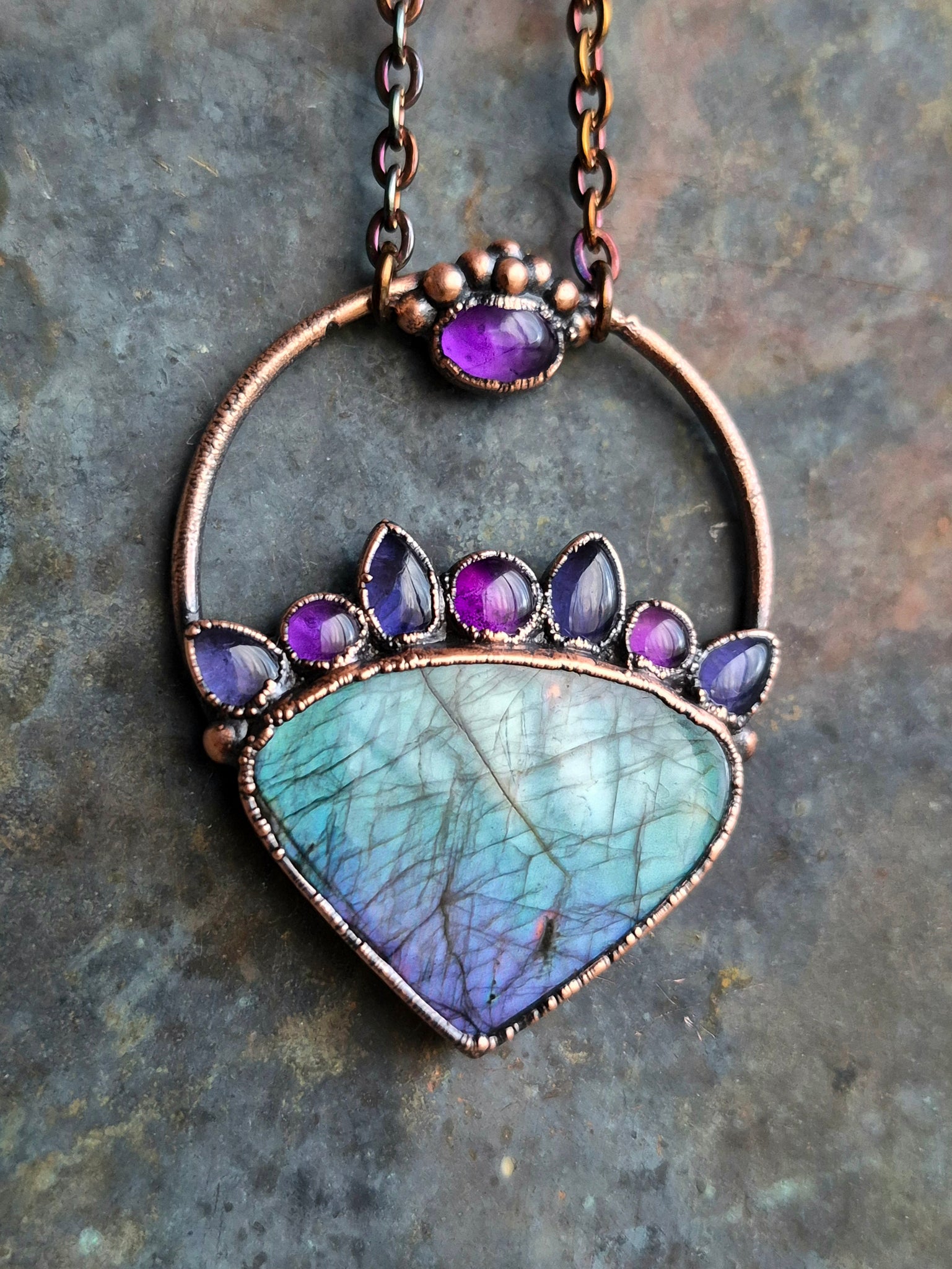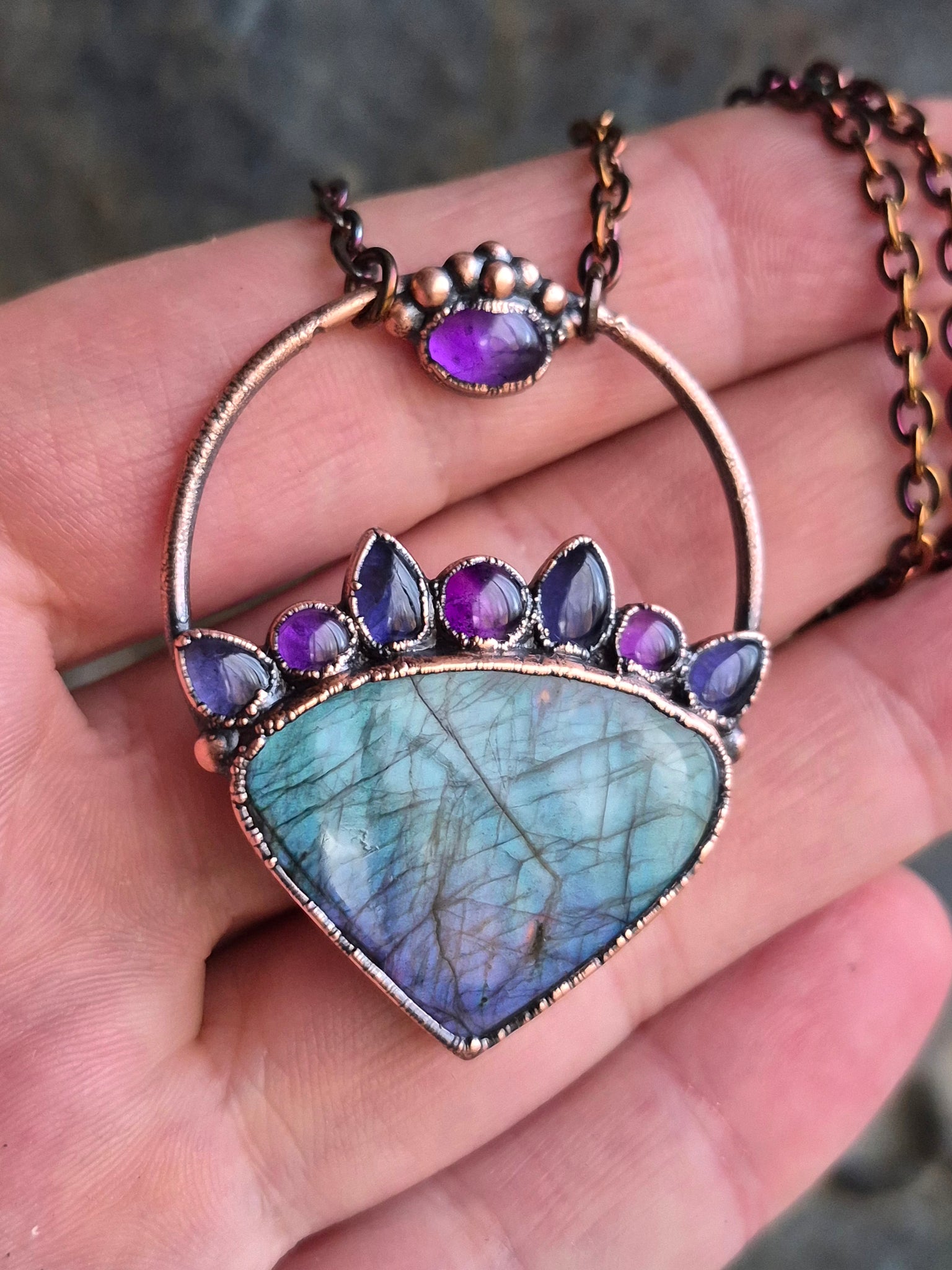 Oltre la luce dei cristalli, l'anima di questo gioiello risiede nella sua struttura in Rame, metallo conduttore per eccellenza, qui sublimato da una patina anticante stesa a mano.