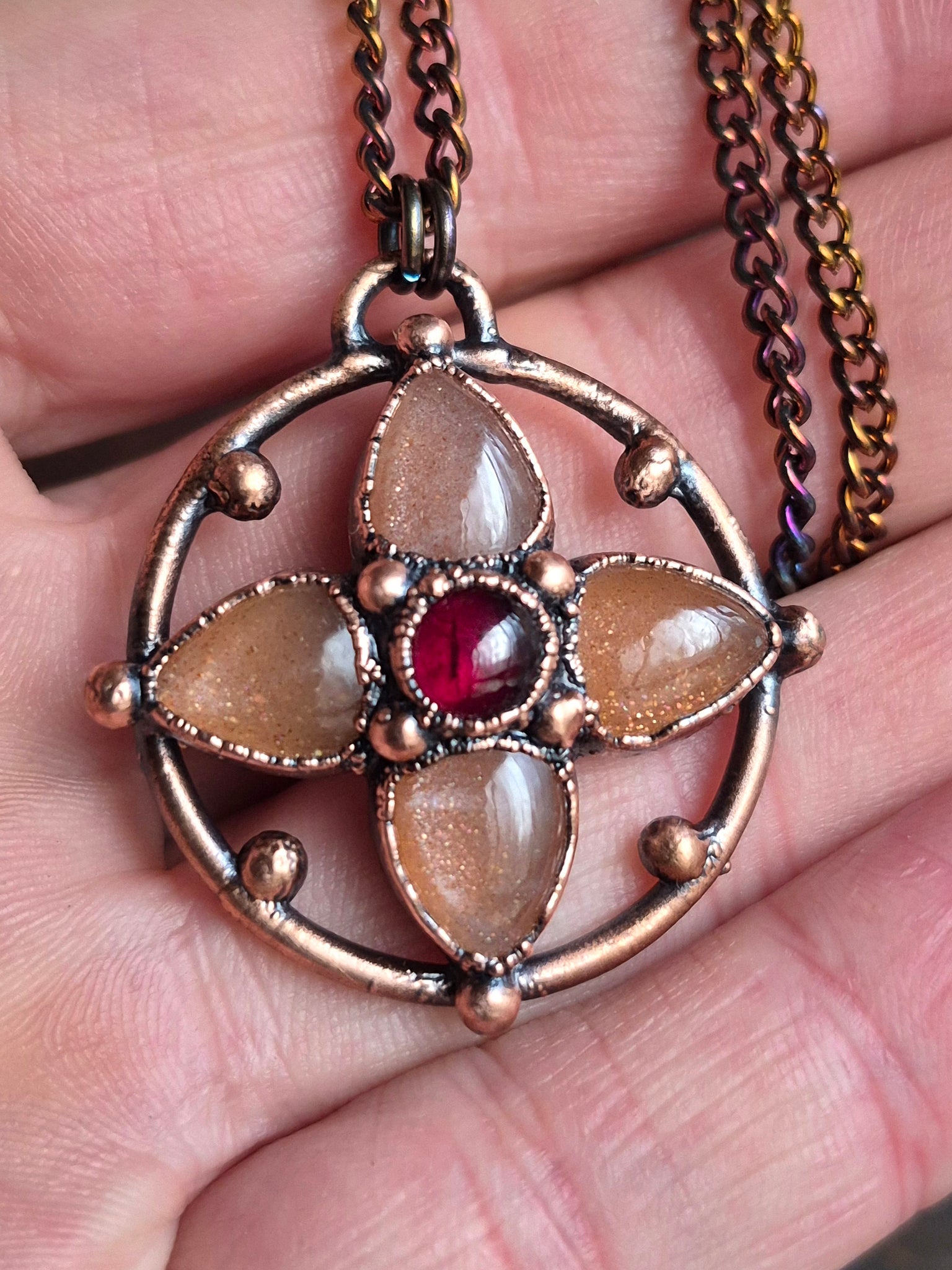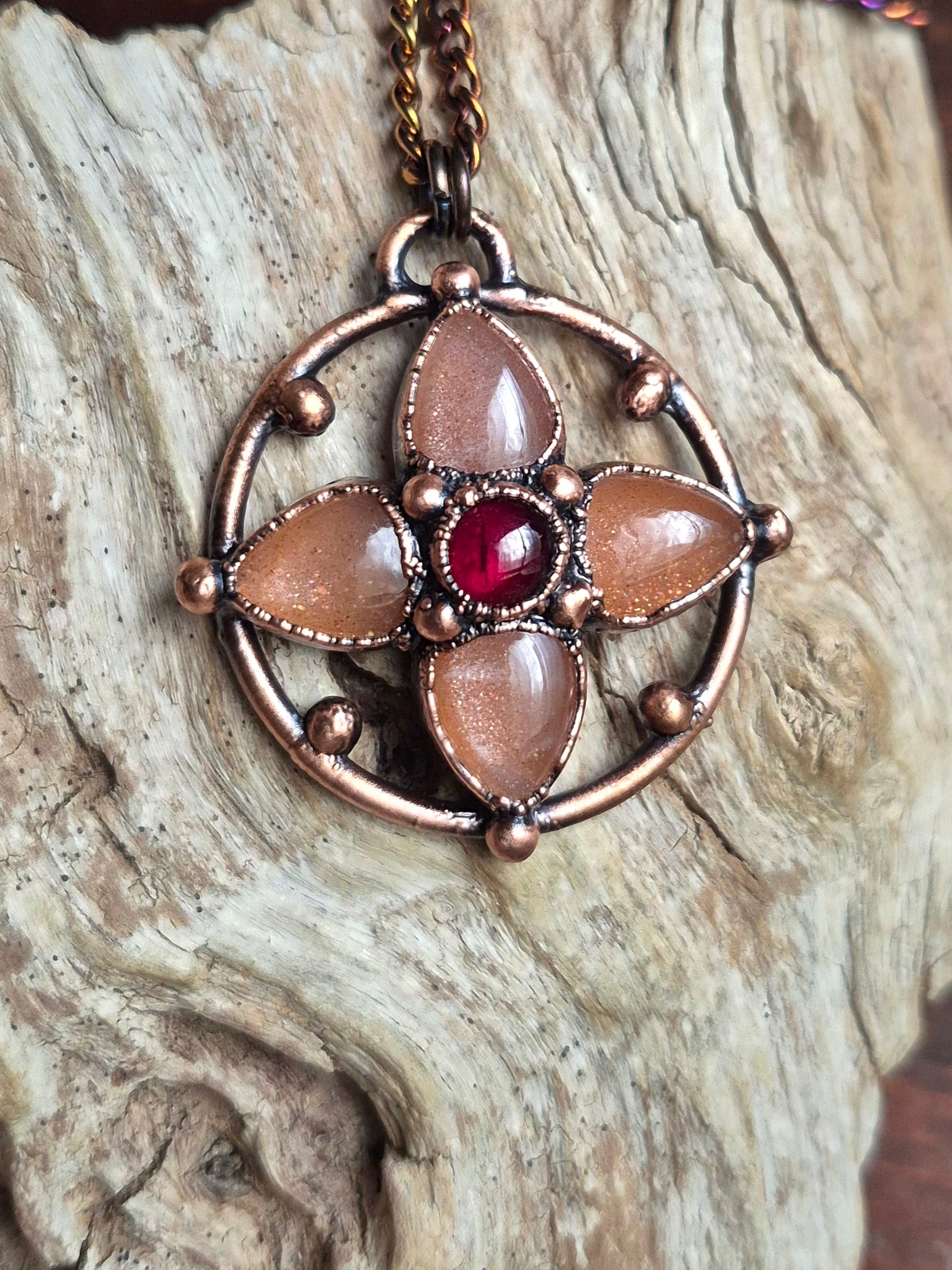 Il Granato al centro, pietra di un profondo e vibrante rosso, stimola la forza di volontà, l'energia vitale e la passione. Collegato ai chakra inferiori, amplifica il coraggio e la determinazione, bilanciando la dolcezza emotiva e l'introspezione promosse dai petali di Adularia Pesca.