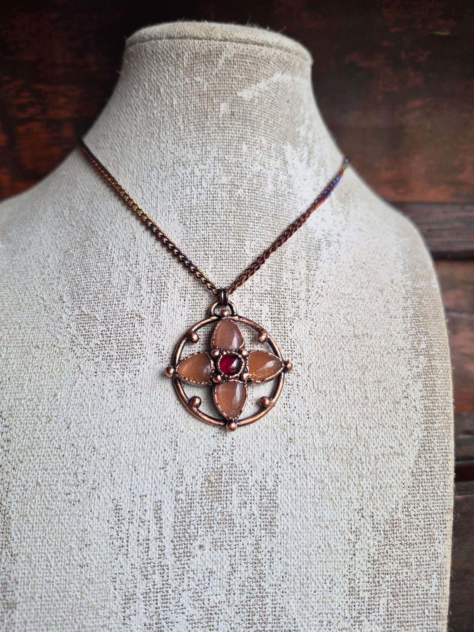 Il rame, con la sua patina che evoca il passare del tempo, avvolge il gioiello in un abbraccio caldo e suggestivo, esaltandone il contrasto cromatico tra la tenera luce dell'Adularia Pesca e il profondo calore del Granato.