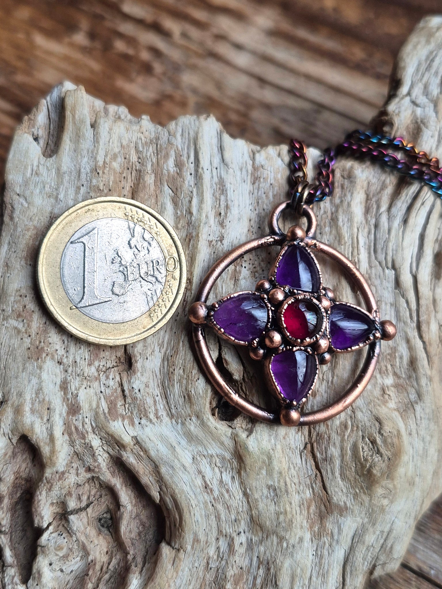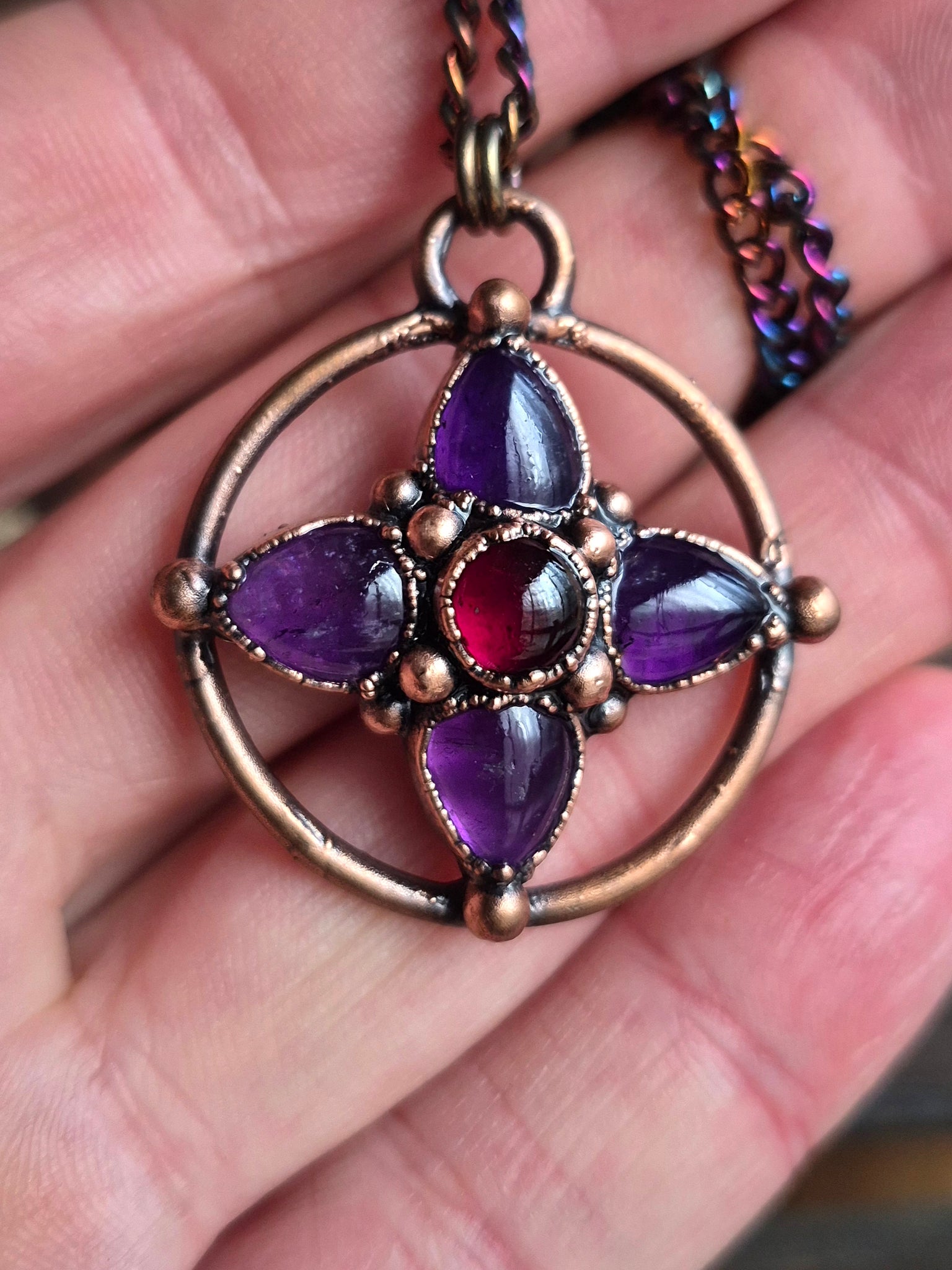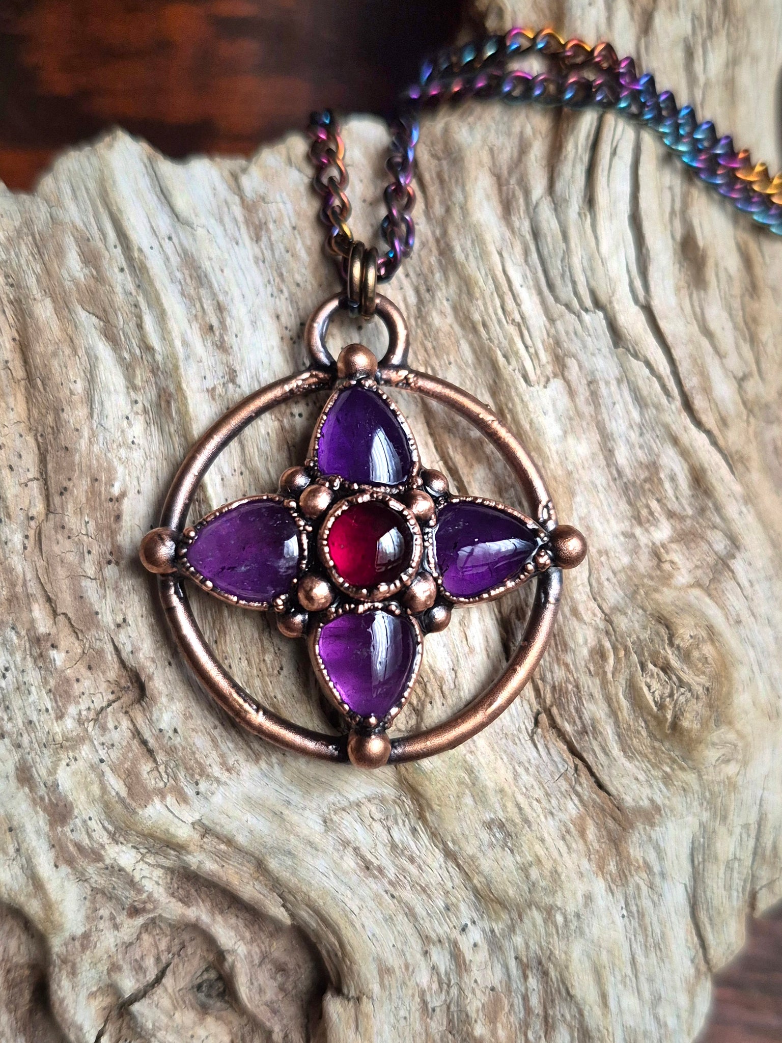 Il rame, con la sua patina che evoca il passare del tempo, avvolge il gioiello in un abbraccio caldo e suggestivo, esaltandone il contrasto cromatico tra la fredda e meditativa spiritualità dell'Ametista e l'ardente passione del Granato.