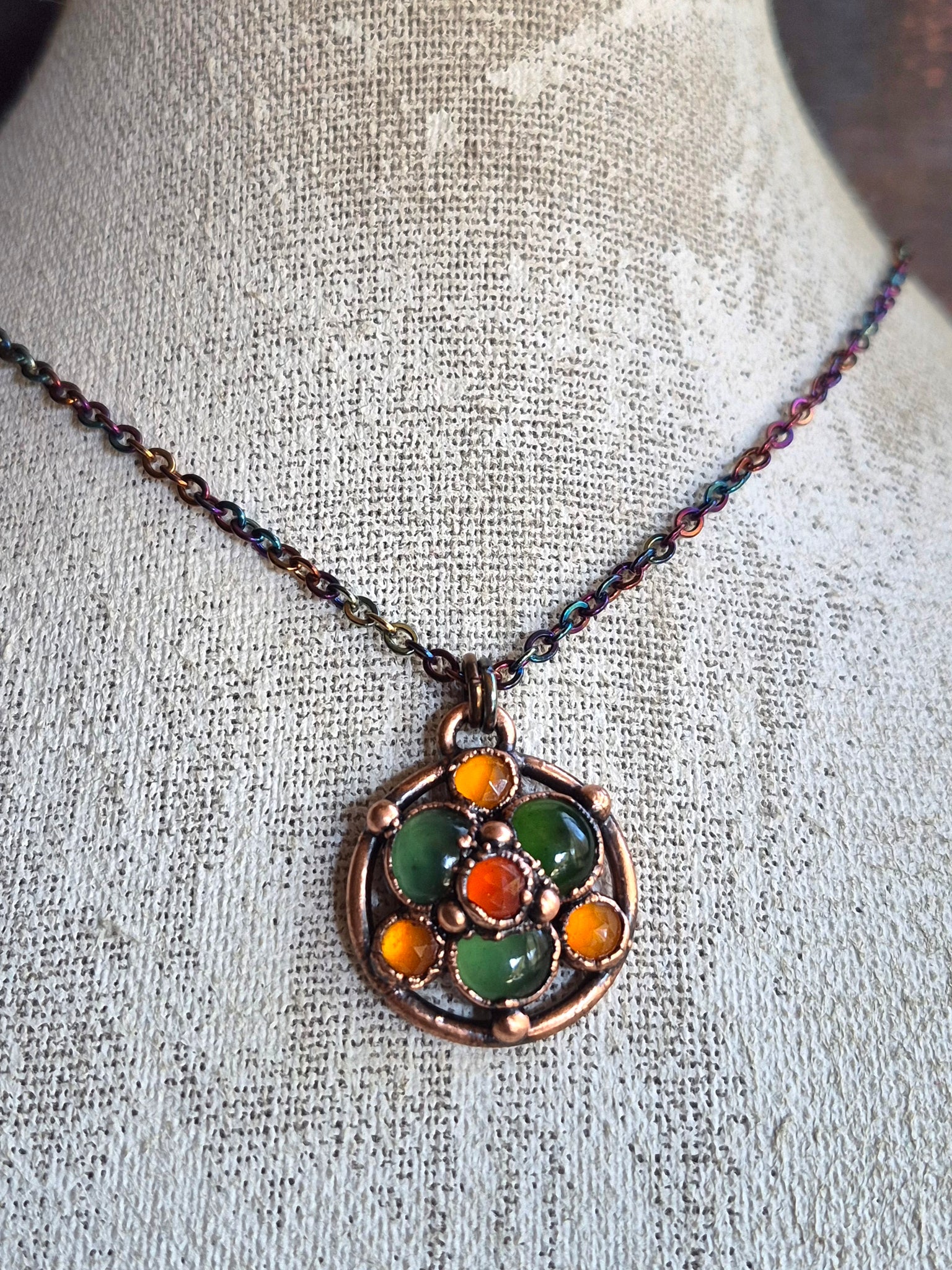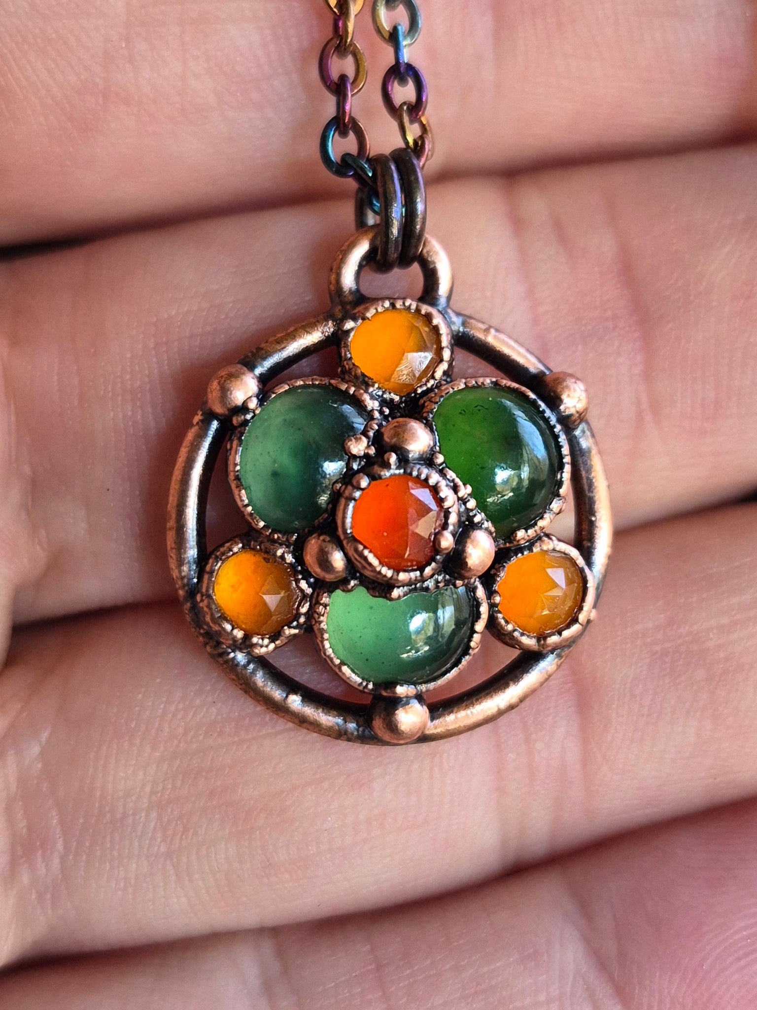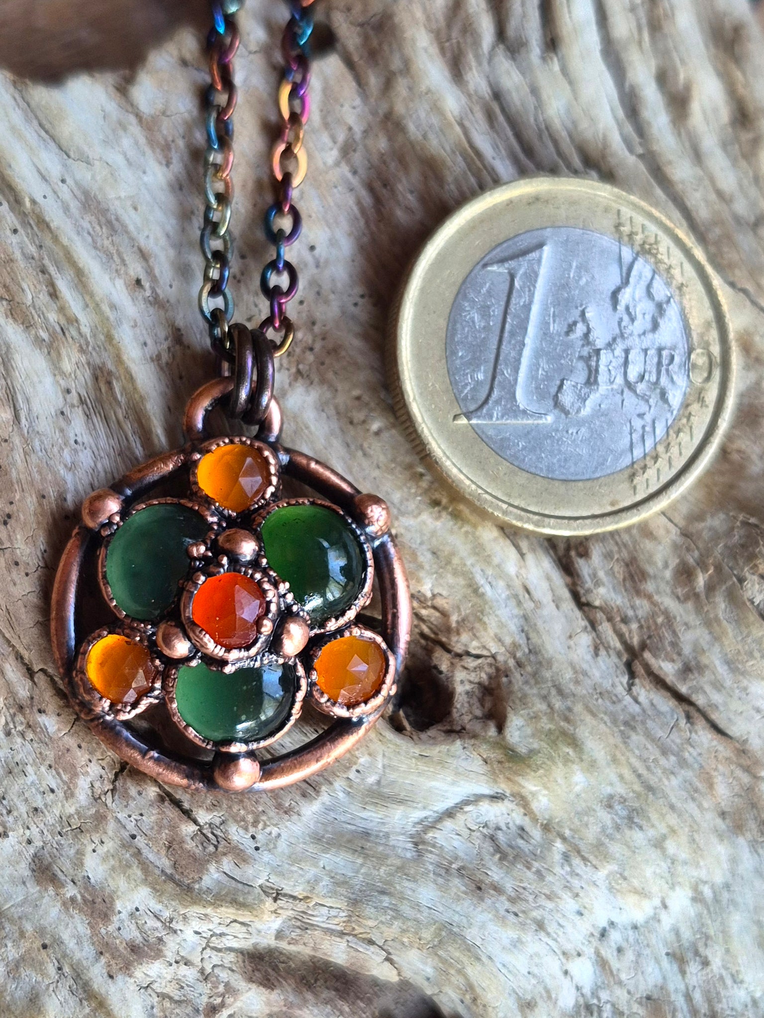 Il rame, con la sua patina che evoca il passare del tempo, avvolge il gioiello in un abbraccio caldo e suggestivo, esaltandone le sfumature e creando un affascinante contrasto cromatico tra il verde profondo e l'arancio vibrante.