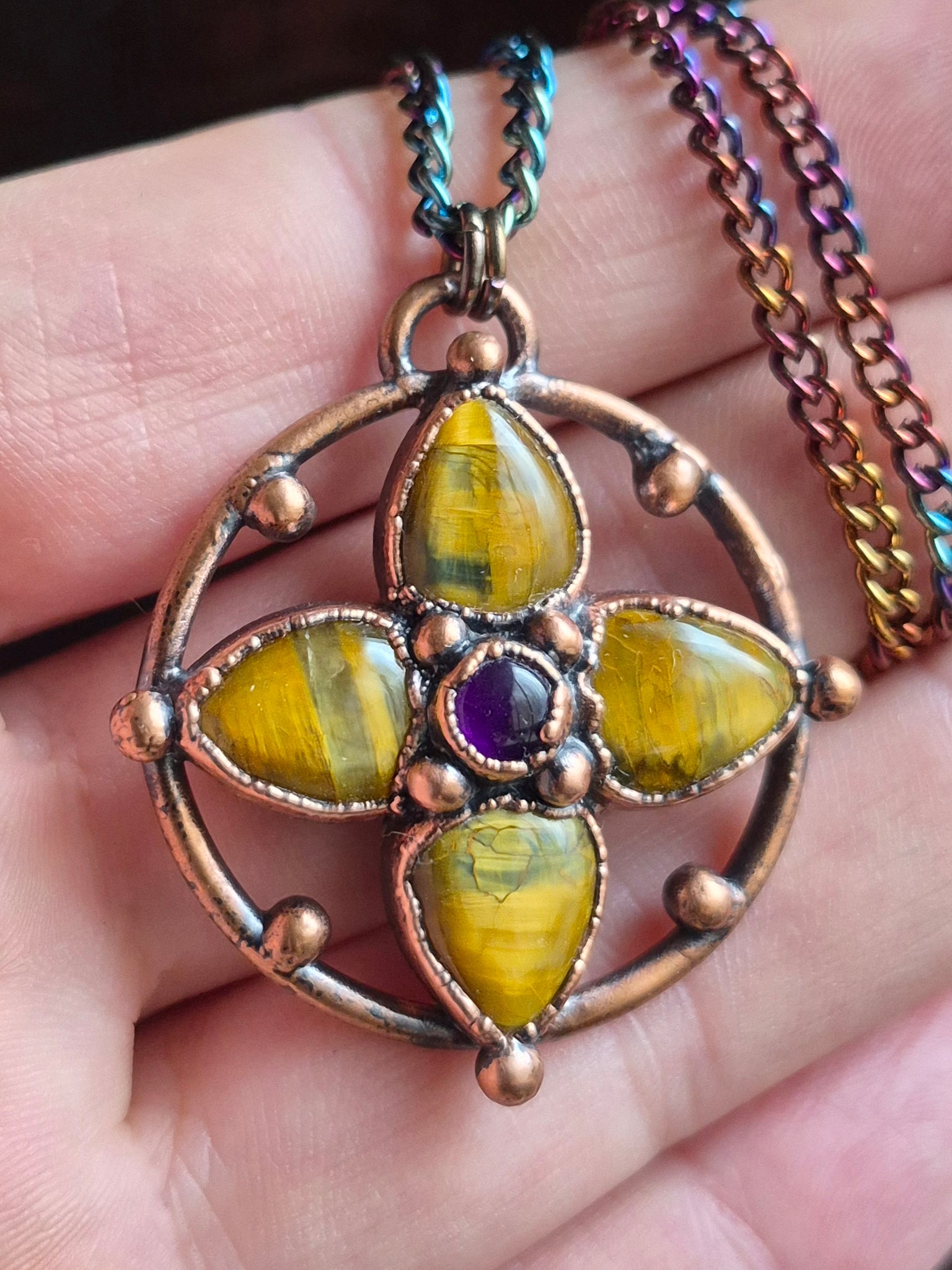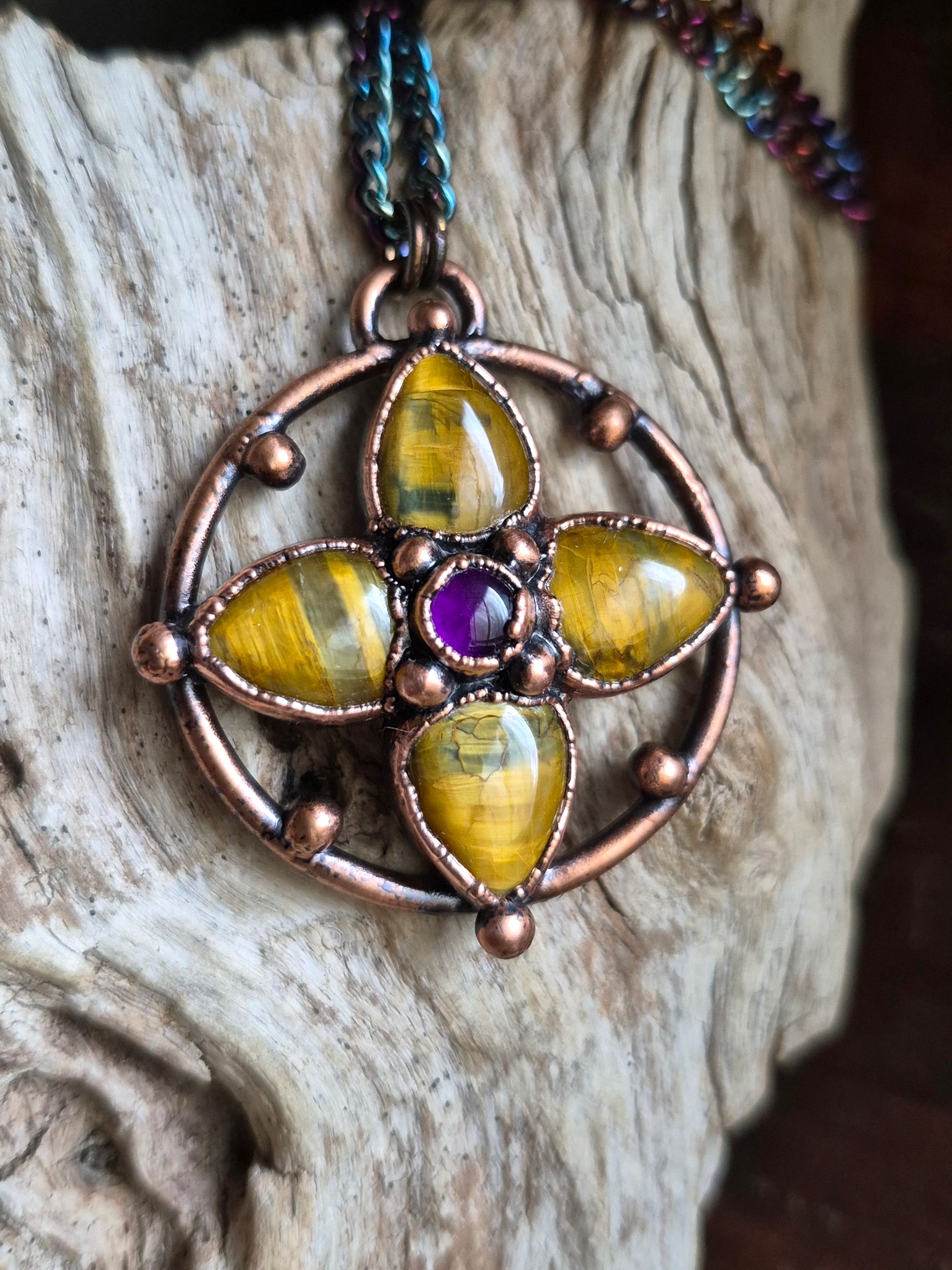 Protagonista di questa meraviglia, con i suoi 4 petali, è la Nellite (o Nuummite Gialla), la pietra della Maestria Interiore e del Riconoscimento, che stimola l'attivazione della volontà e la capacità di manifestare la propria sovranità personale. Simboleggia il raggiungimento dello Stato di Maestro, dove l'individuo opera con piena consapevolezza e autorità.