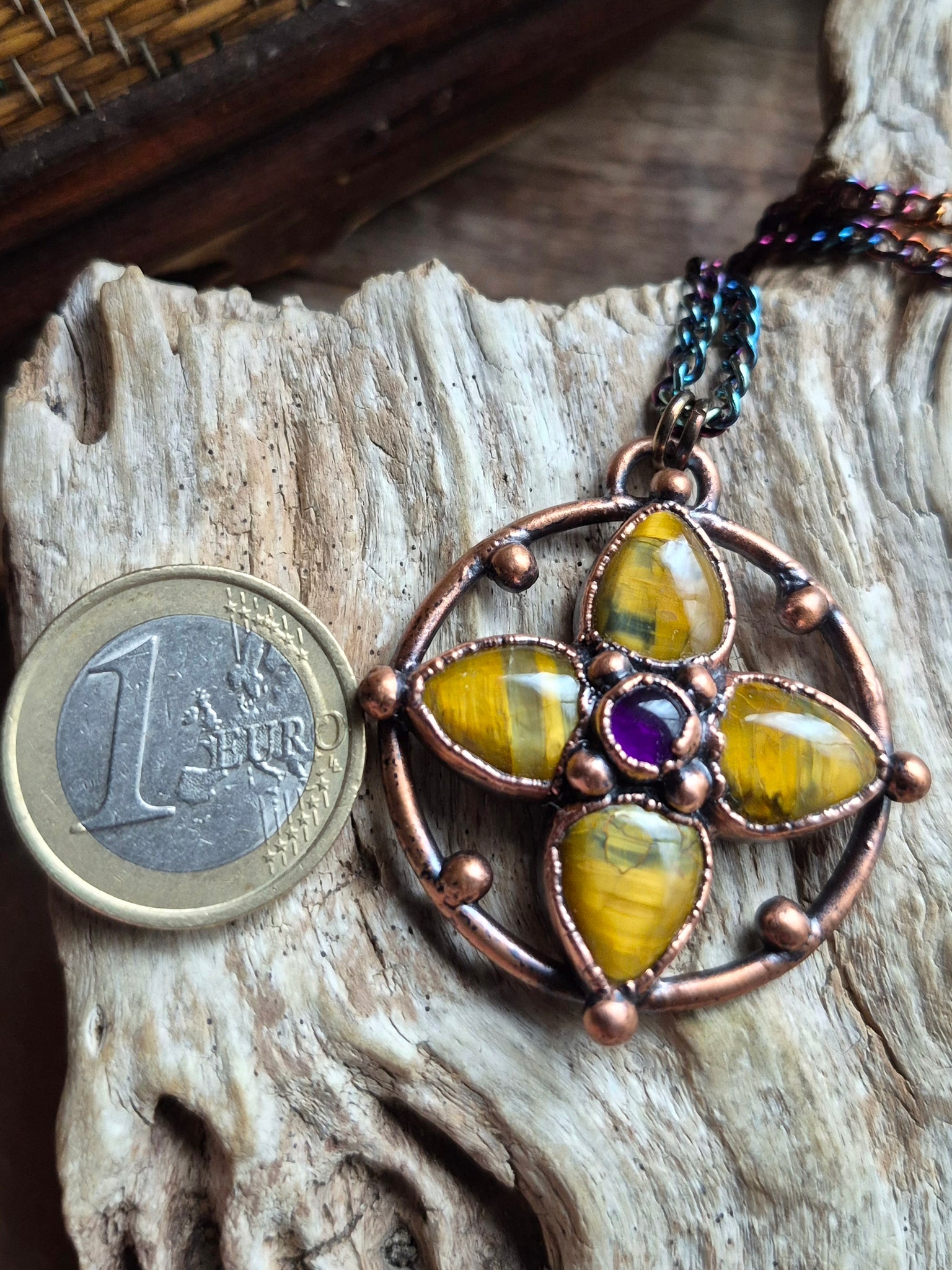Il gioiello è realizzato in Rame trattato con patina anticante per un aspetto magico e fuori dal tempo. Viene fornito con una catenina in acciaio policromo di 45 centimetri.