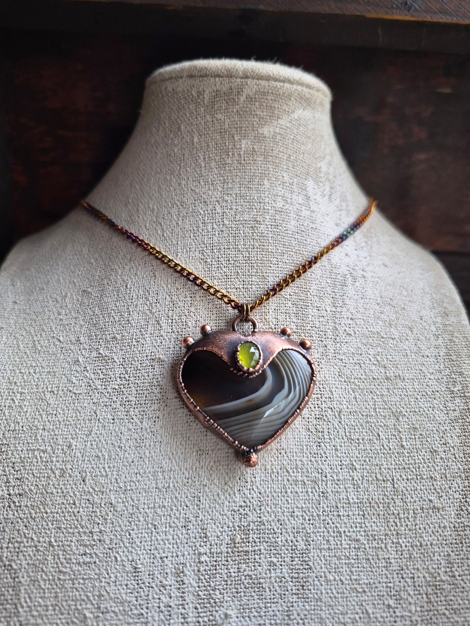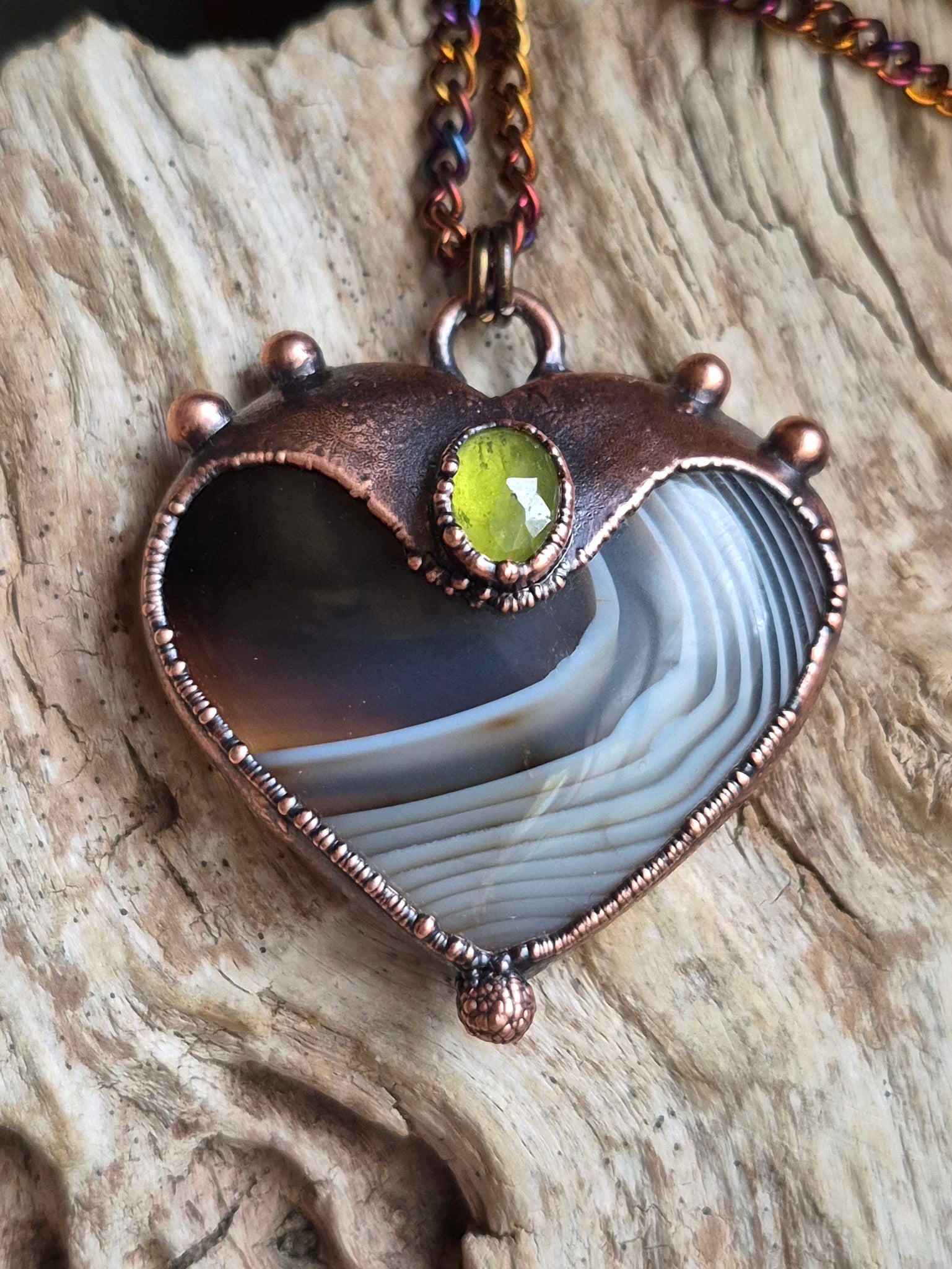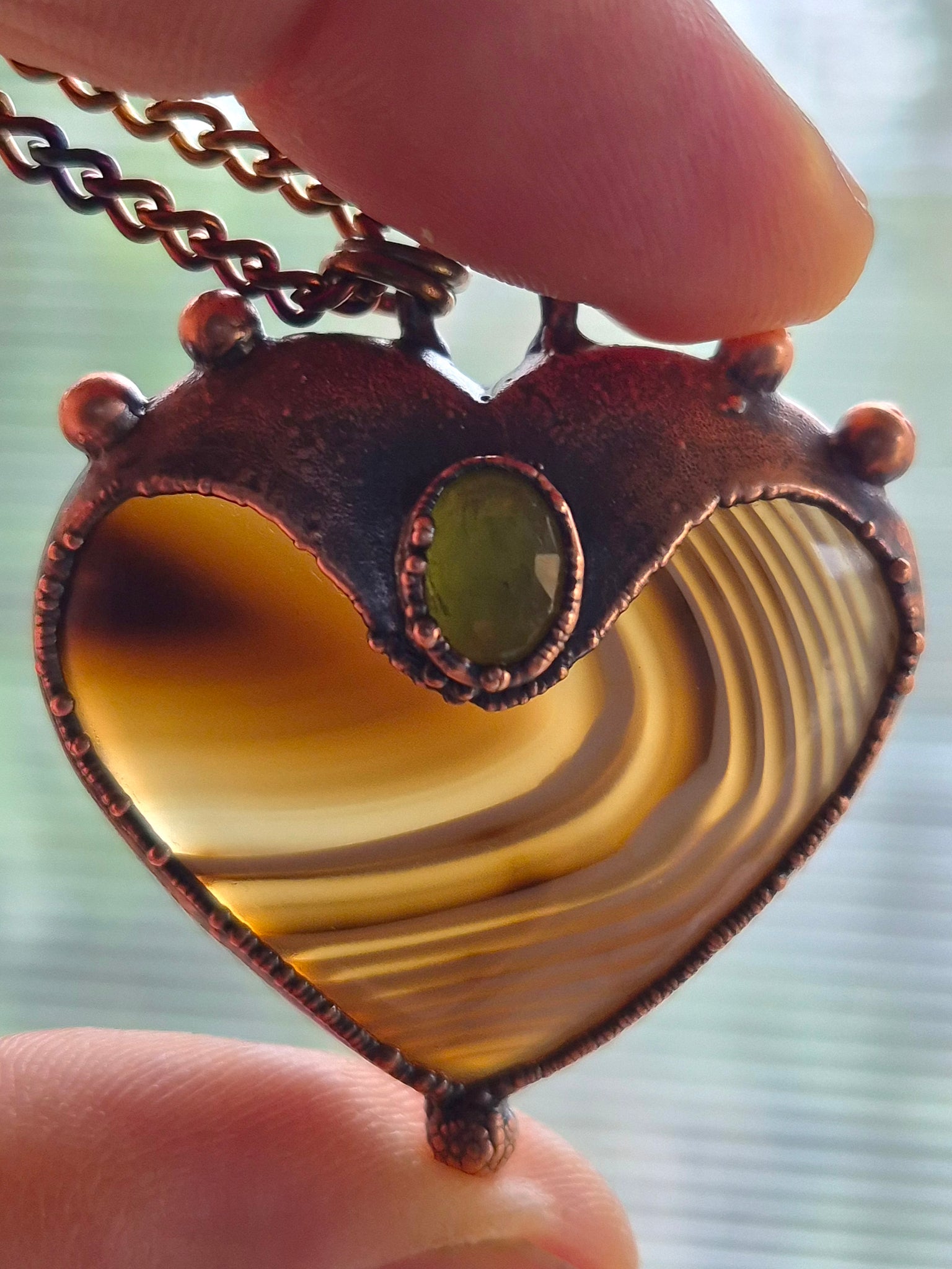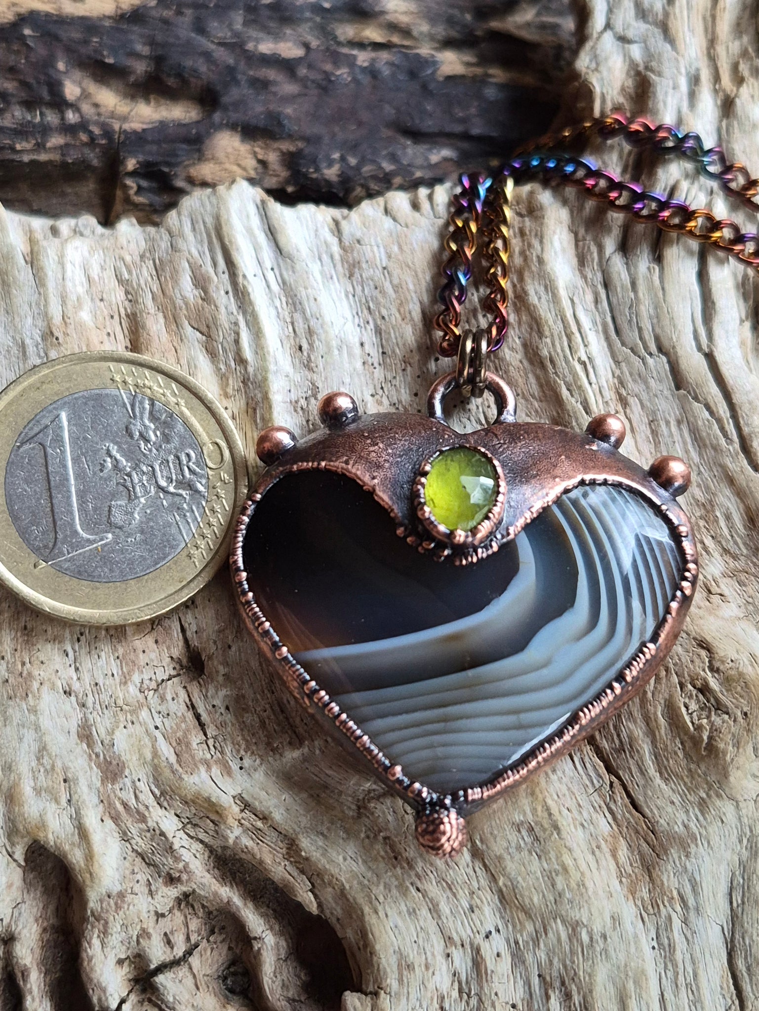 Il gioiello è realizzato con un bellissimo cuore in agata dai toni terrestri al cui centro brilla uno splendido esemplare di Vesuvianite (Idocrasio)