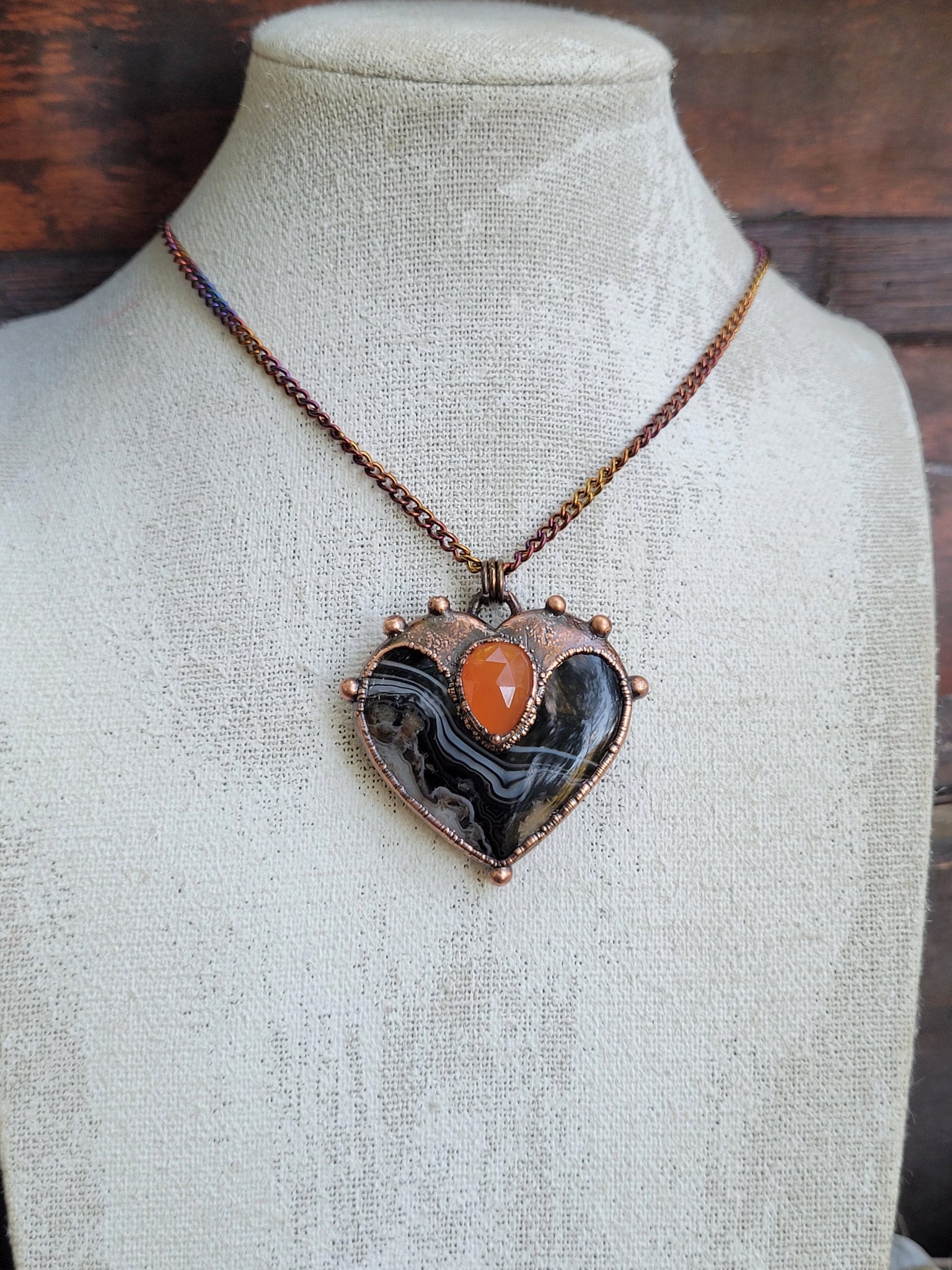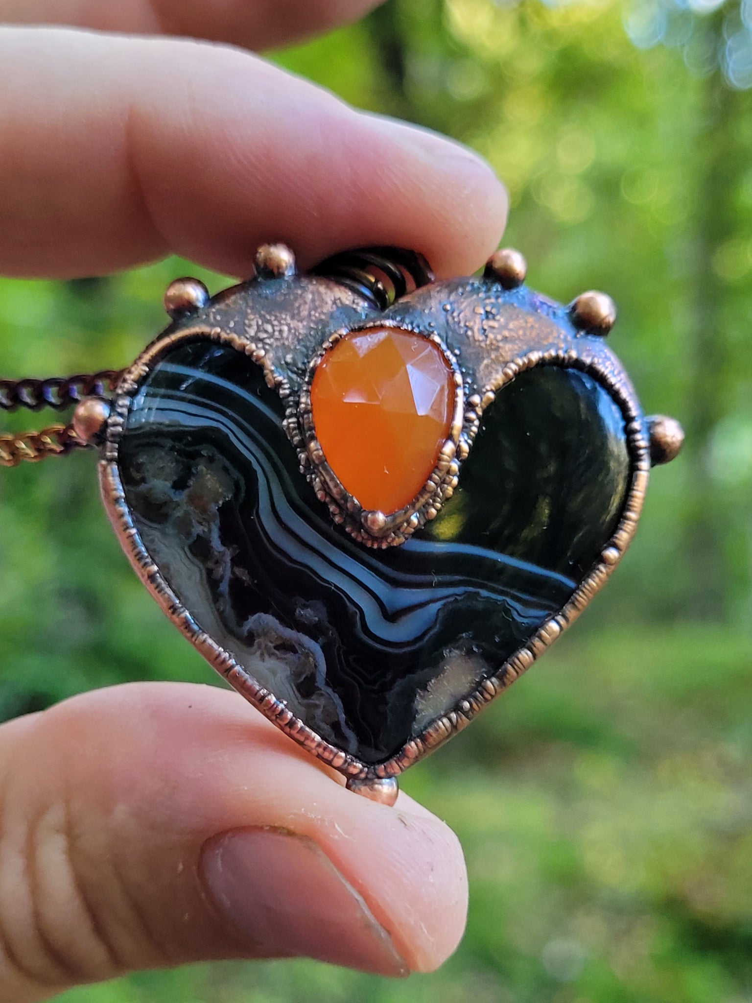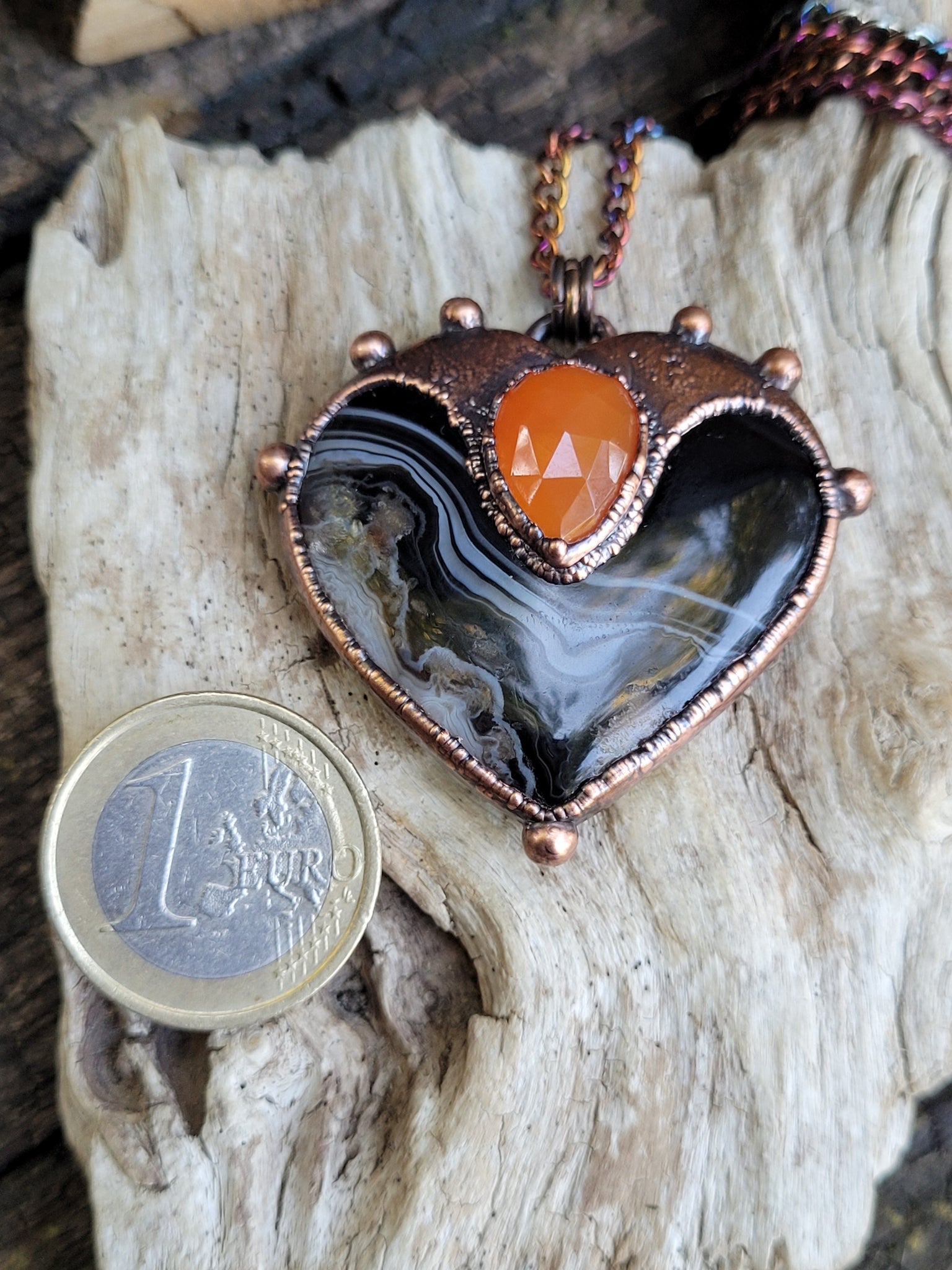 Il gioiello è realizzato con un bellissimo cuore in agata dai toni terrestri al cui centro brilla una splendida Corniola.