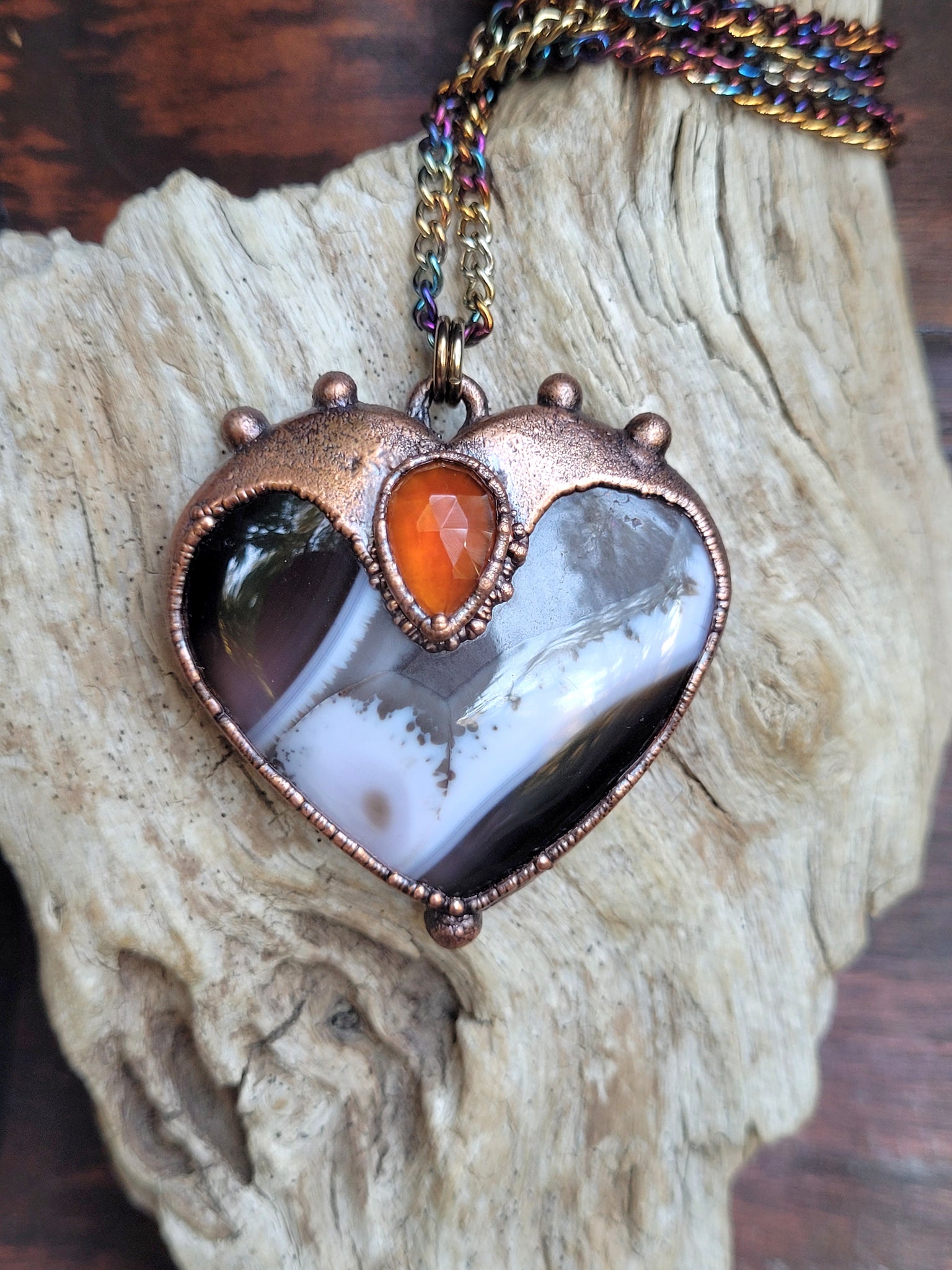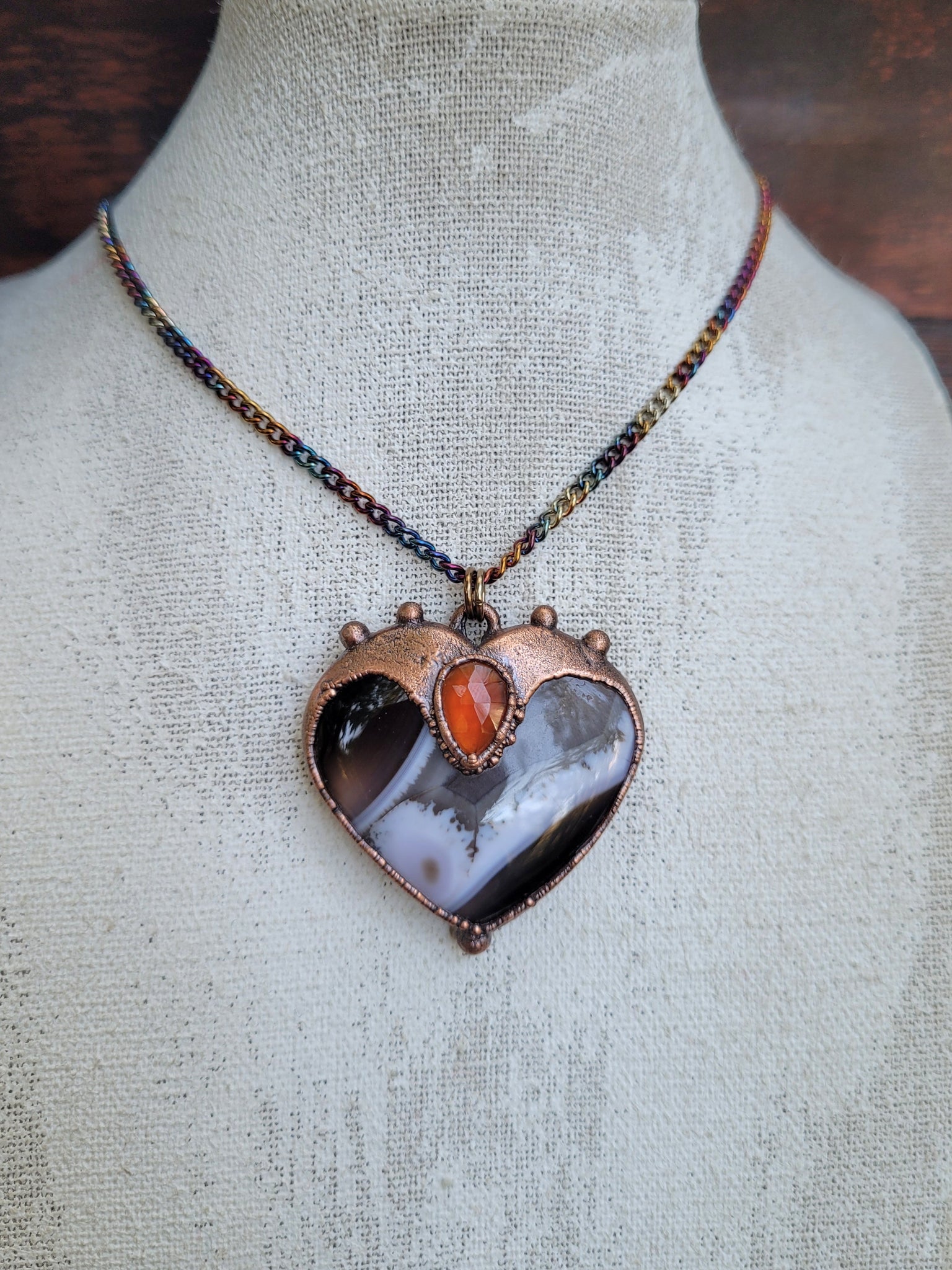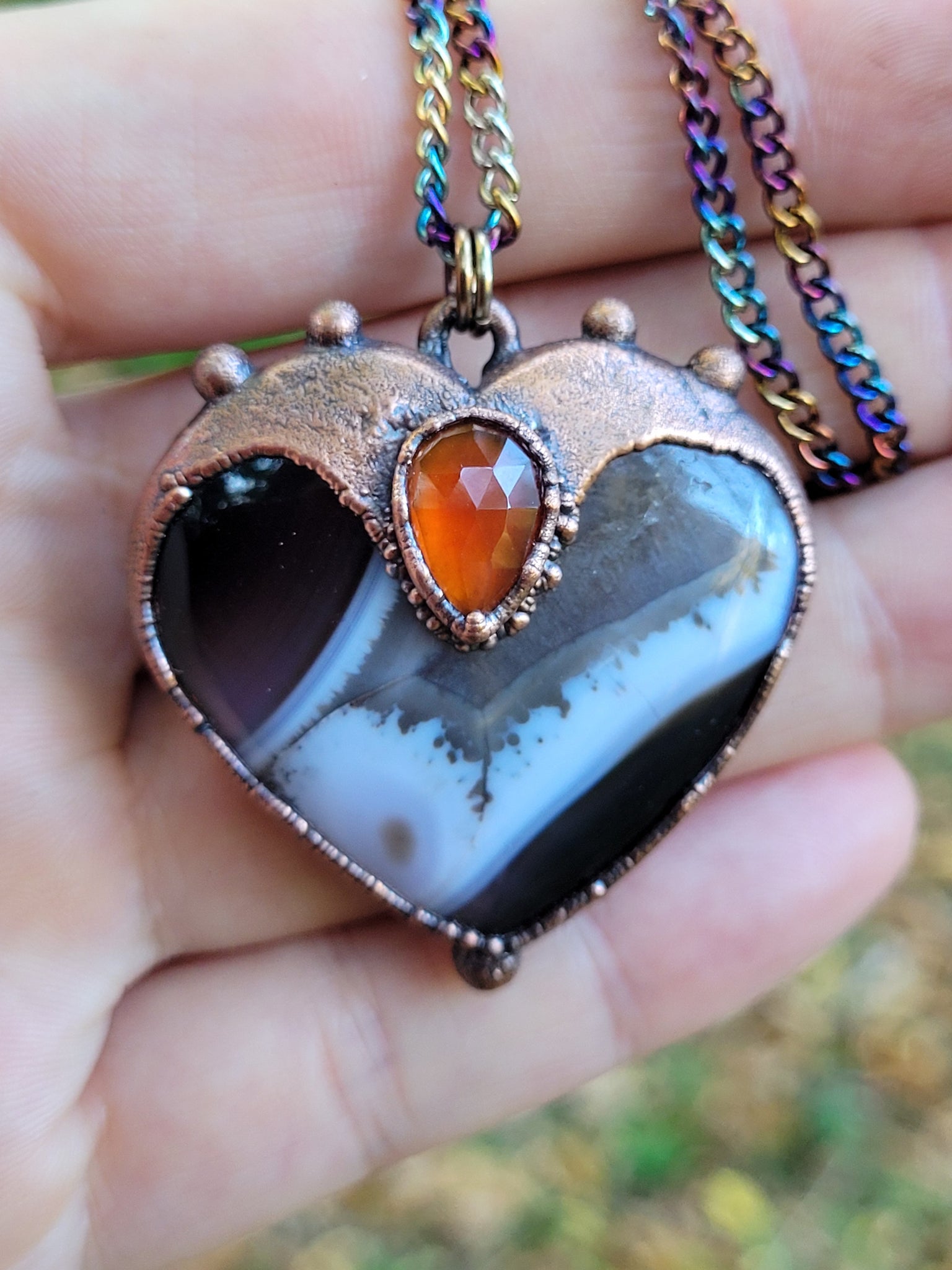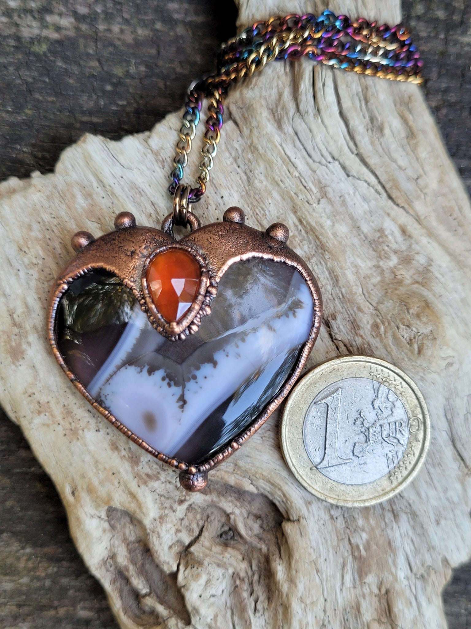 Il gioiello è realizzato con un bellissimo cuore in agata dai toni terrestri al cui centro brilla uno splendido esemplare di Granato Hessonite.