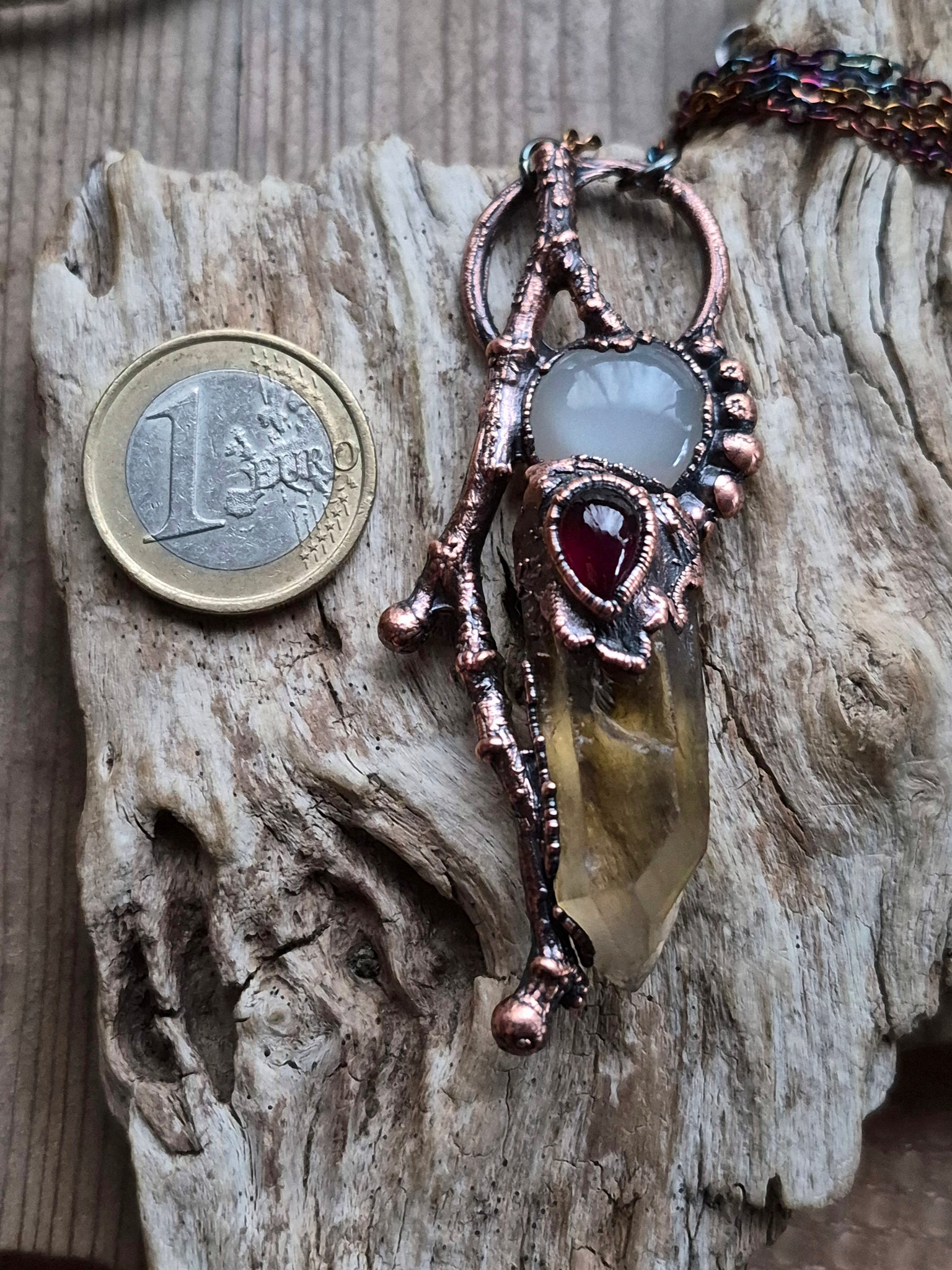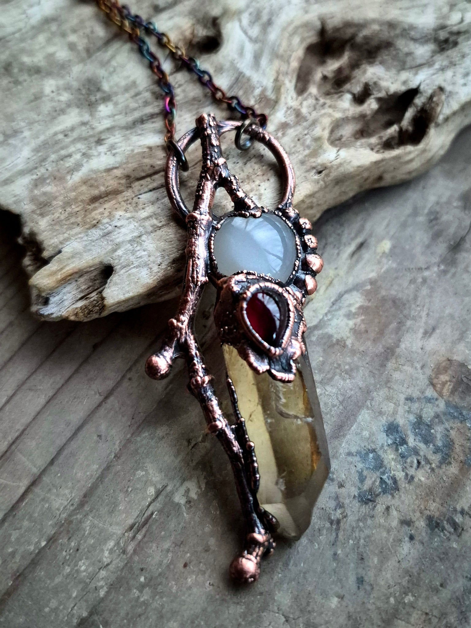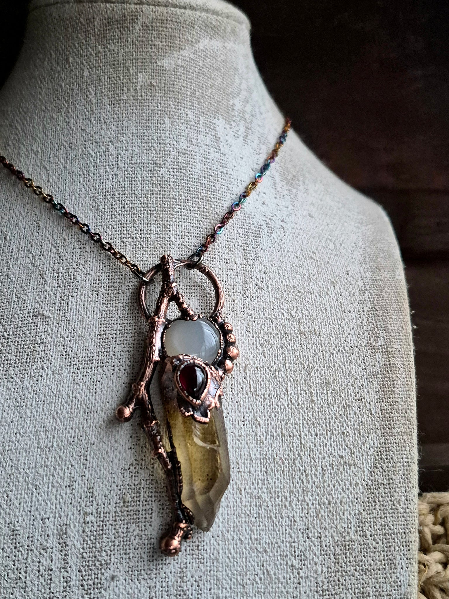 Il gioiello è realizzato con Adularia, Granato e Quarzo Citrino.