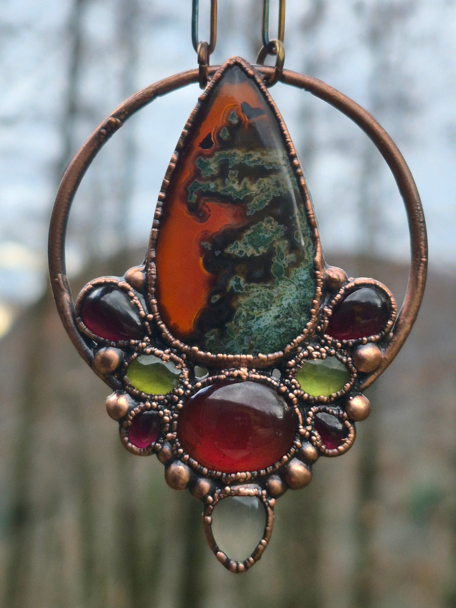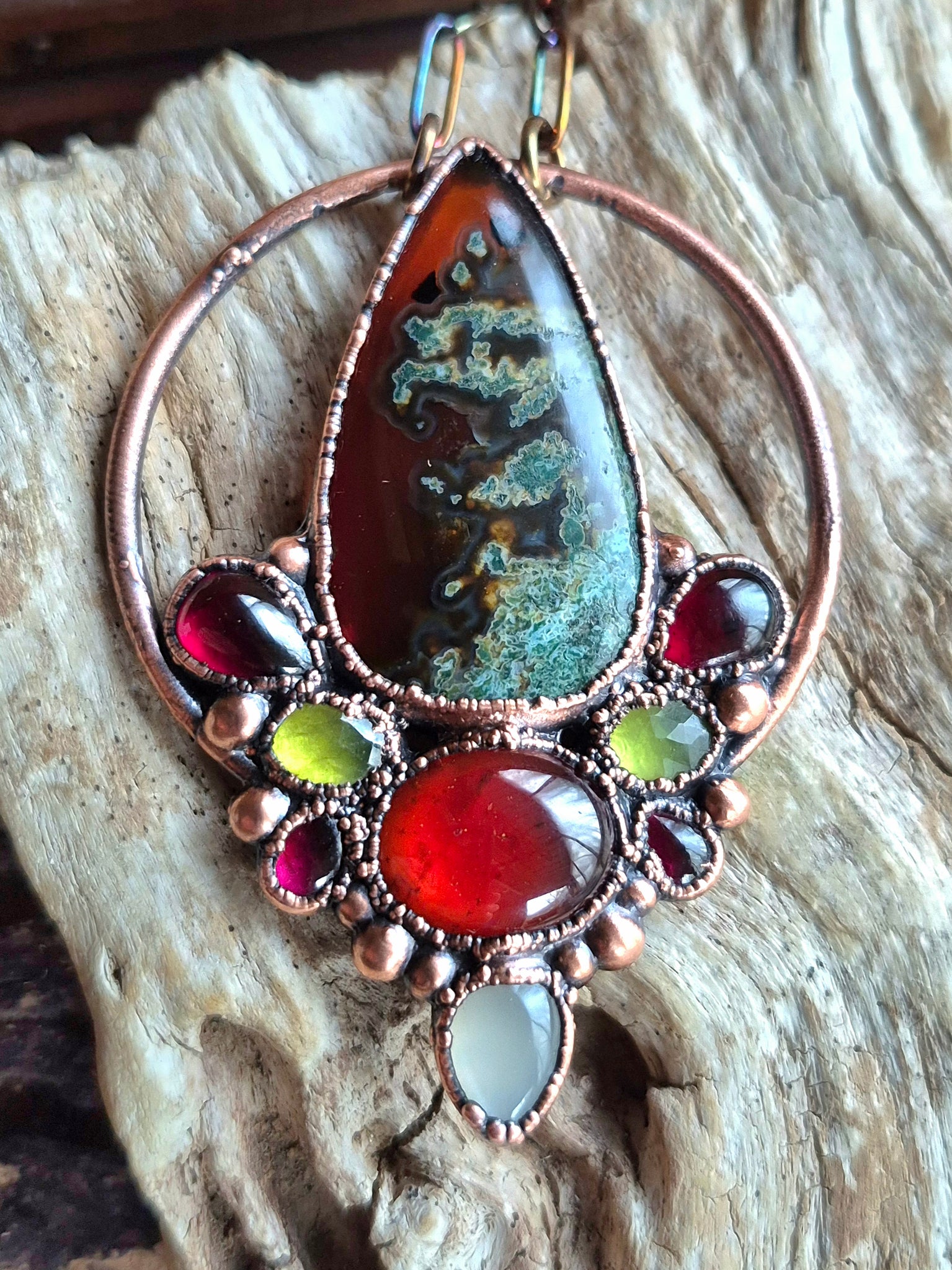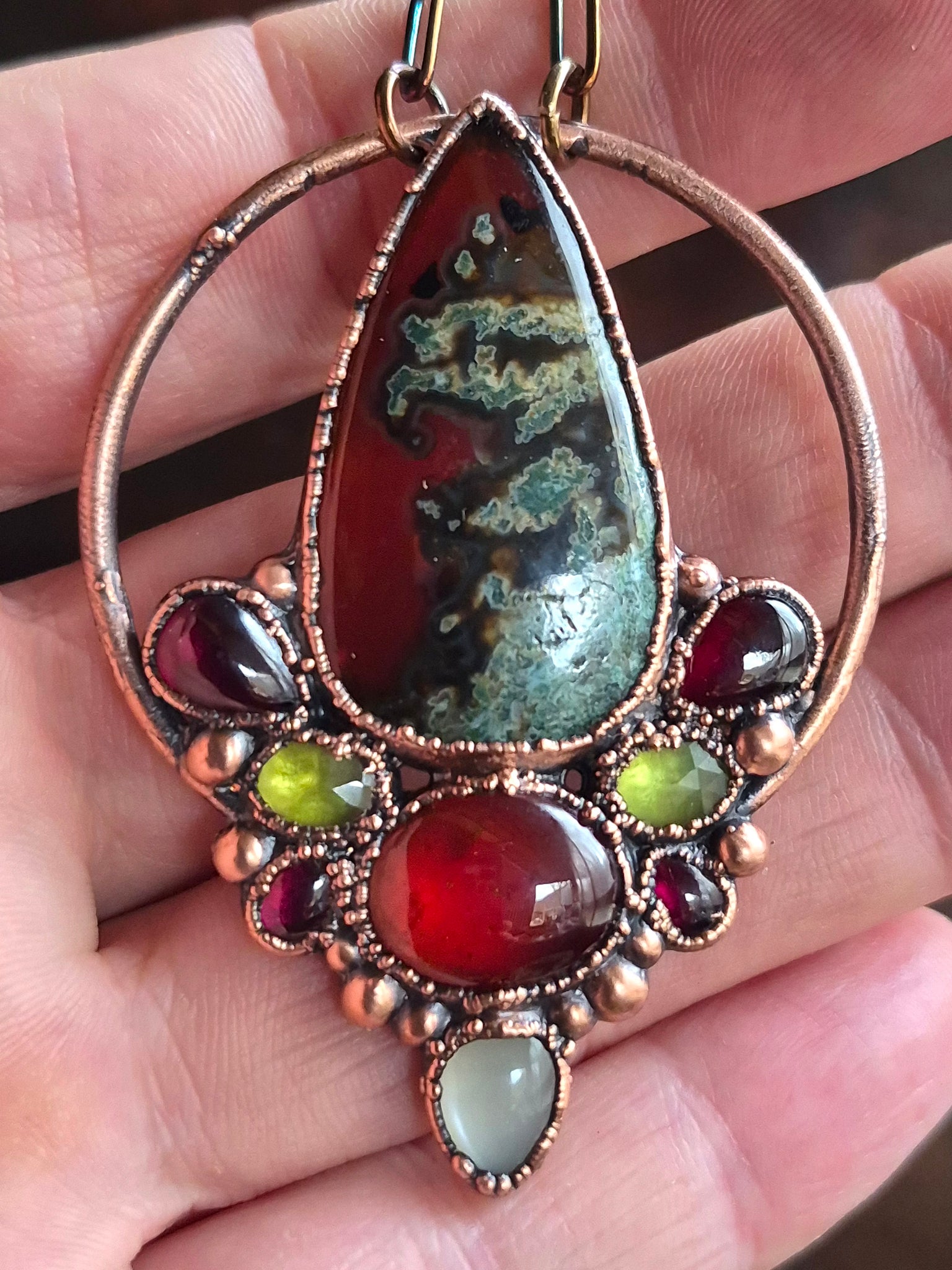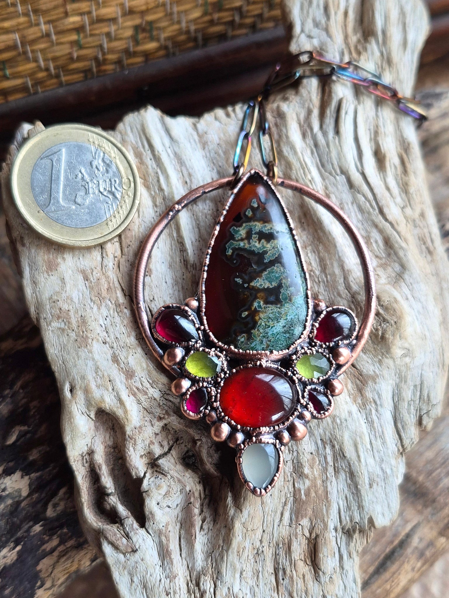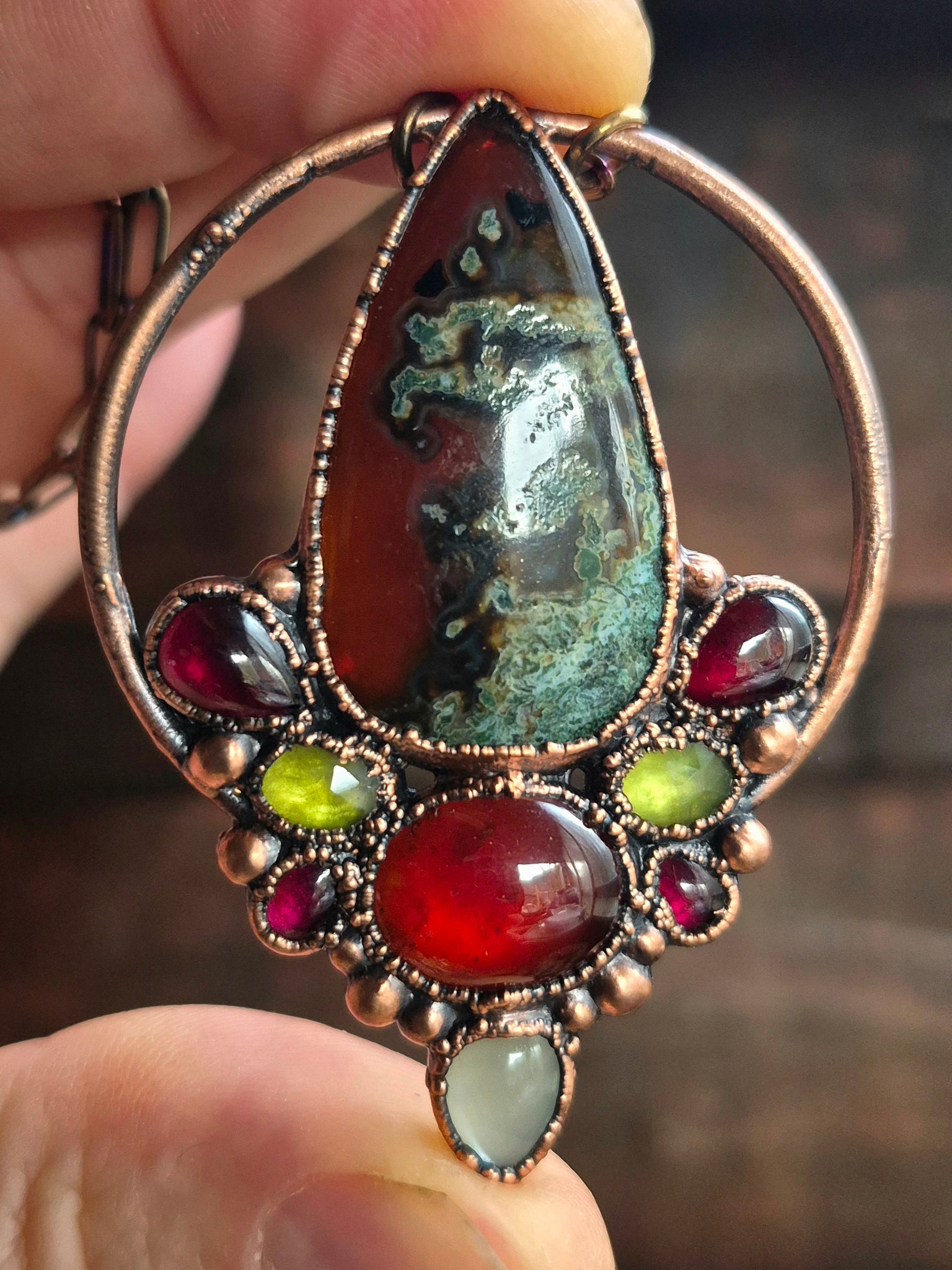 Agata muschiata dal Marocco, inclusioni verdi simili a licheni che si sviluppano su un cristallo rosso caldo:una vera rarità del mondo minerale.