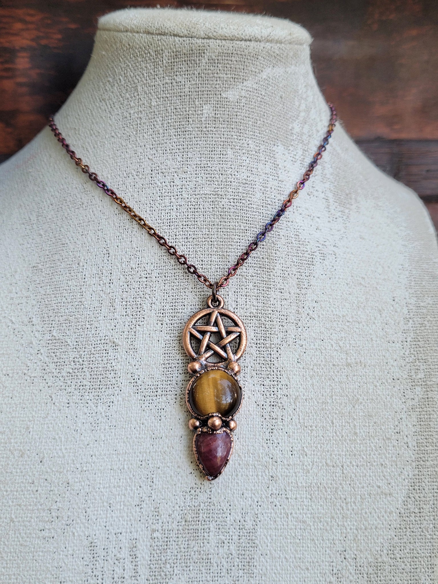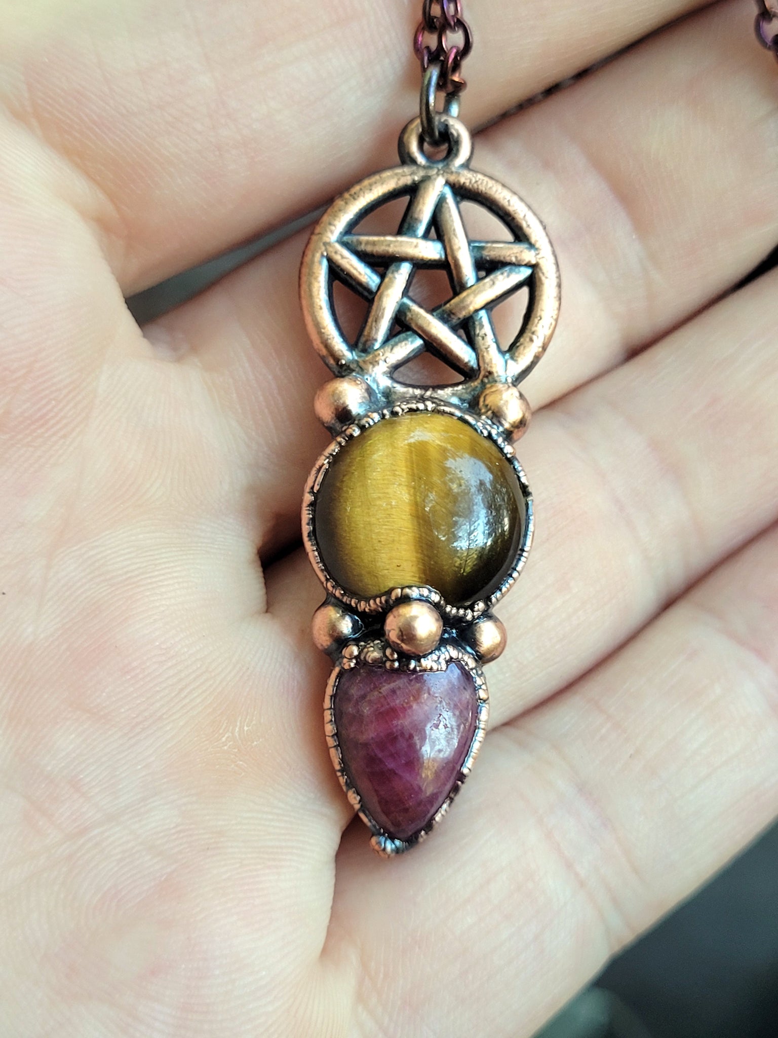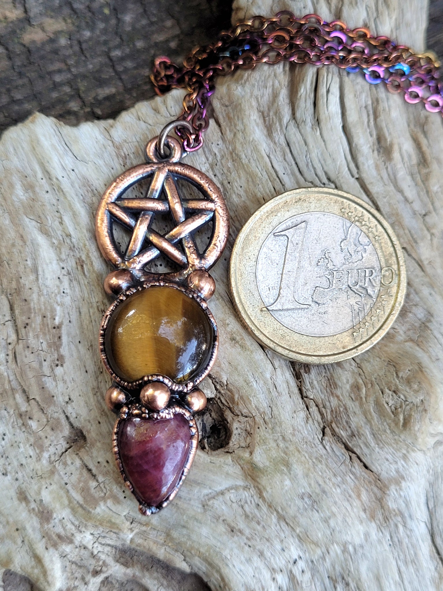 Il gioiello è realizzato in Rame trattato con patina anticante per un aspetto magico e fuori dal tempo, viene fornito con una catenina in acciaio policromo di 45 centimetri e confezionato in una robusta scatola per gioielli in cartone naturale