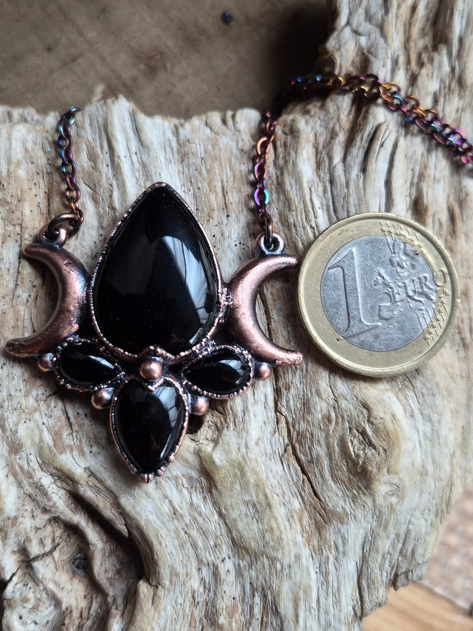 Il gioiello è realizzato in Rame trattato con patina anticante per un aspetto magico e fuori dal tempo, viene fornito con una catenina in acciaio policromo di 45 centimetri e confezionato in una robusta scatola per gioielli .