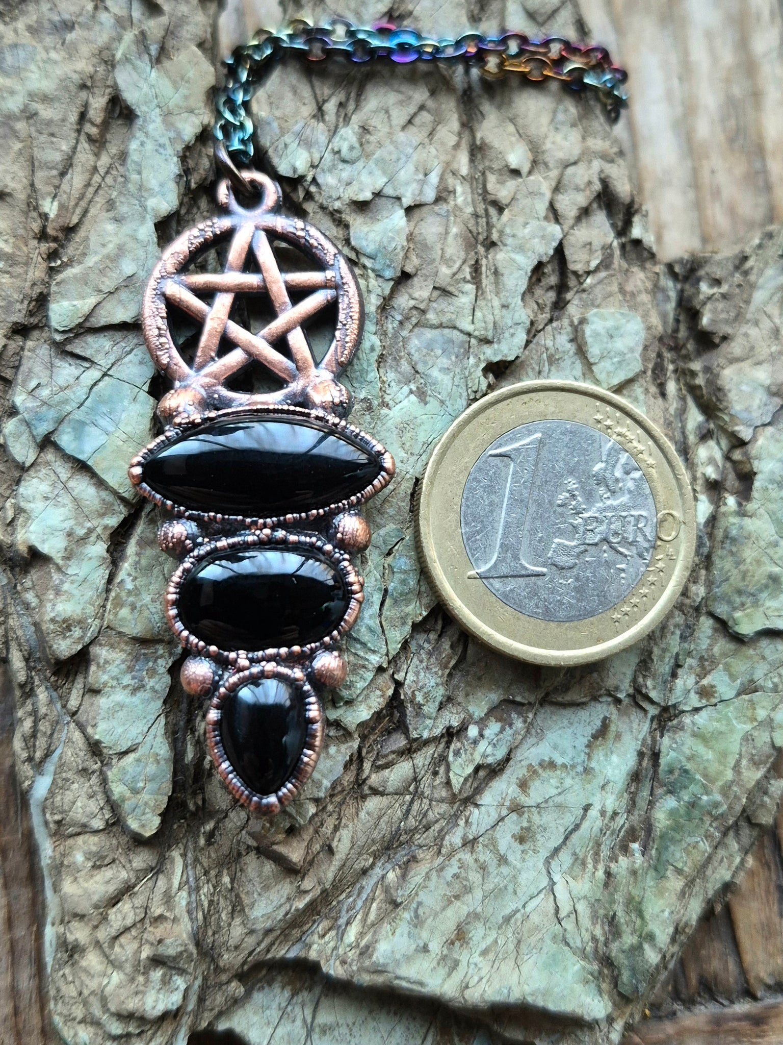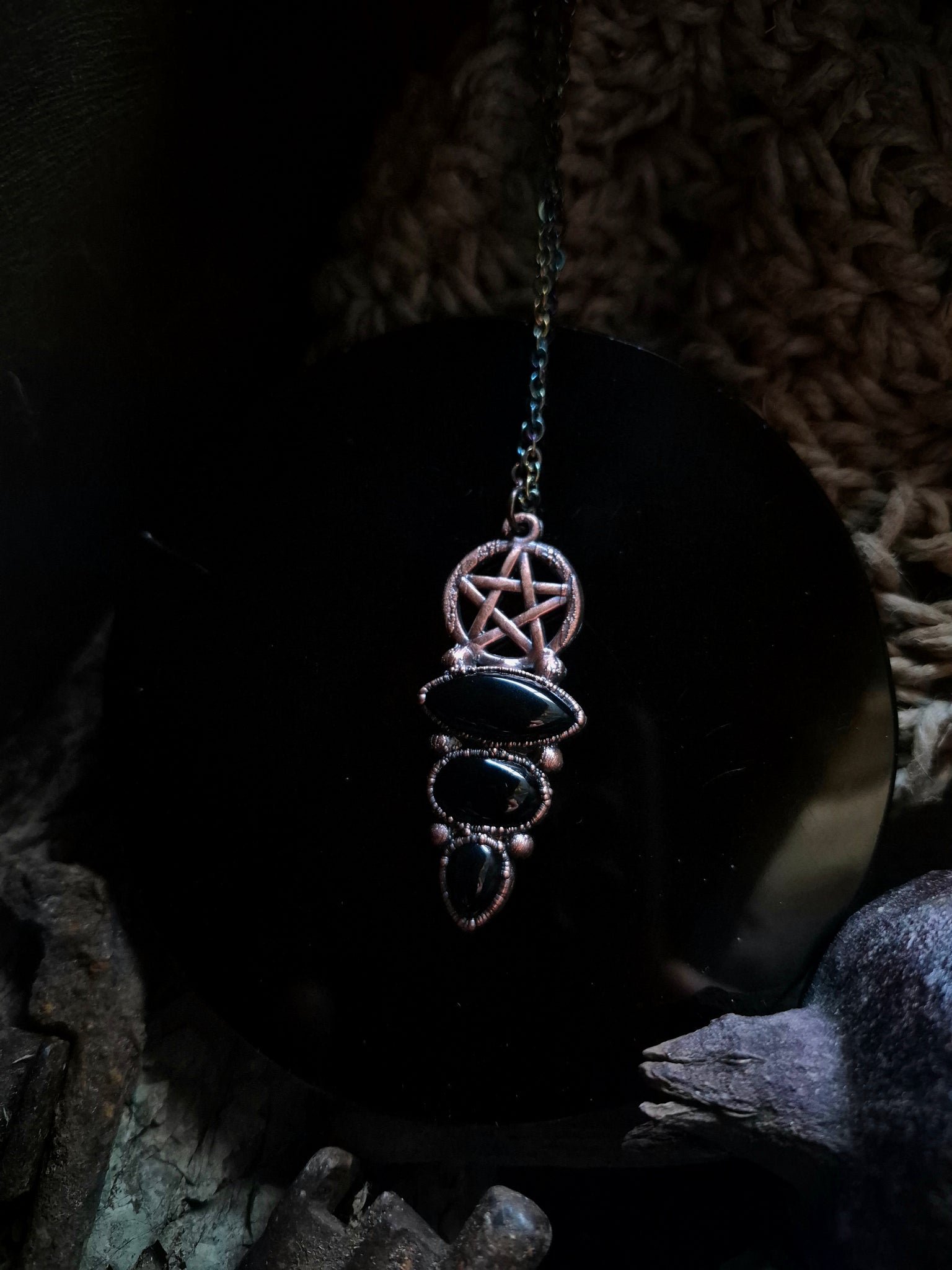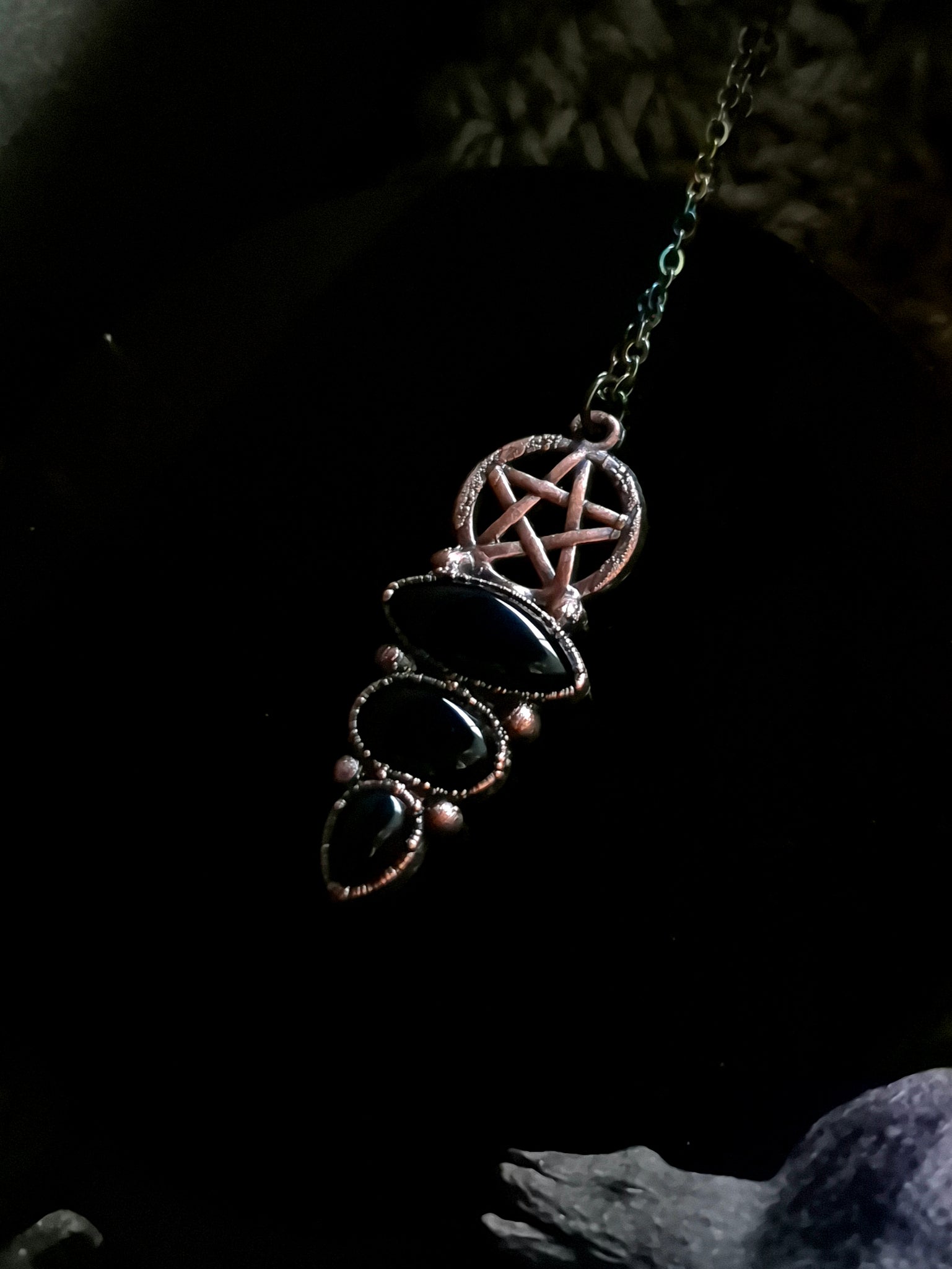 Questo amuleto accoglie la memoria della stirpe di Ecate, cristallizzata in tre onici nere profonde come notti senza luna. Ogni gemma è un capitolo di conoscenza millenaria, incastonato per proteggere e guidare il viandante verso la propria verità interiore.