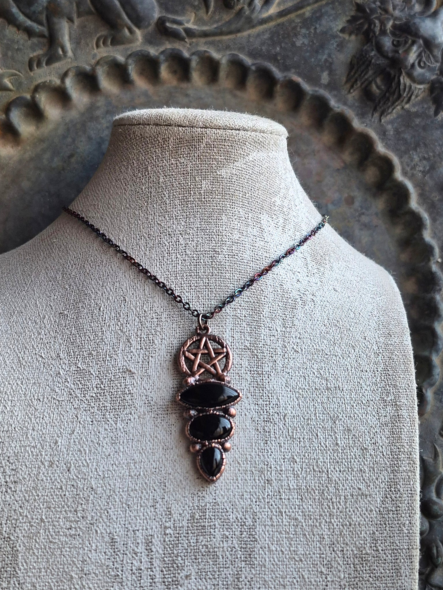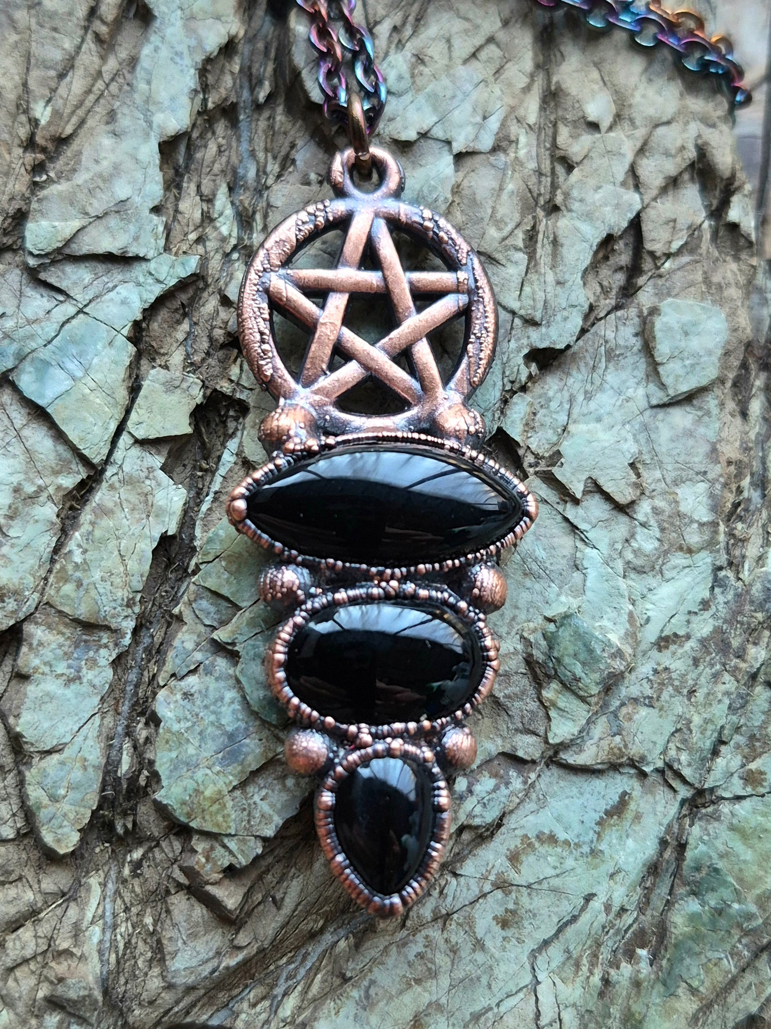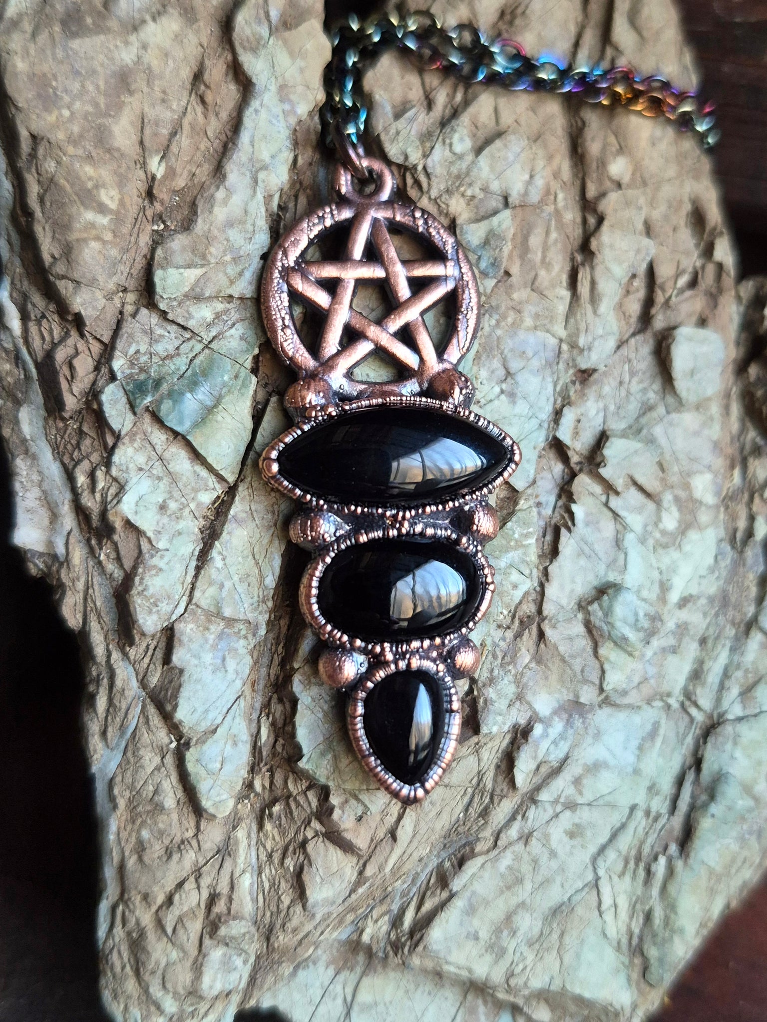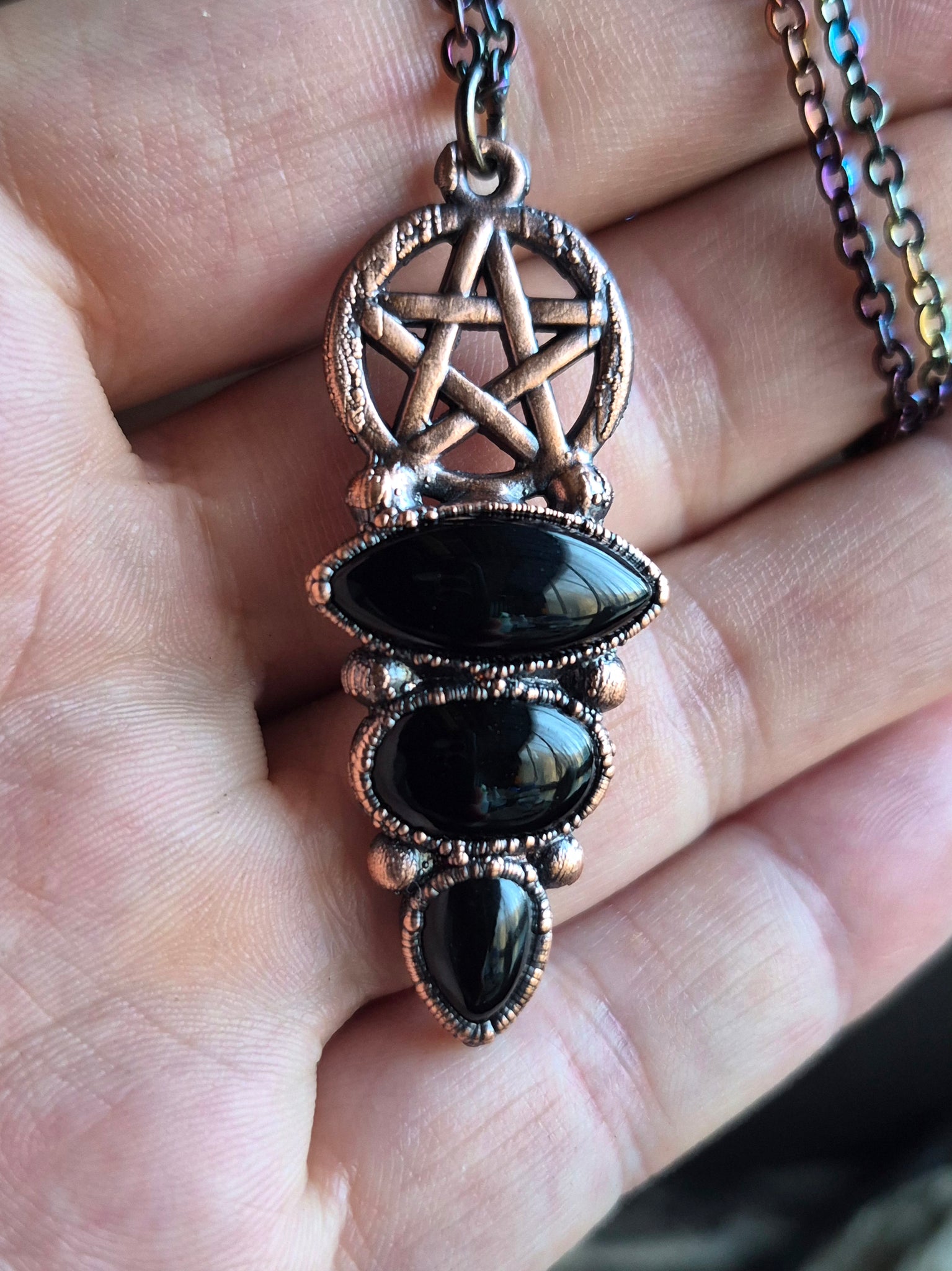 Questo amuleto accoglie la memoria della stirpe di Ecate, cristallizzata in tre onici nere profonde come notti senza luna. Ogni gemma è un capitolo di conoscenza millenaria, incastonato per proteggere e guidare il viandante verso la propria verità interiore.