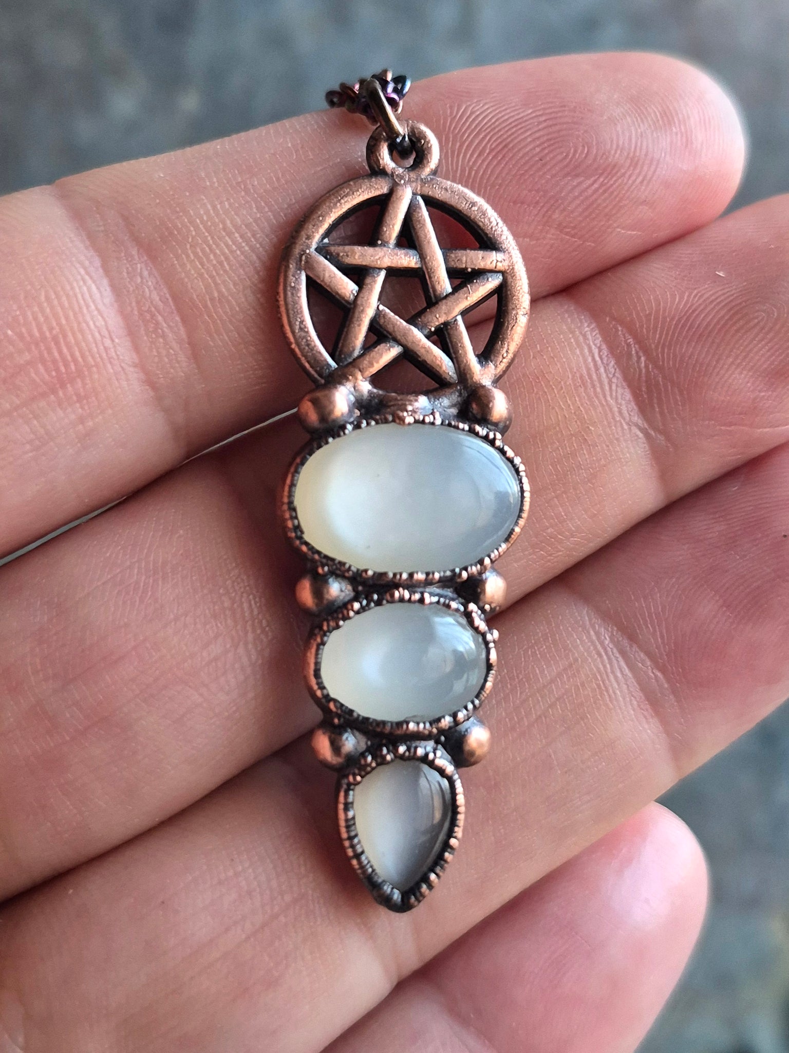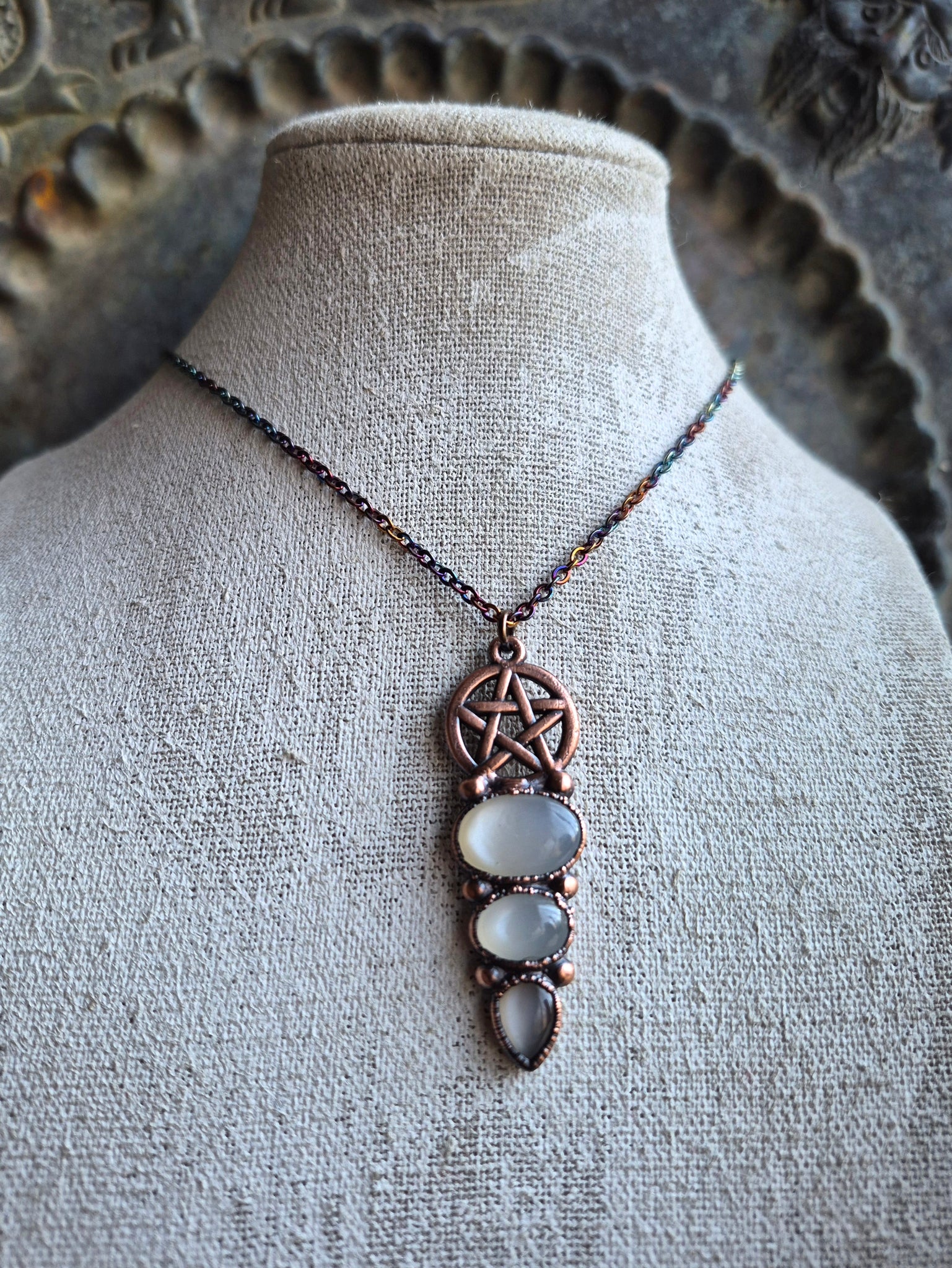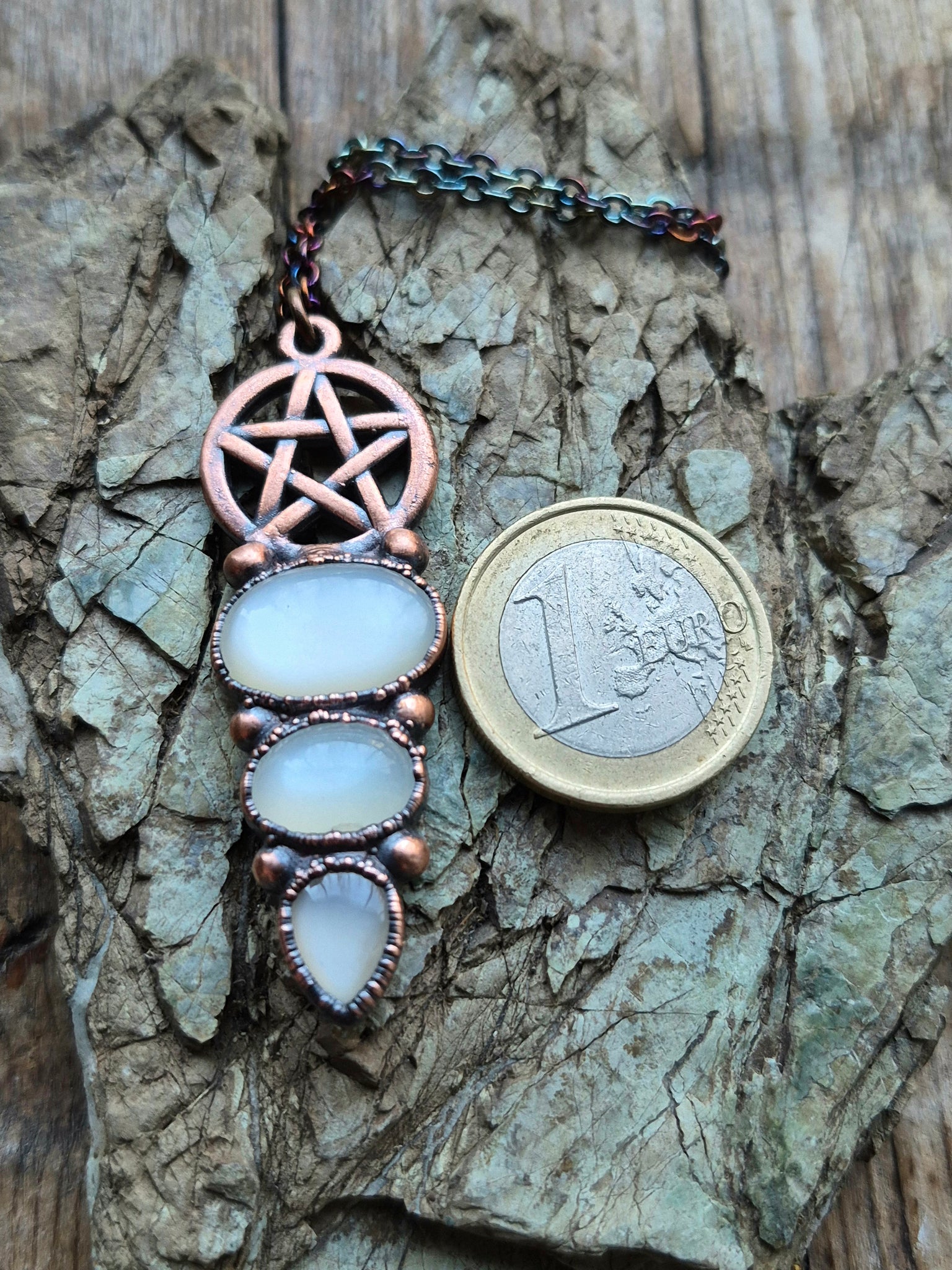 Il gioiello è realizzato in Rame trattato con patina anticante per un aspetto magico e fuori dal tempo, viene fornito con una catenina in acciaio policromo di 45 centimetri e confezionato in una robusta scatola per gioielli in cartone naturale