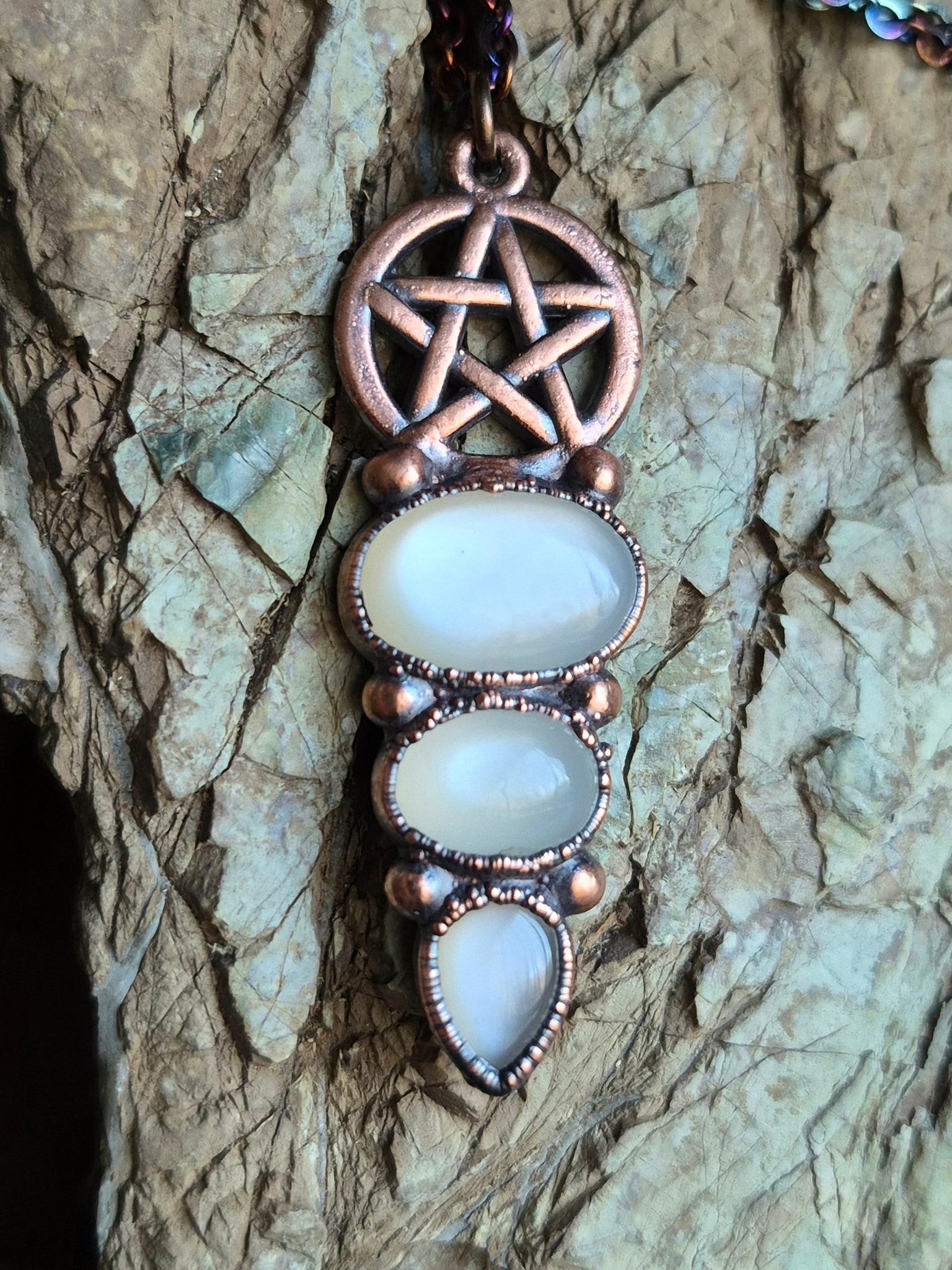 L'Adularia Superiore – La Visione del Terzo Occhio: Immediatamente sotto il Pentacolo, questa gemma cattura i sussurri dell'etere. È la chiarezza di Selene che illumina l'intuizione, permettendo di vedere oltre il velo della materia e di connettersi con la saggezza universale.