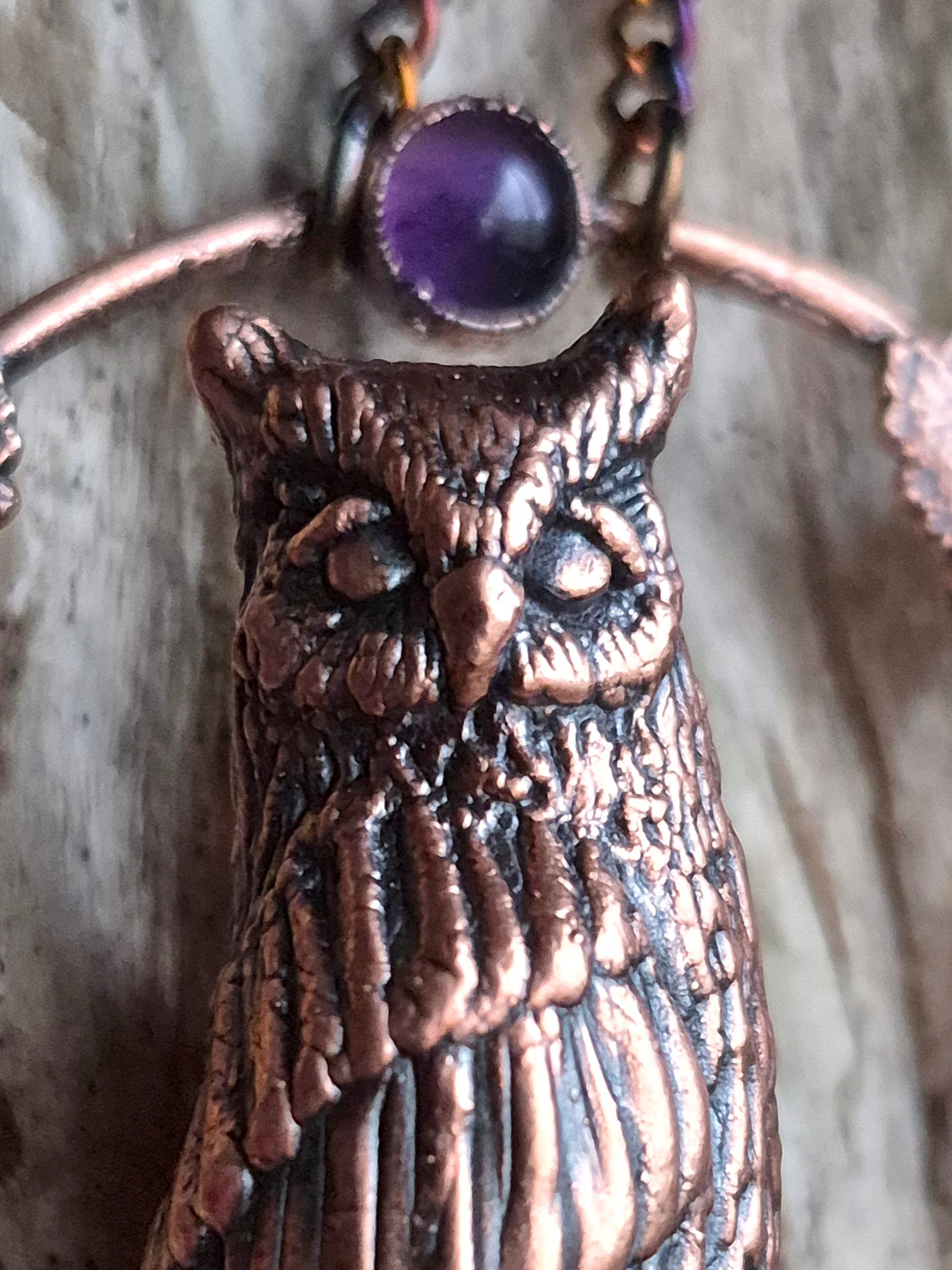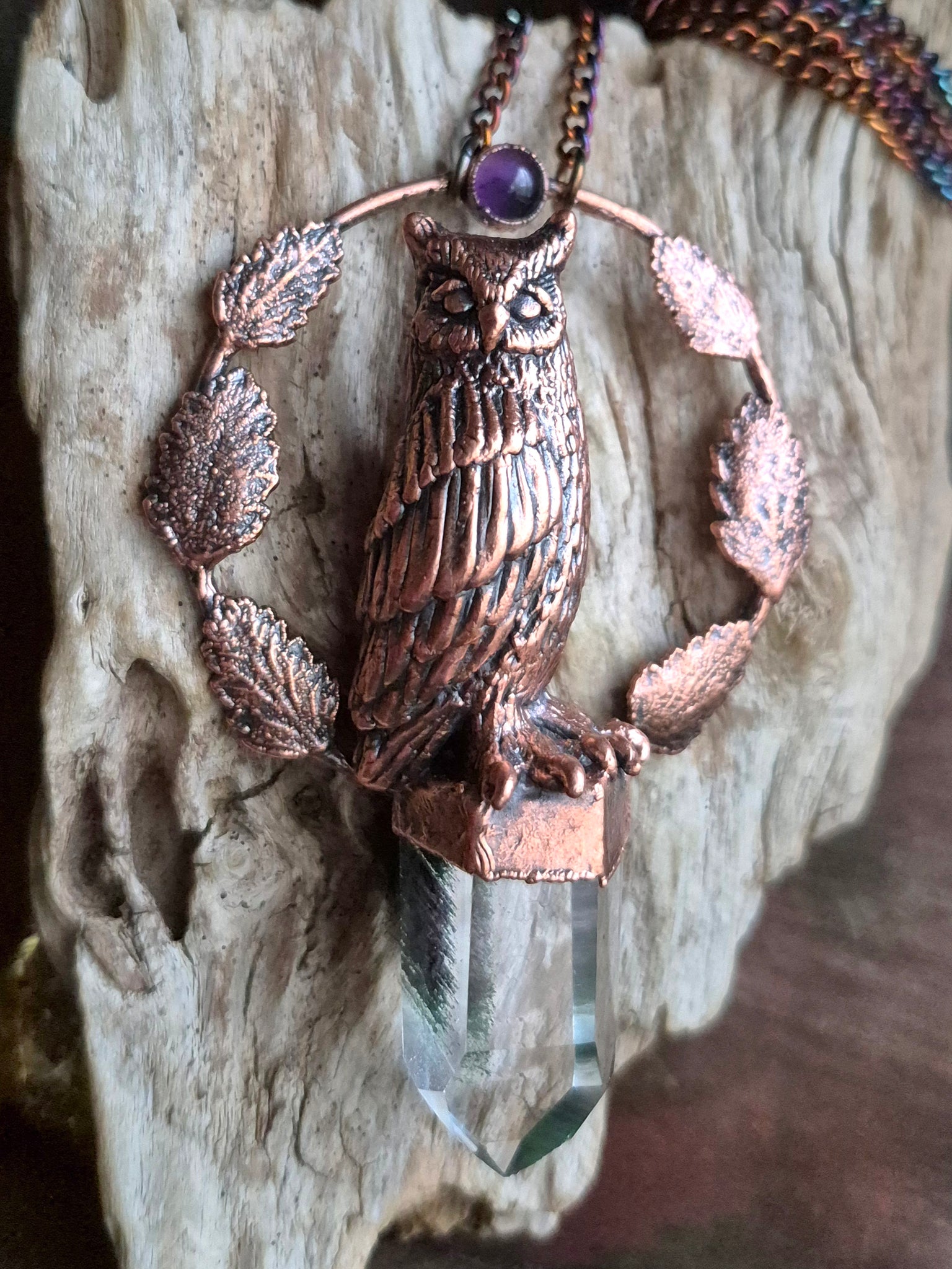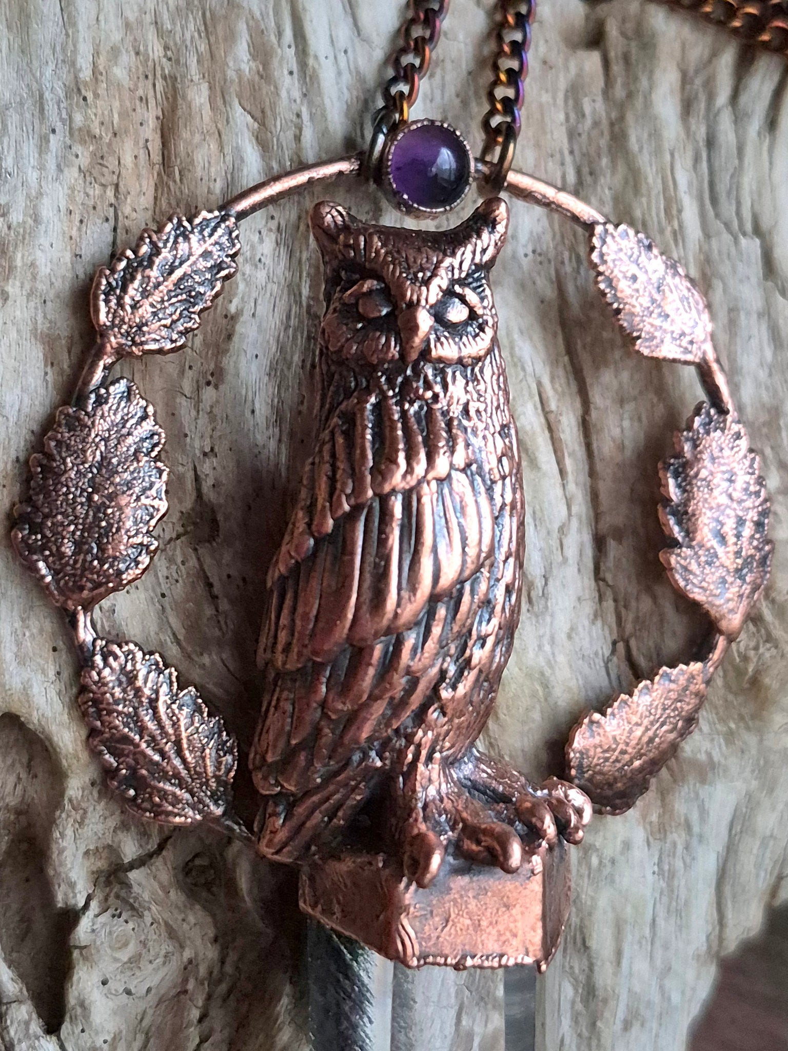 Circondano il gufo sei vere foglioline rese eterne dal rivestimento in rame, a simboleggiare il Profondo legame con il bosco.