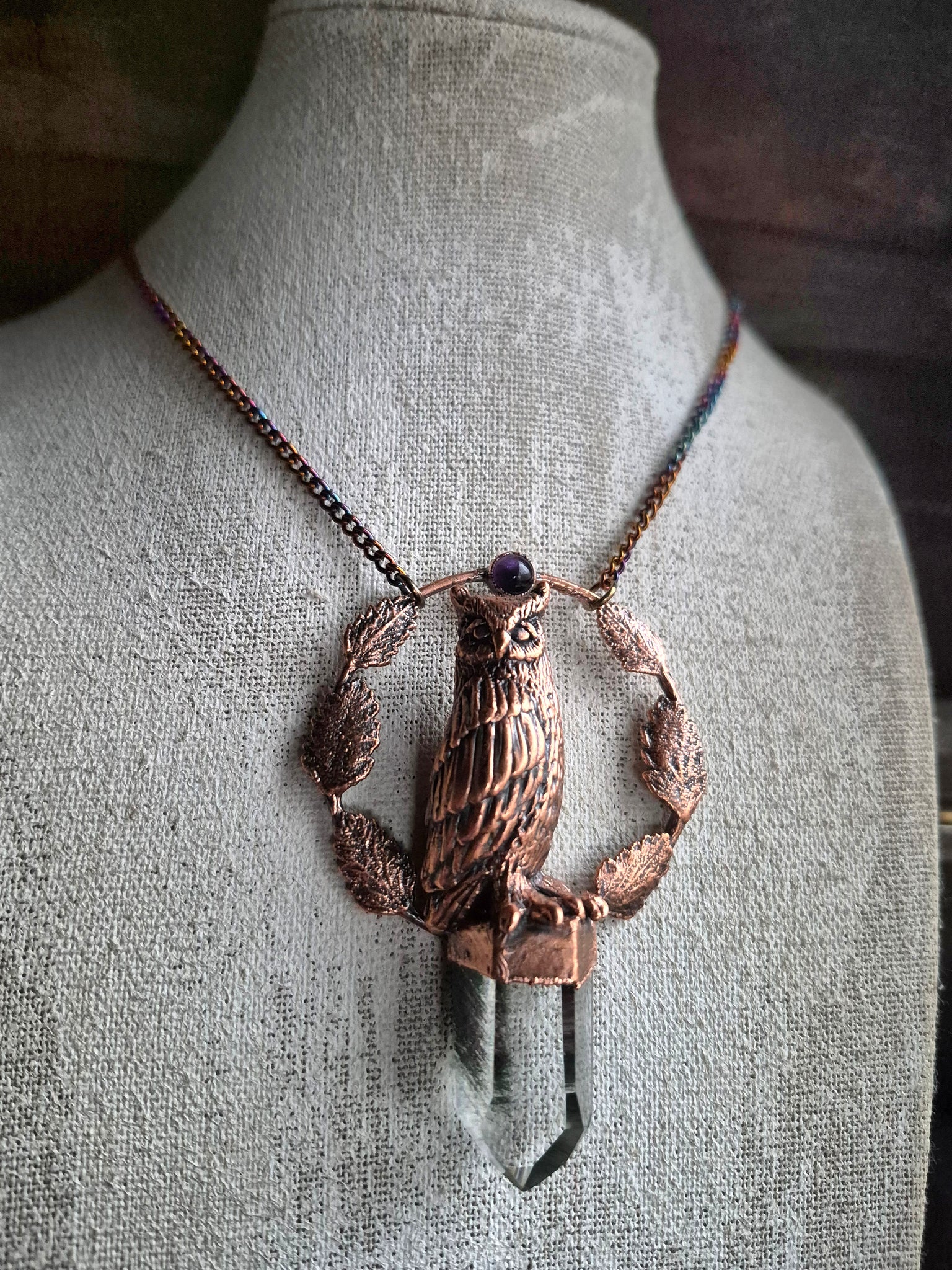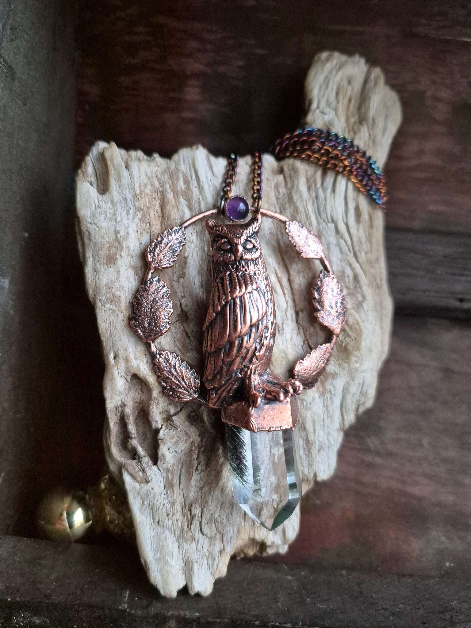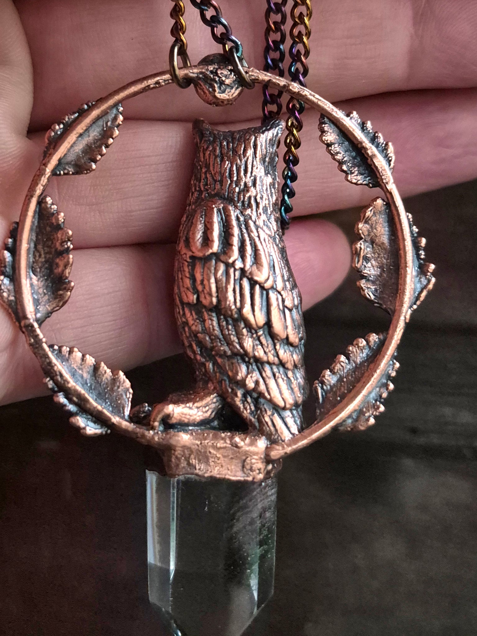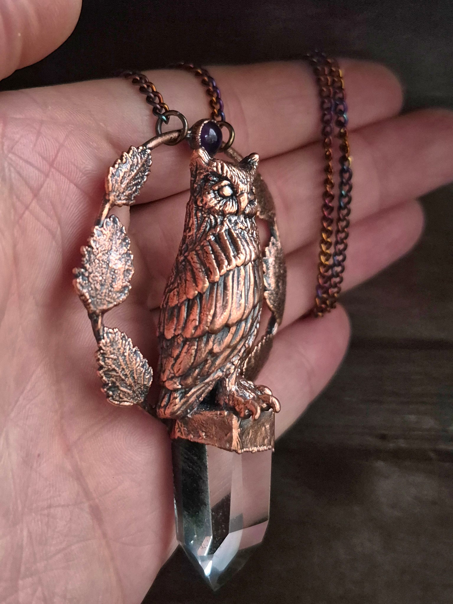 Circondano il gufo sei vere foglioline rese eterne dal rivestimento in rame, a simboleggiare il Profondo legame con il bosco.