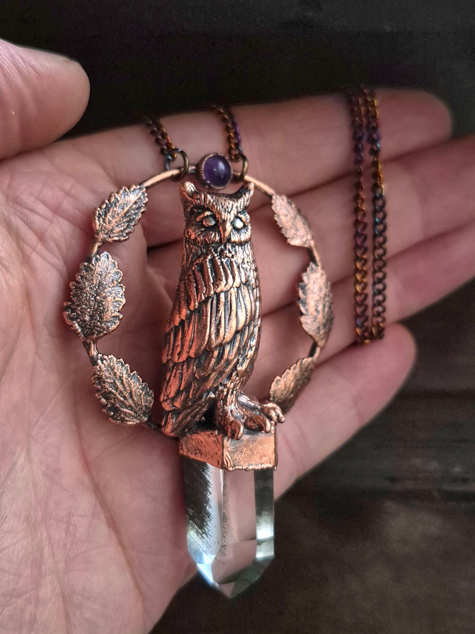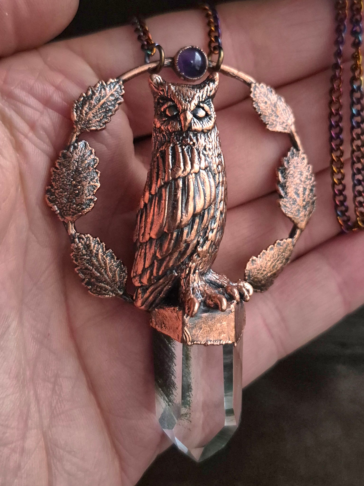 L'Ametista: Una sfera purissima che corona il capo del gufo, custode di una saggezza che trascende il quotidiano.