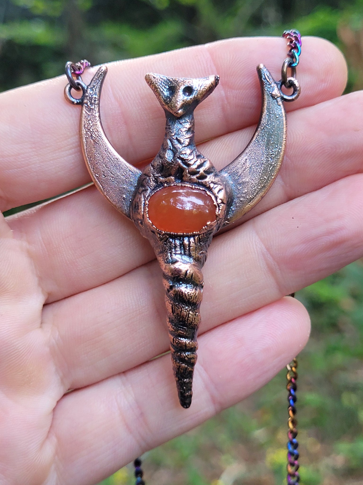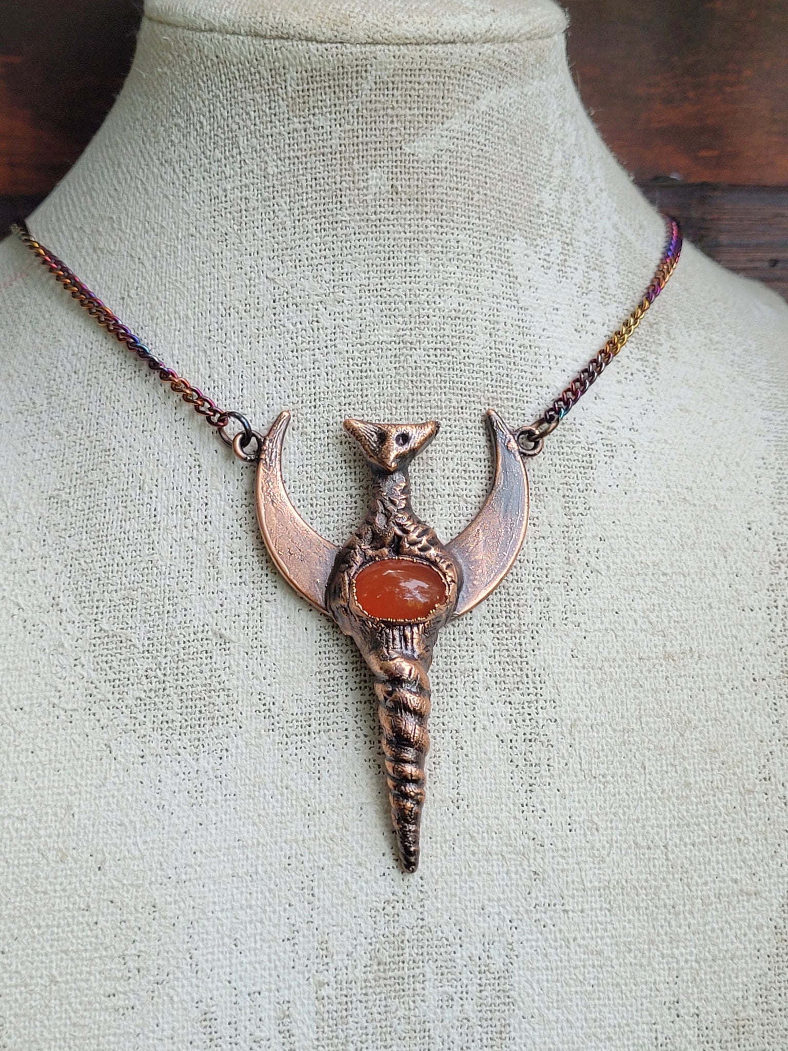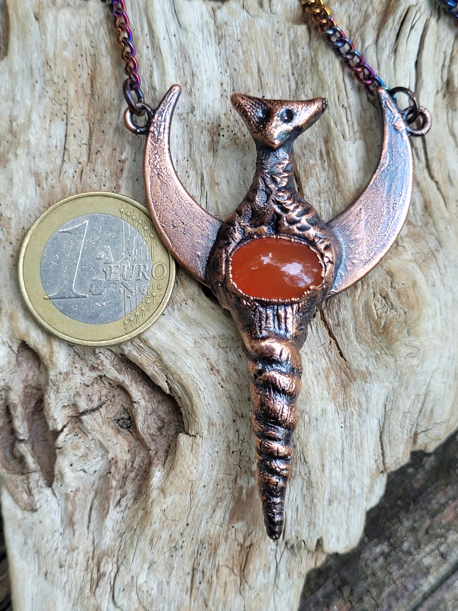 Il gioiello è un pezzo unico realizzato a mano in rame trattato con patina anticante per un aspetto magico e fuori dal tempo, viene fornito con una catenina in acciaio policromo di 45 centimetri.