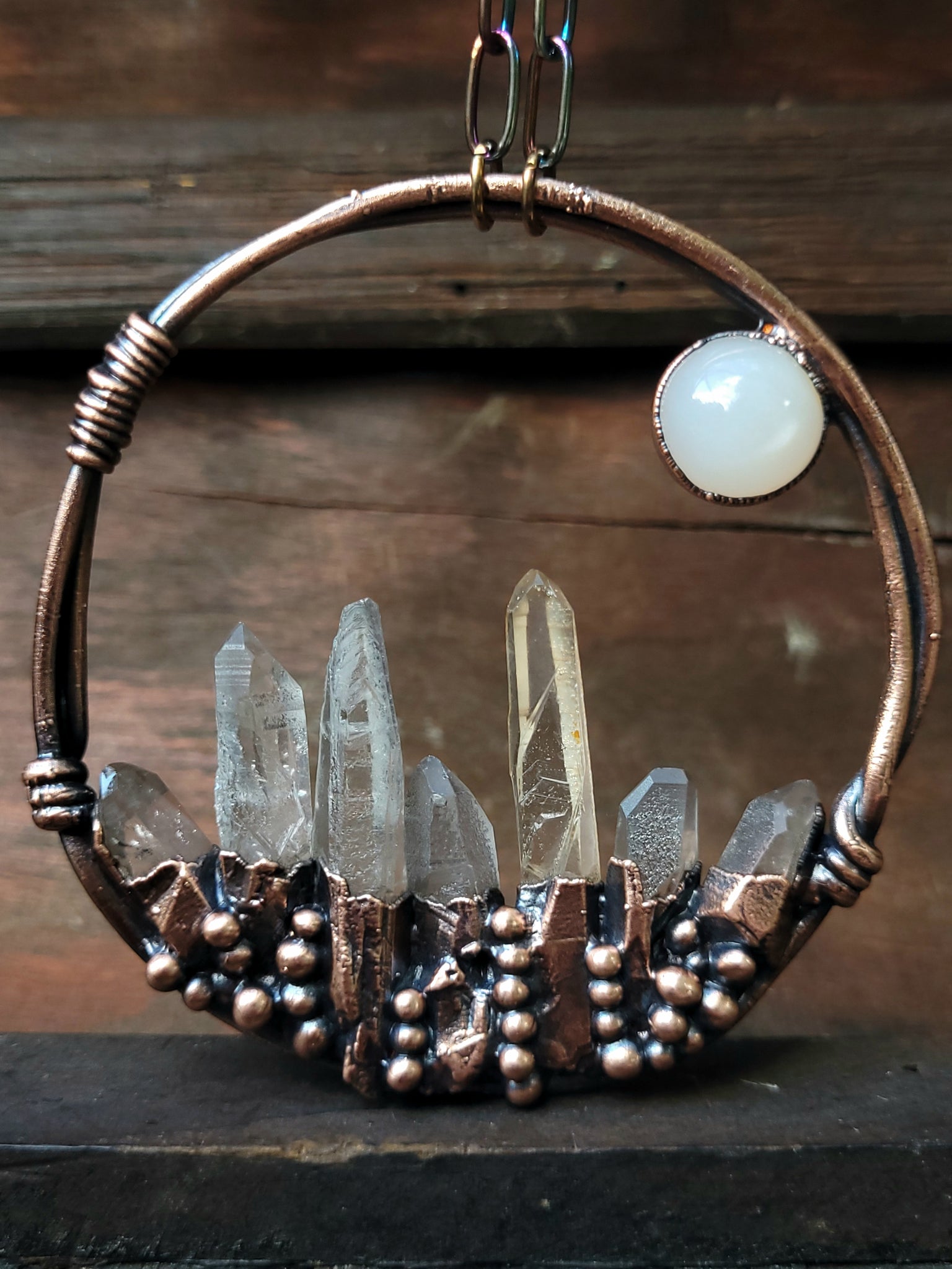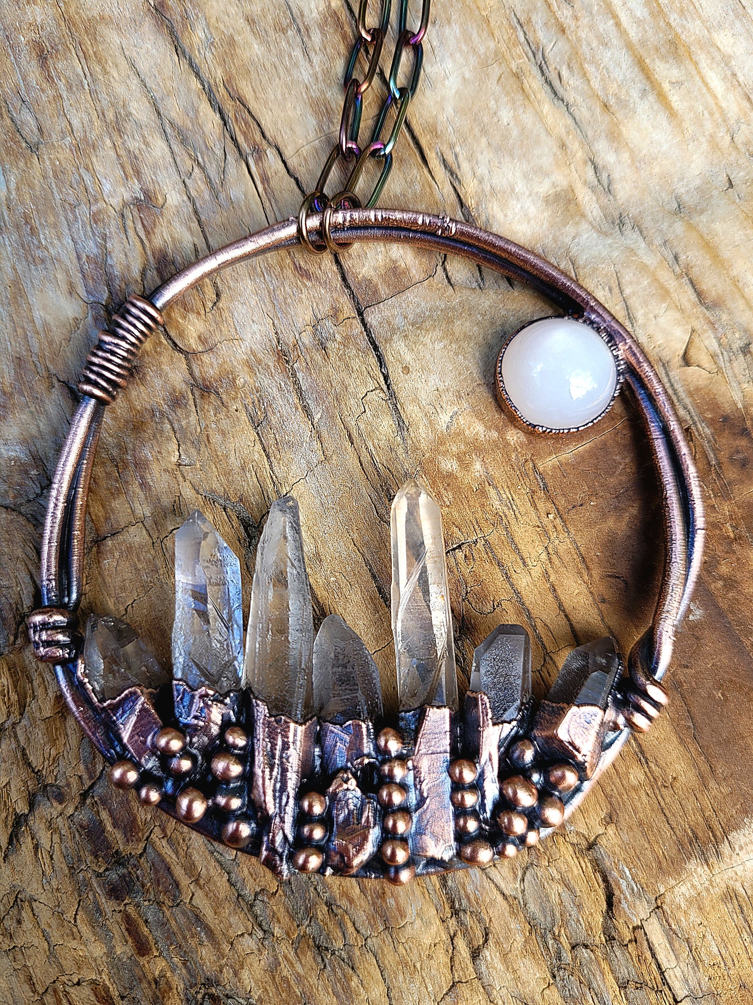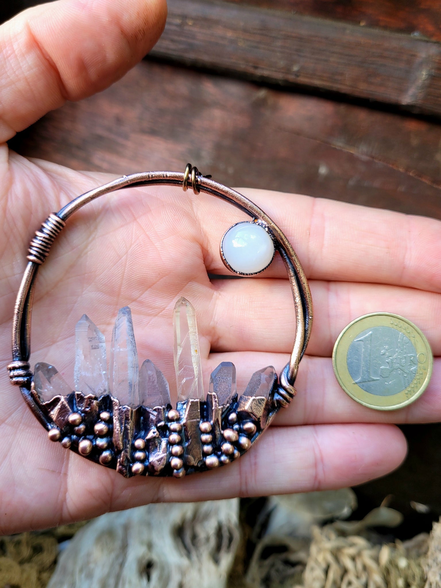 Il gioiello è un grande e vistoso monile in cui punte grezze di Quarzo ialino si stagliano verso una luna piena in Adularia.