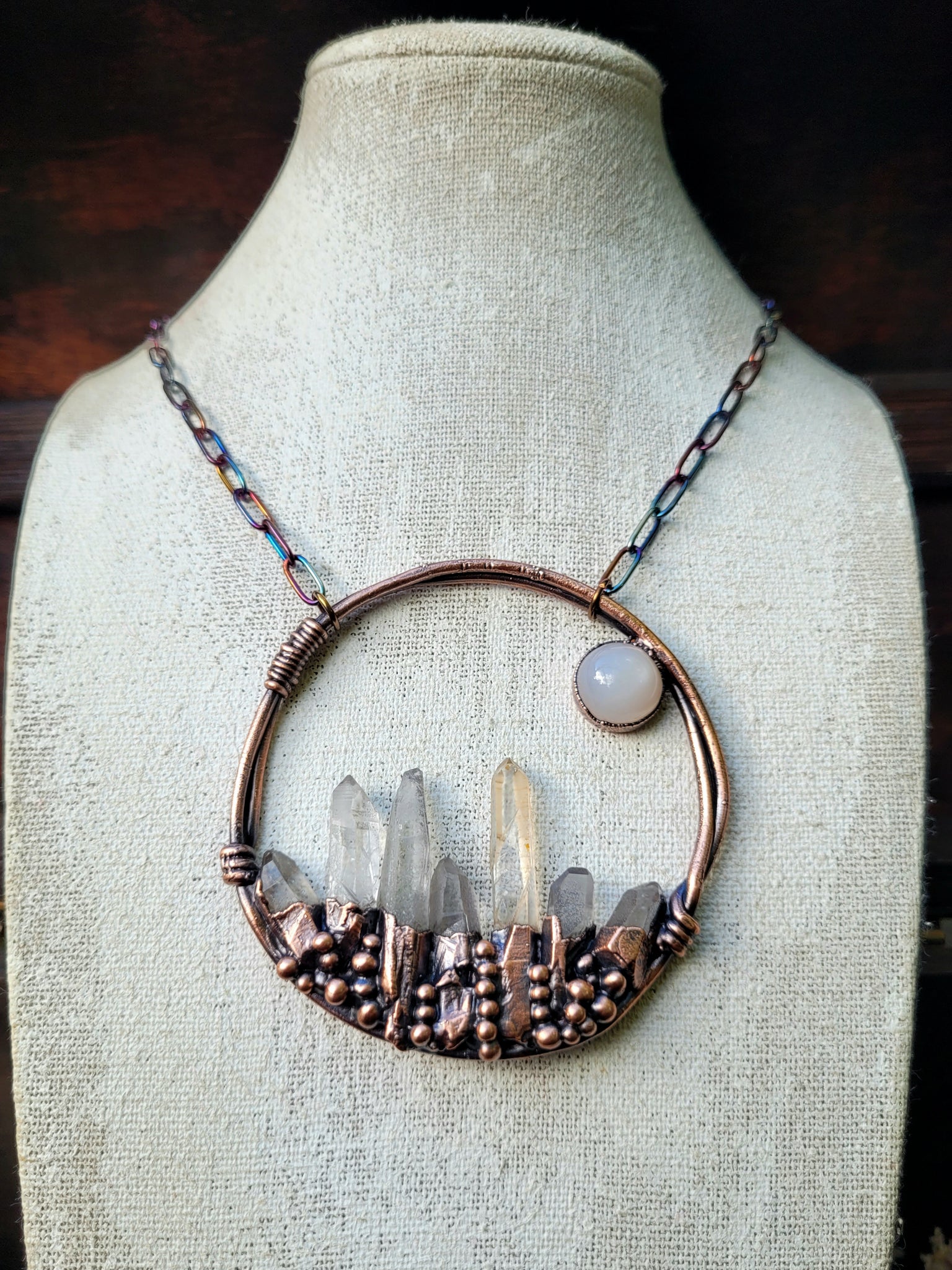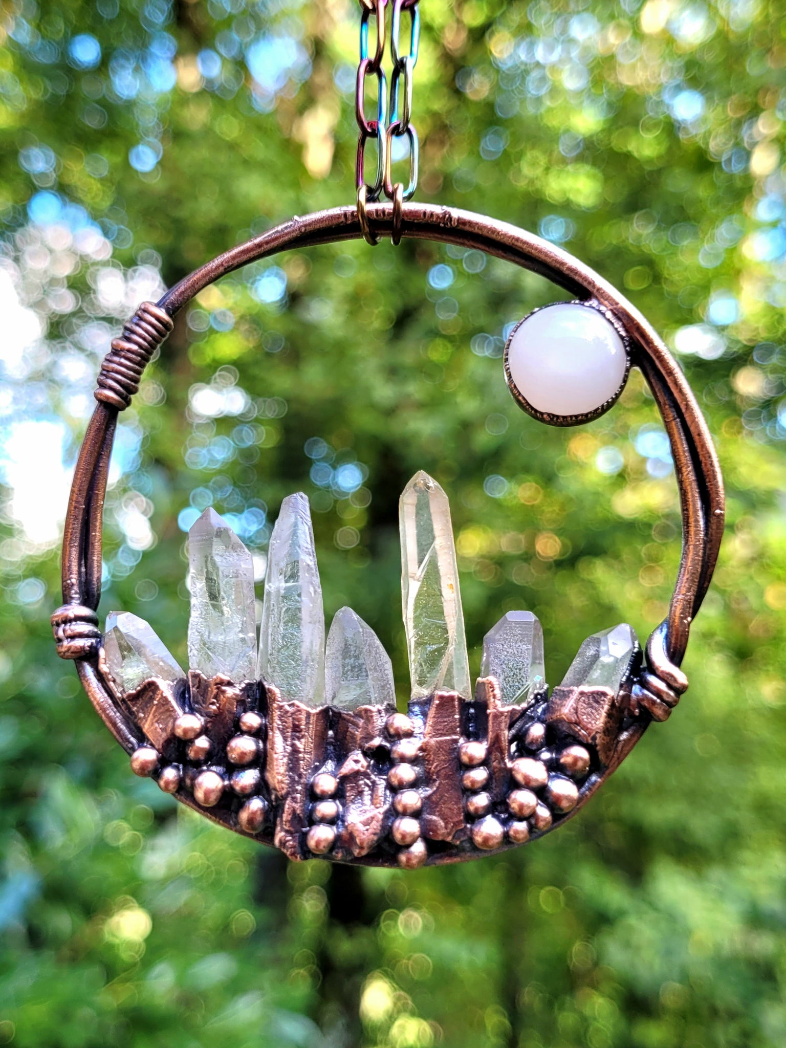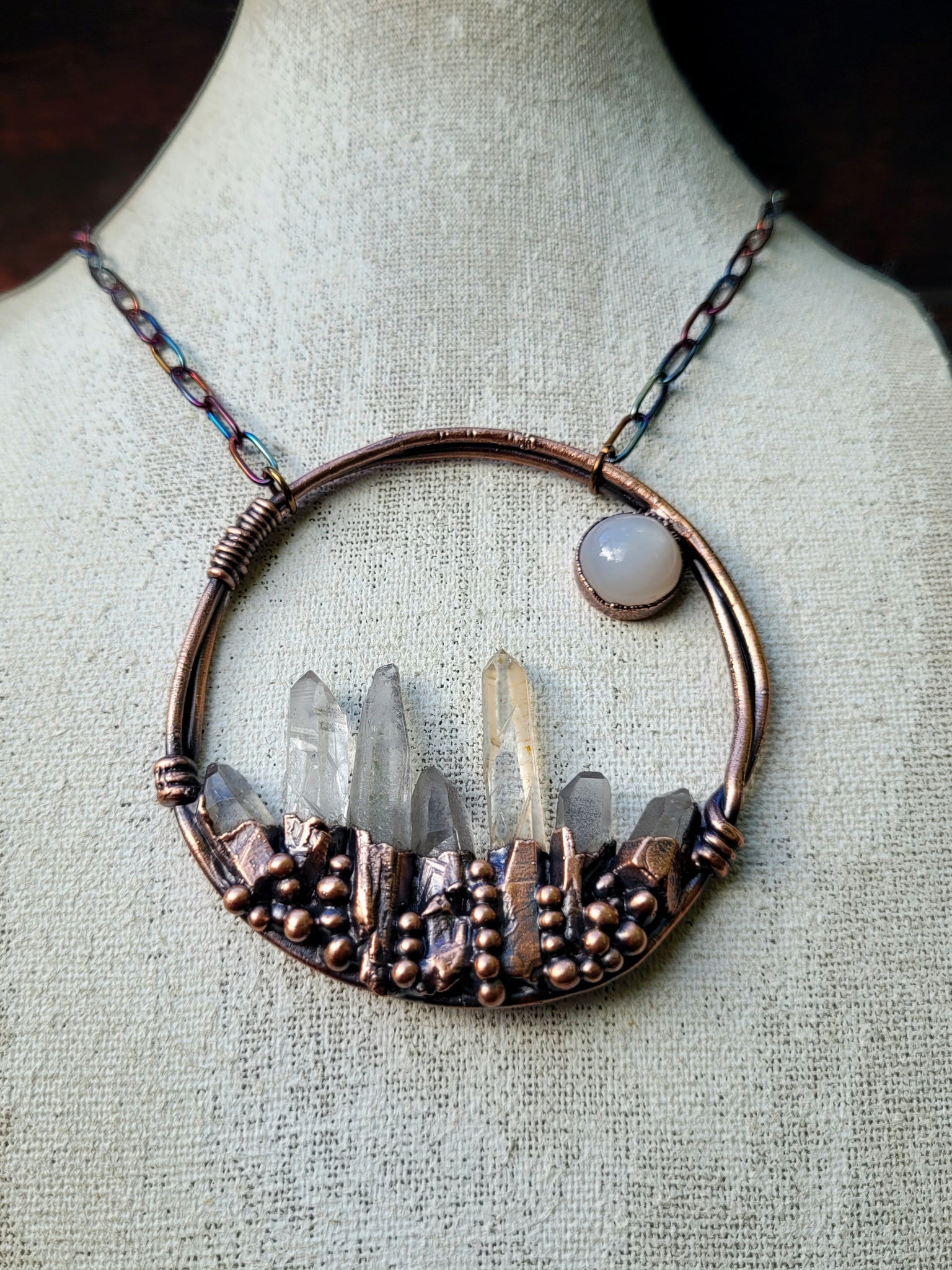 Il gioiello è un grande e vistoso monile in cui punte grezze di Quarzo ialino si stagliano verso una luna piena in Adularia.