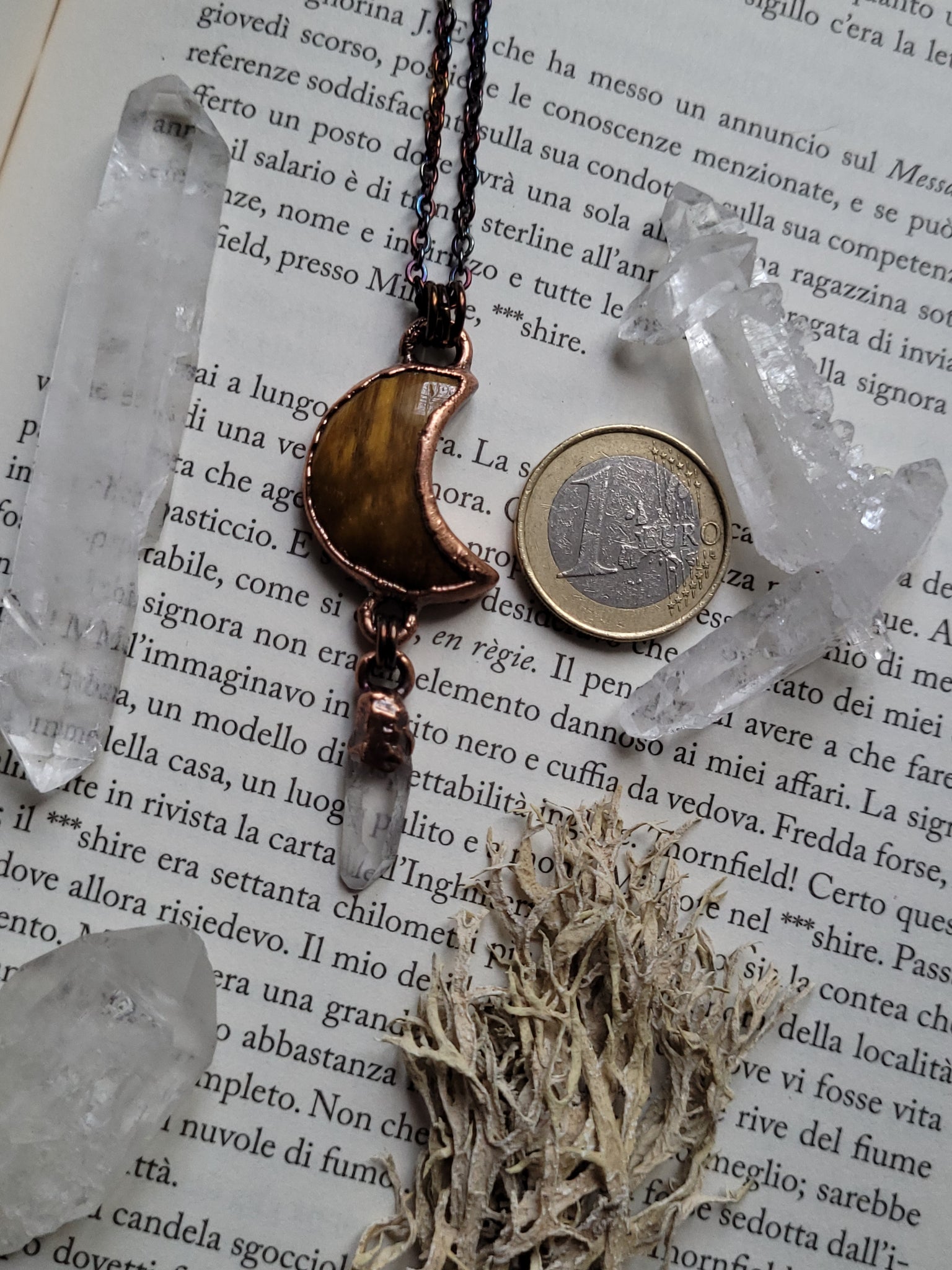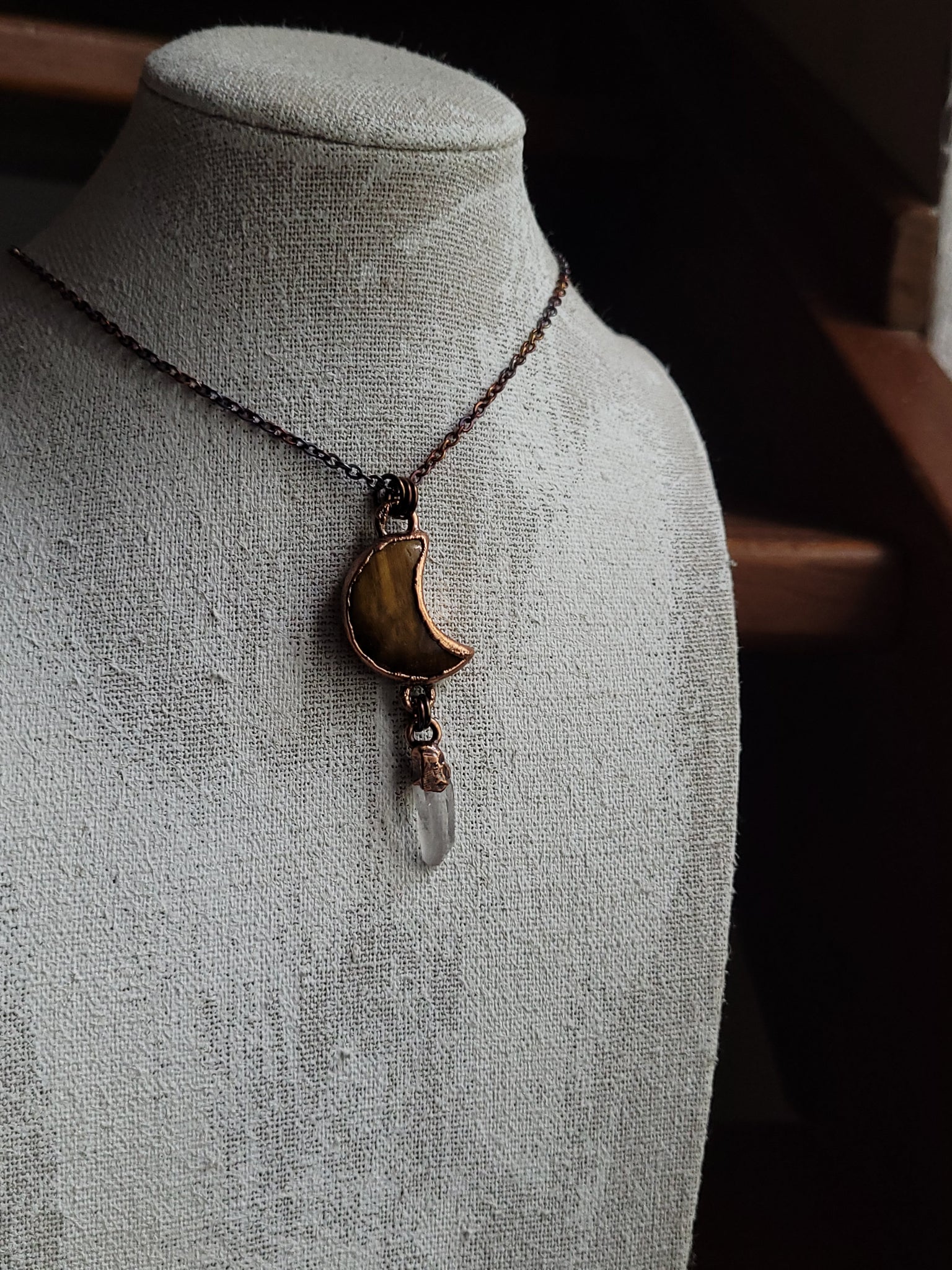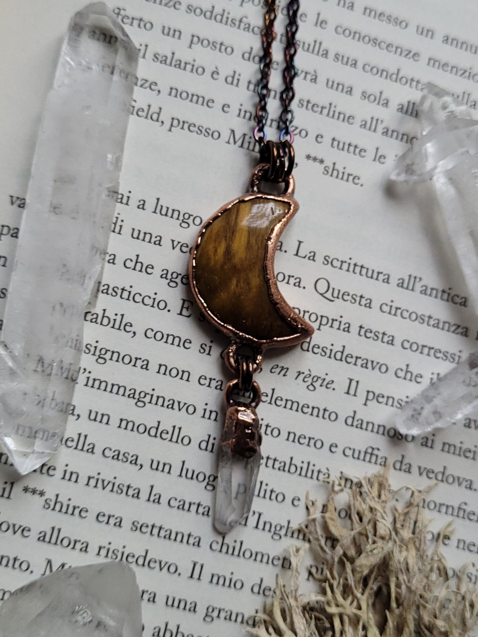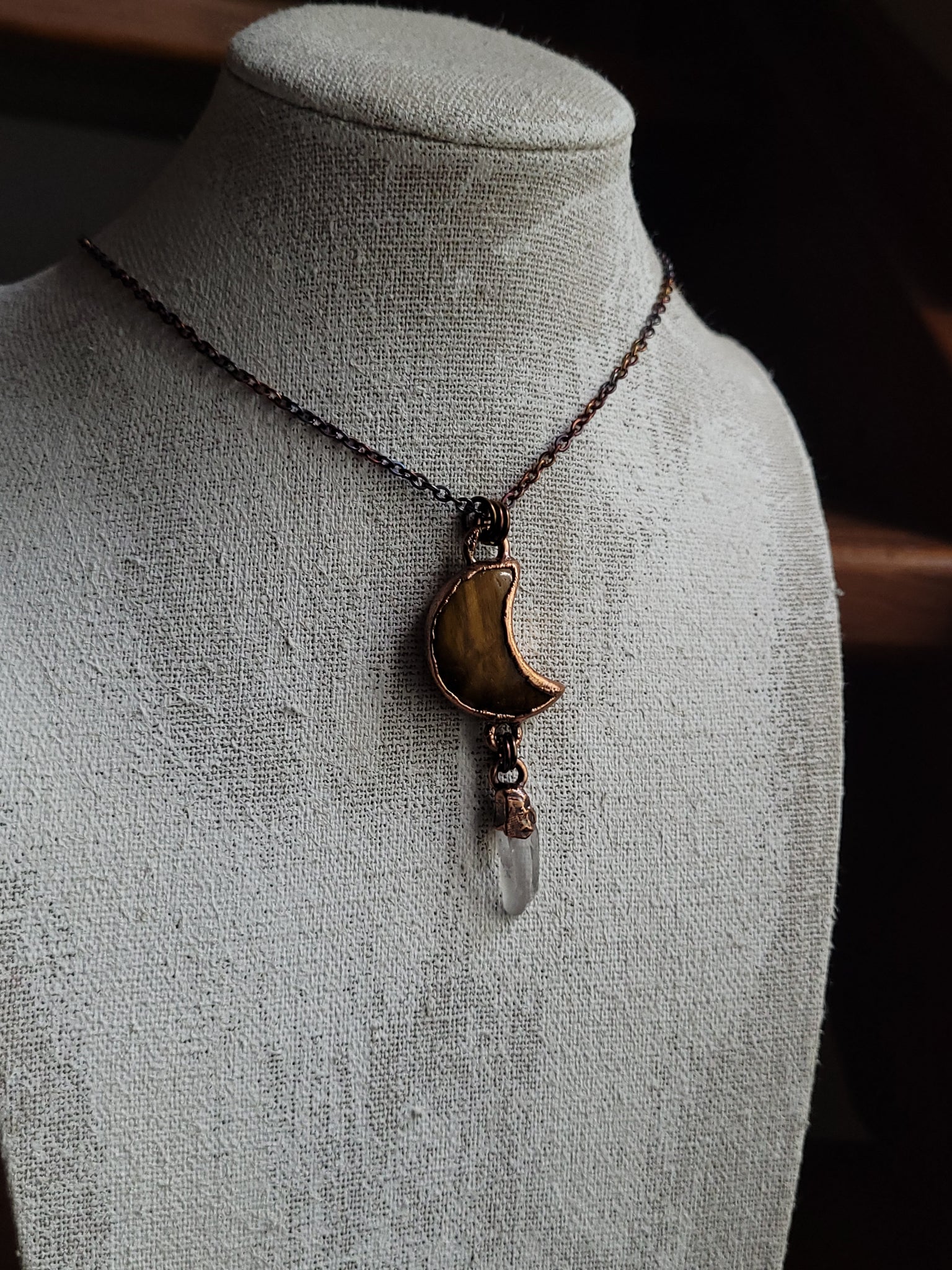 In questo gioiello, una lacrima di cristallo di rocca sgorga da una bellissima falce di luna in Occhio di tigre.