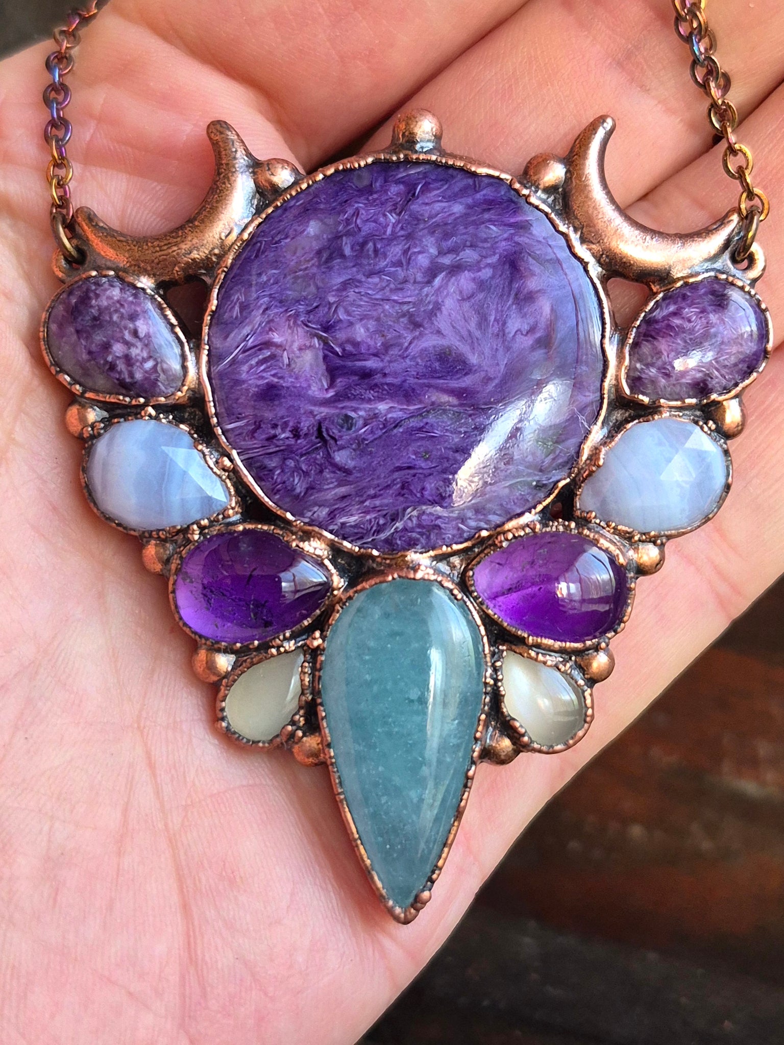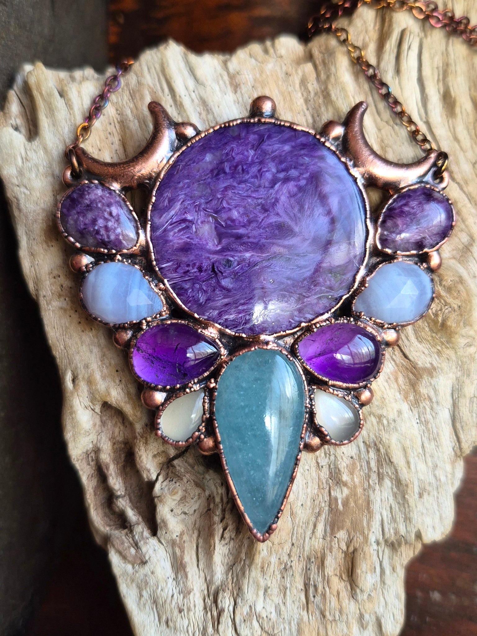 L'Energia del Femminino Sacro: Due gocce di Adularia (Pietra di Luna) e falci di luna in rame onorano la natura ciclica e il mistero lunare, connettendo chi lo indossa alle maree interiori dell'intuizione.