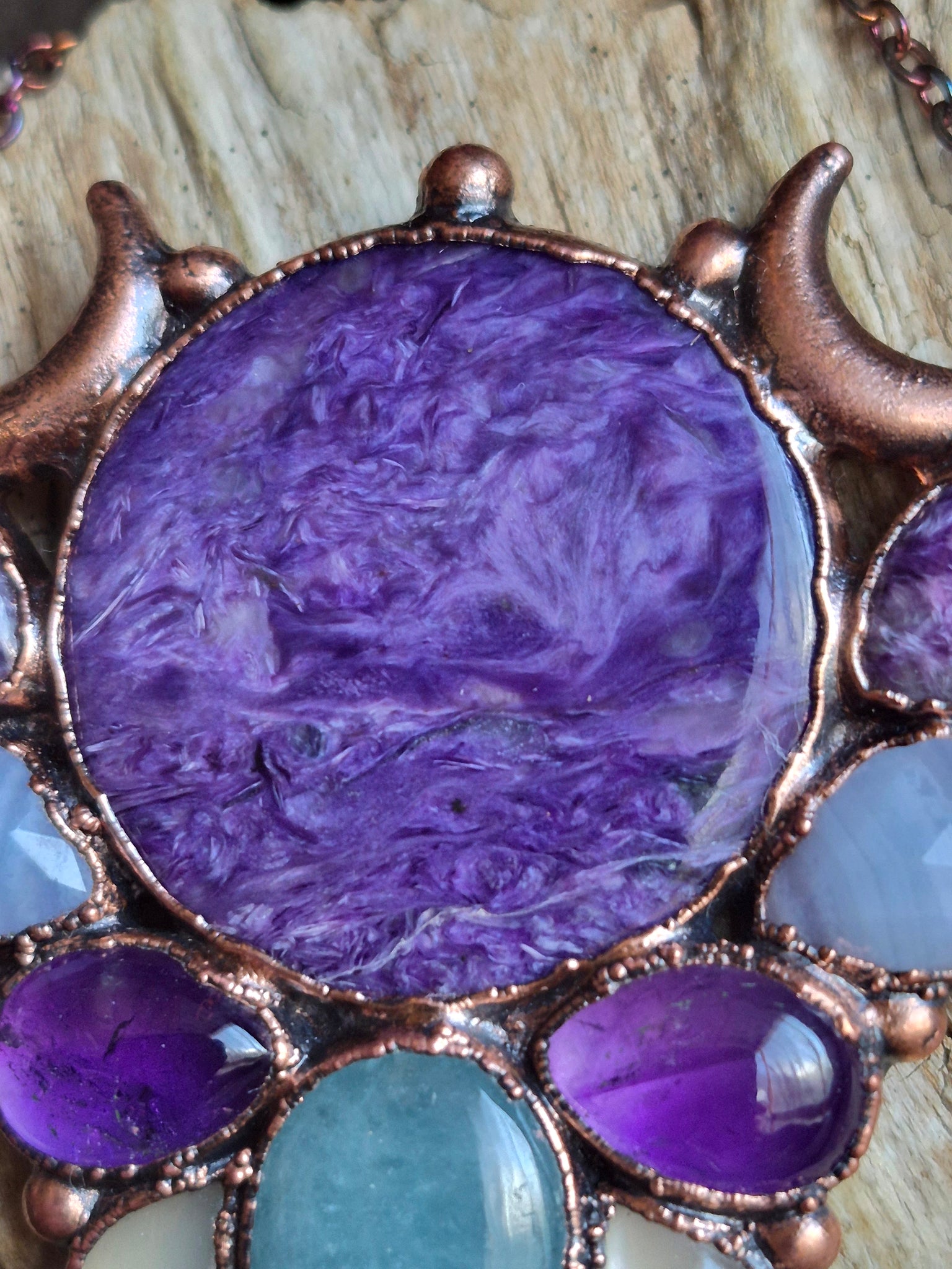 Il Cuore di Charoite: Un grande tondo centrale dalle venature viola profonde, simbolo della trasmutazione, richiamato ritmicamente dalle gocce sia in Charoite che in Ametista. È il colore dei primi fiori che sfidano il freddo: crocus, anemoni e viole.