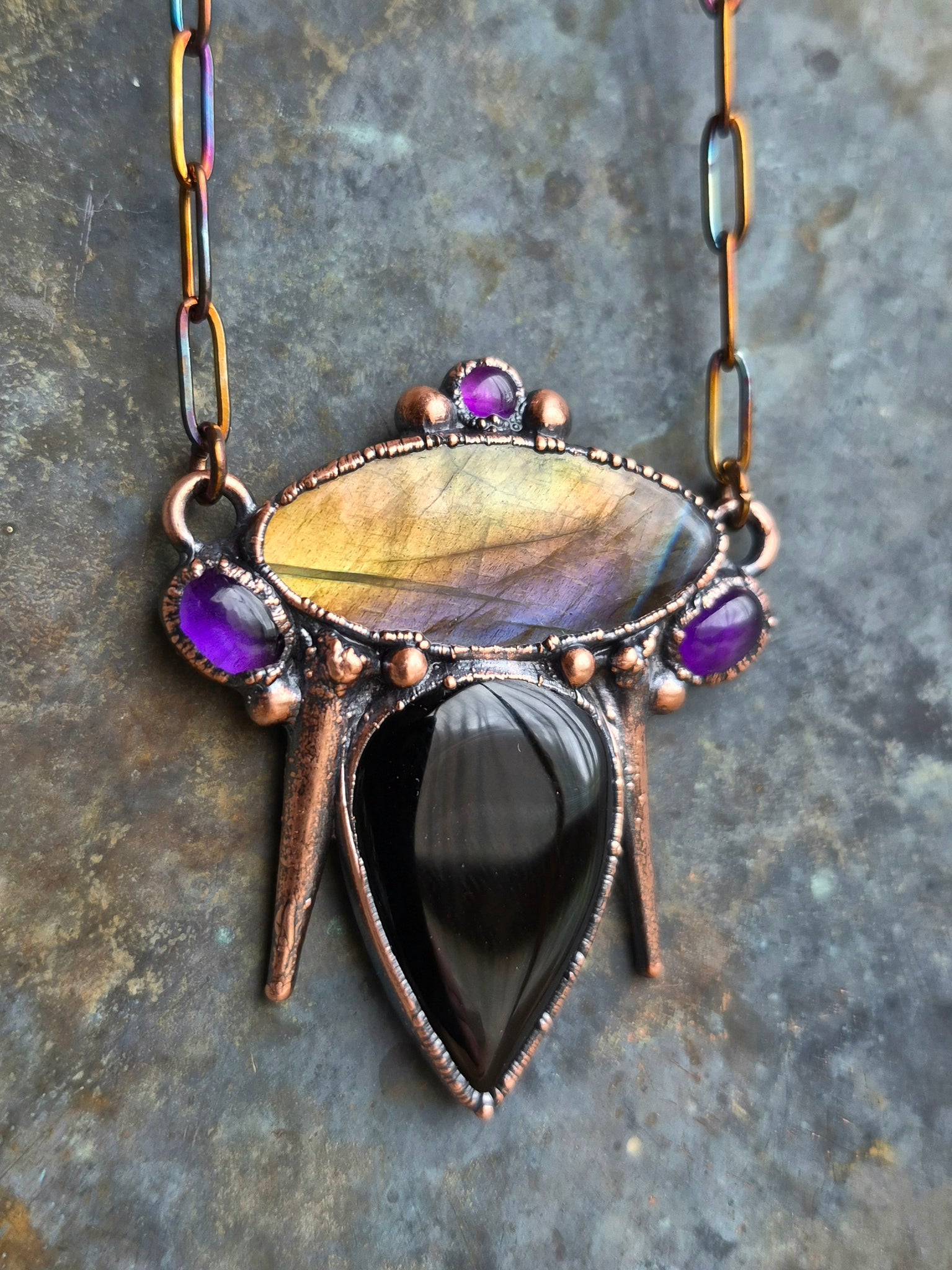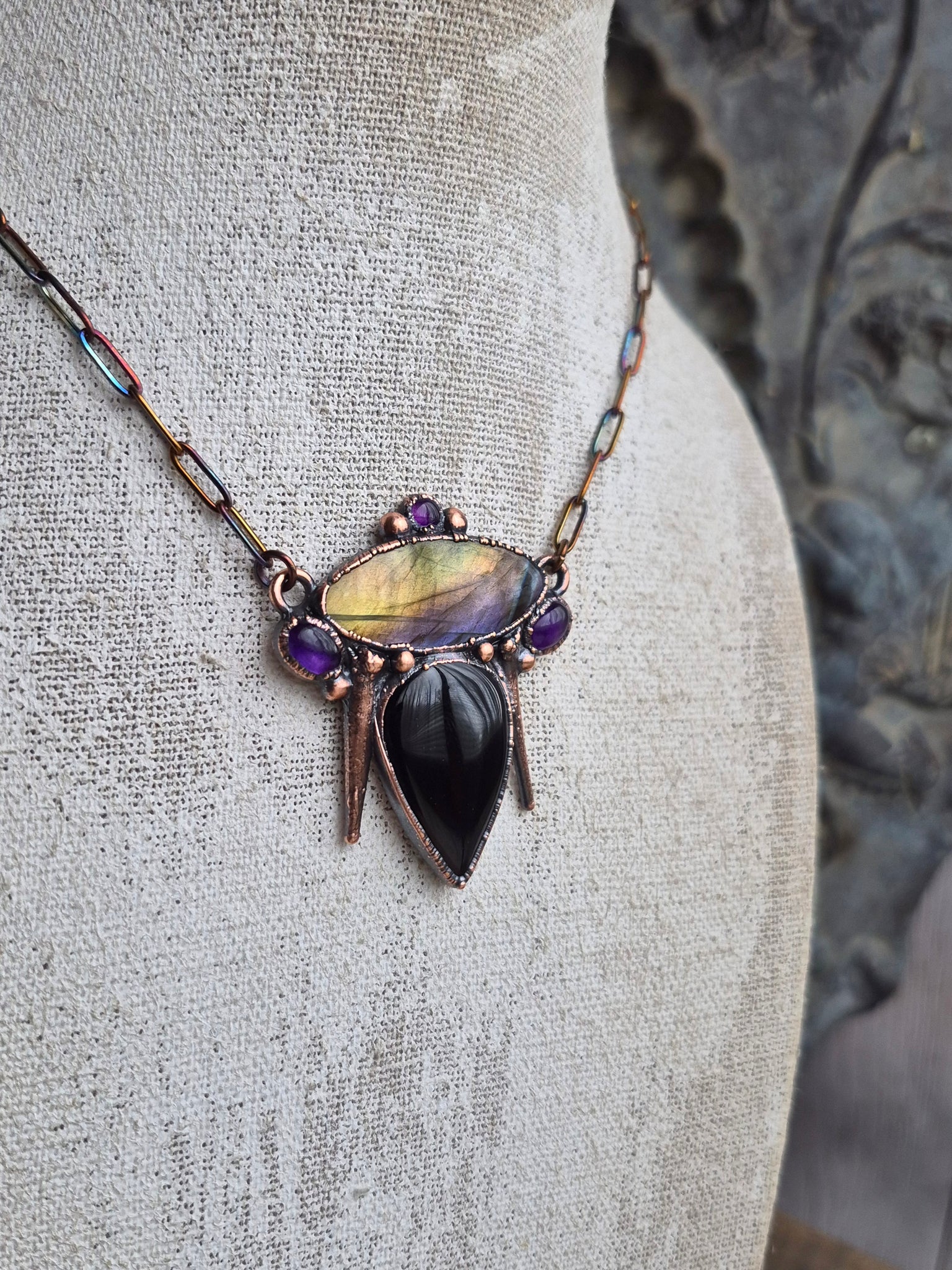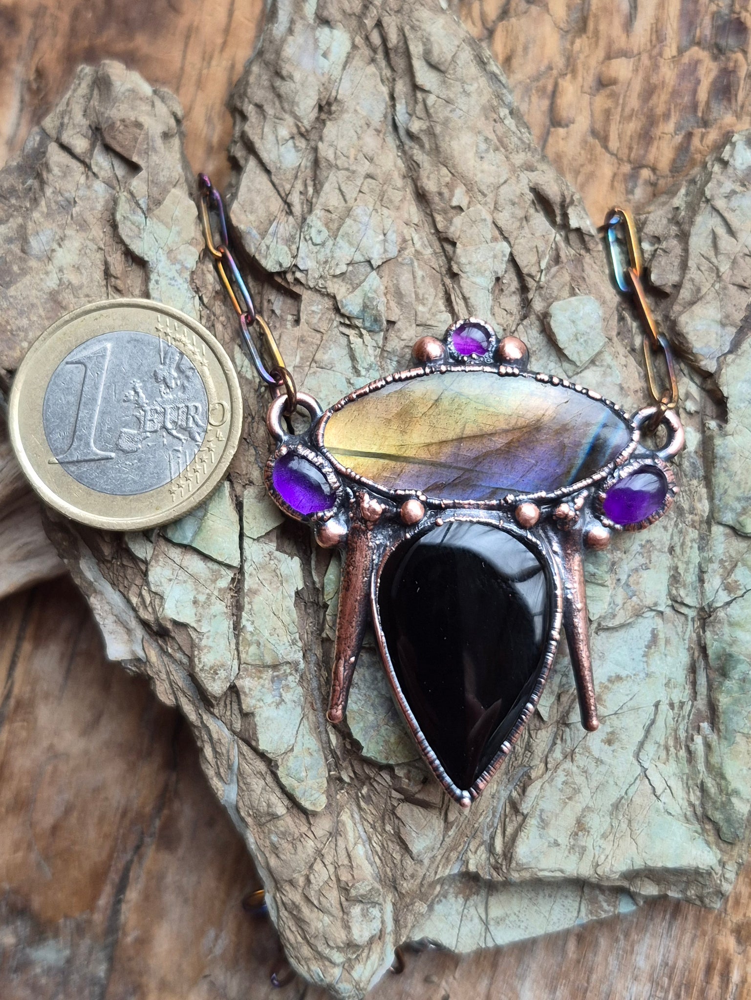 Il gioiello è realizzato in Rame trattato con patina anticante per un aspetto magico e fuori dal tempo, viene fornito con una catenina in acciaio policromo di 43 centimetri