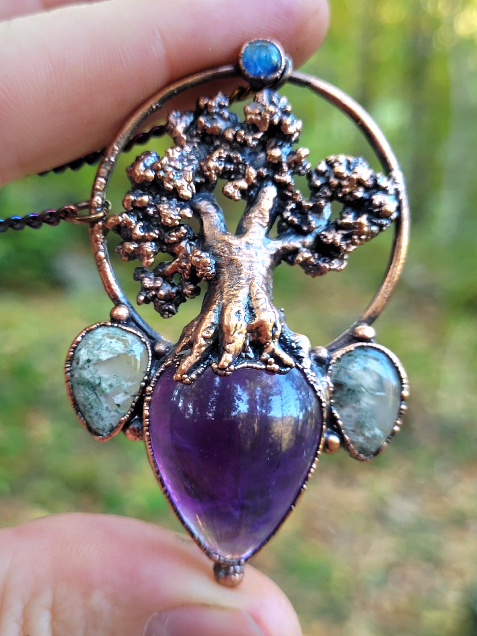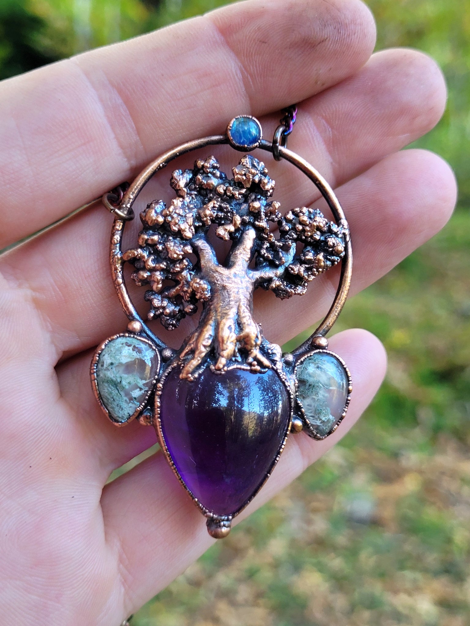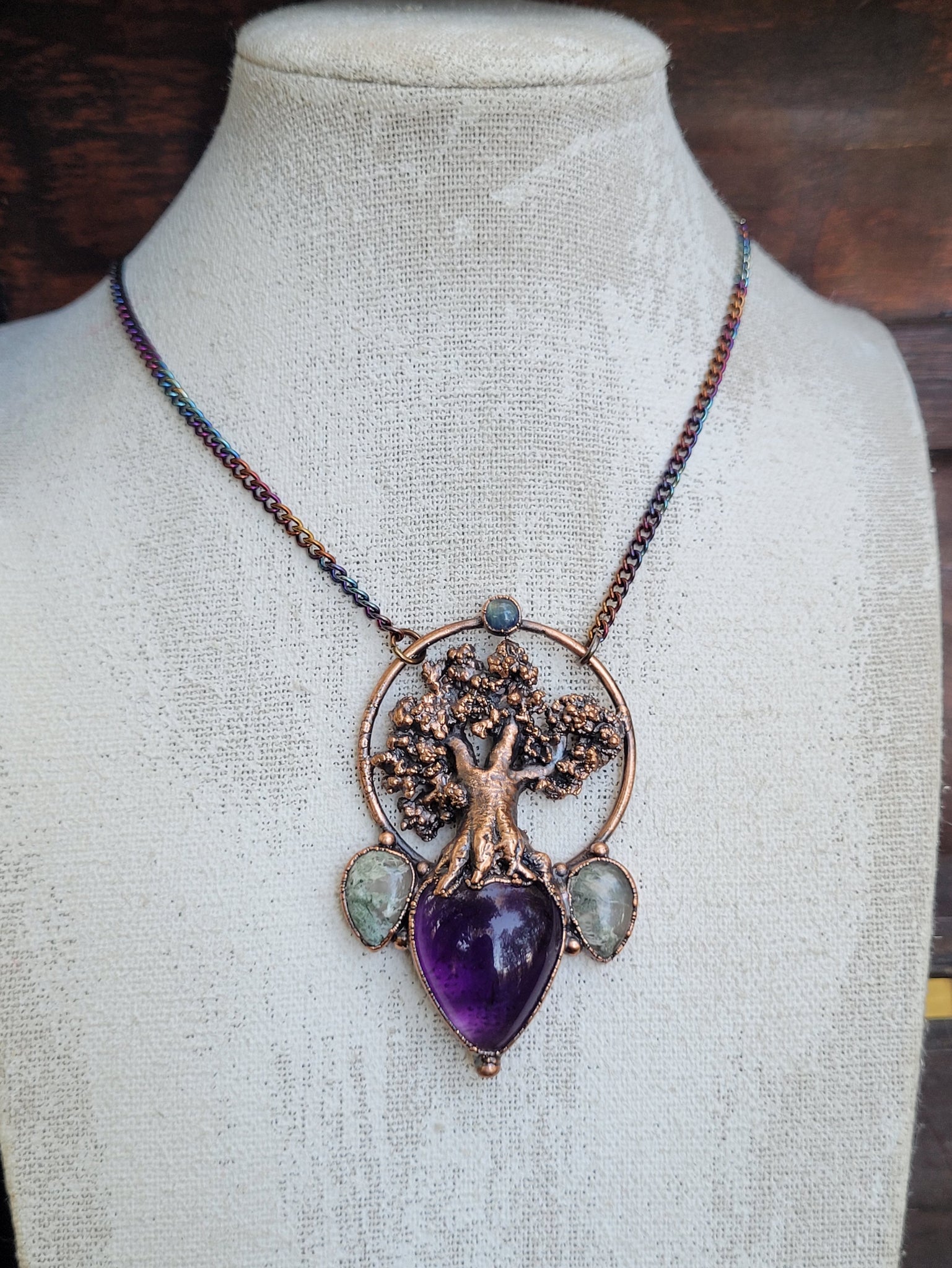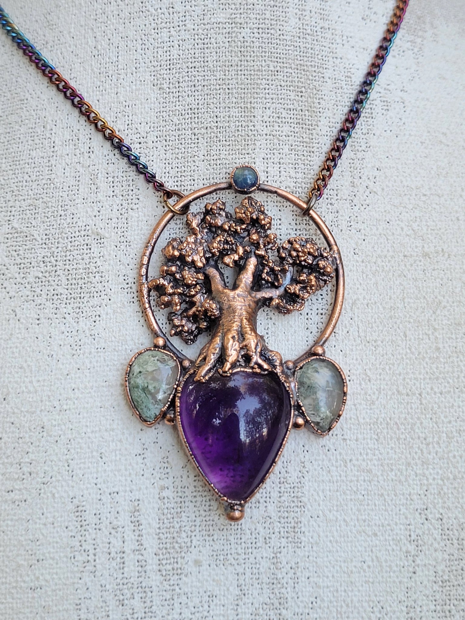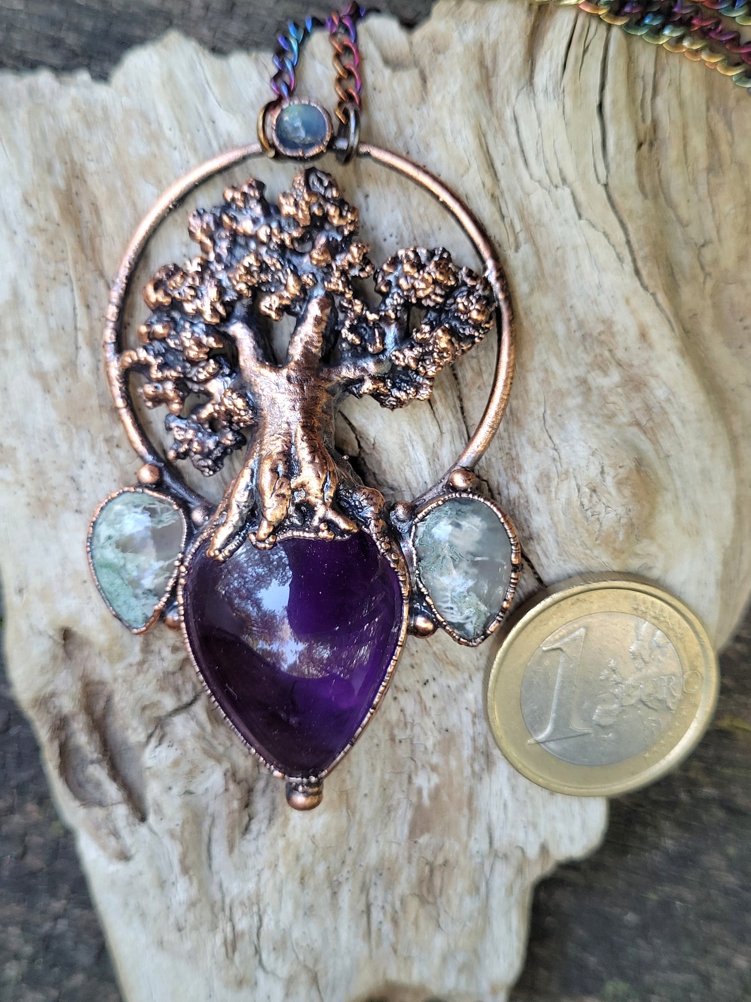 La figura del faggio è realizzata completamente a mano, il rame di cui è composto il monile è trattato con una patina anticante per un aspetto magico e fuori dal tempo, viene fornito con una catenina in acciaio policromo di 45 centimetri