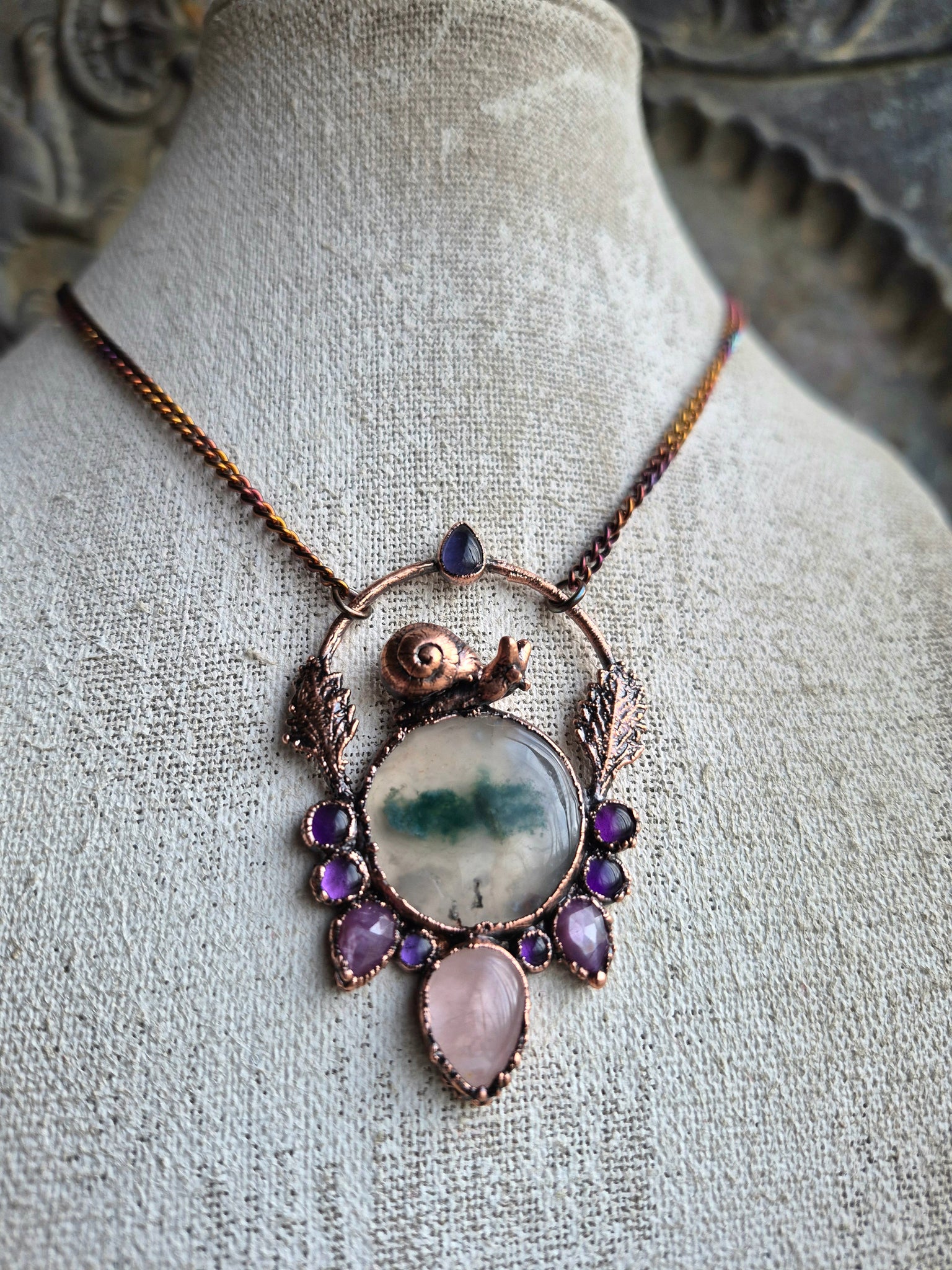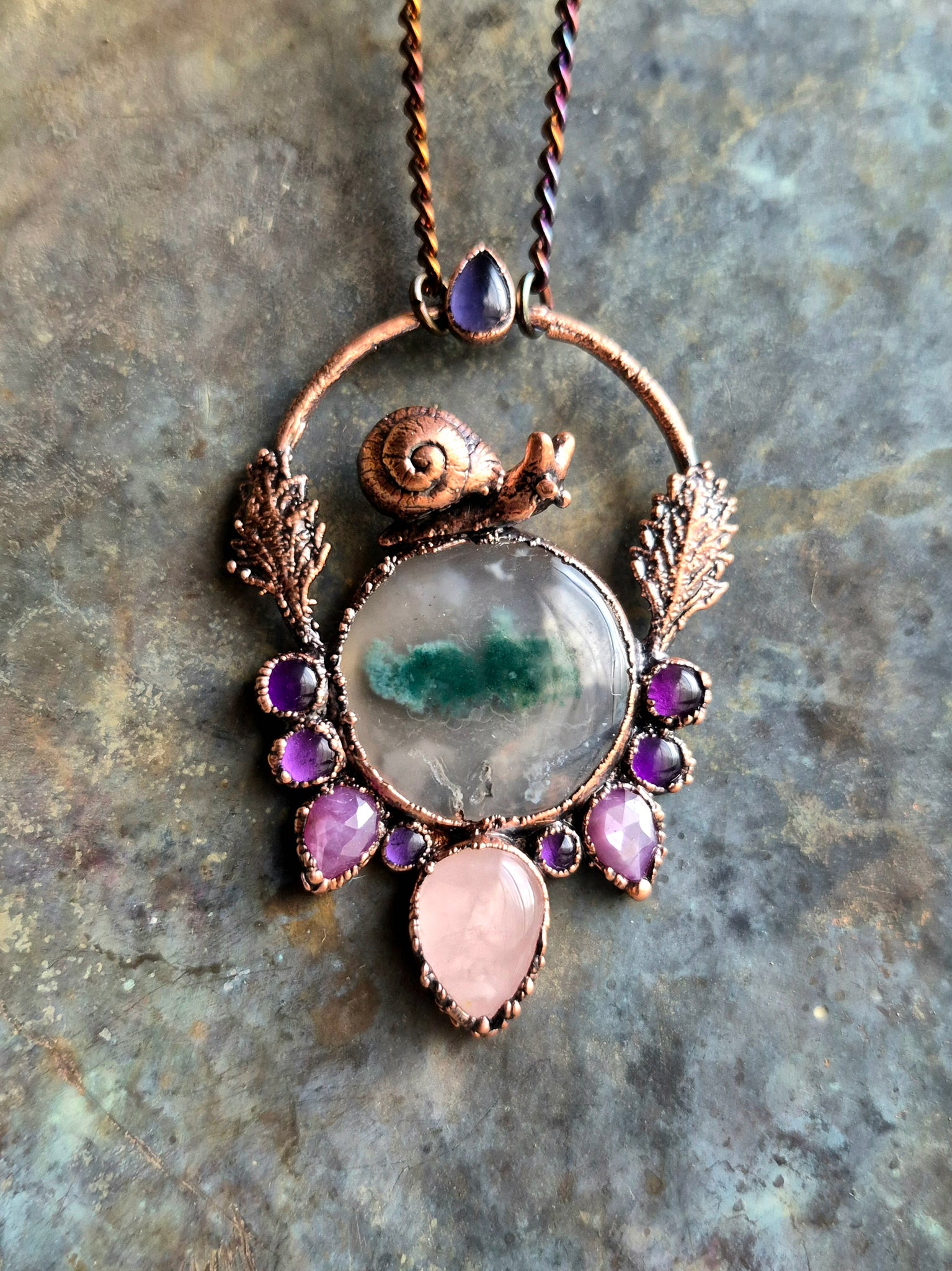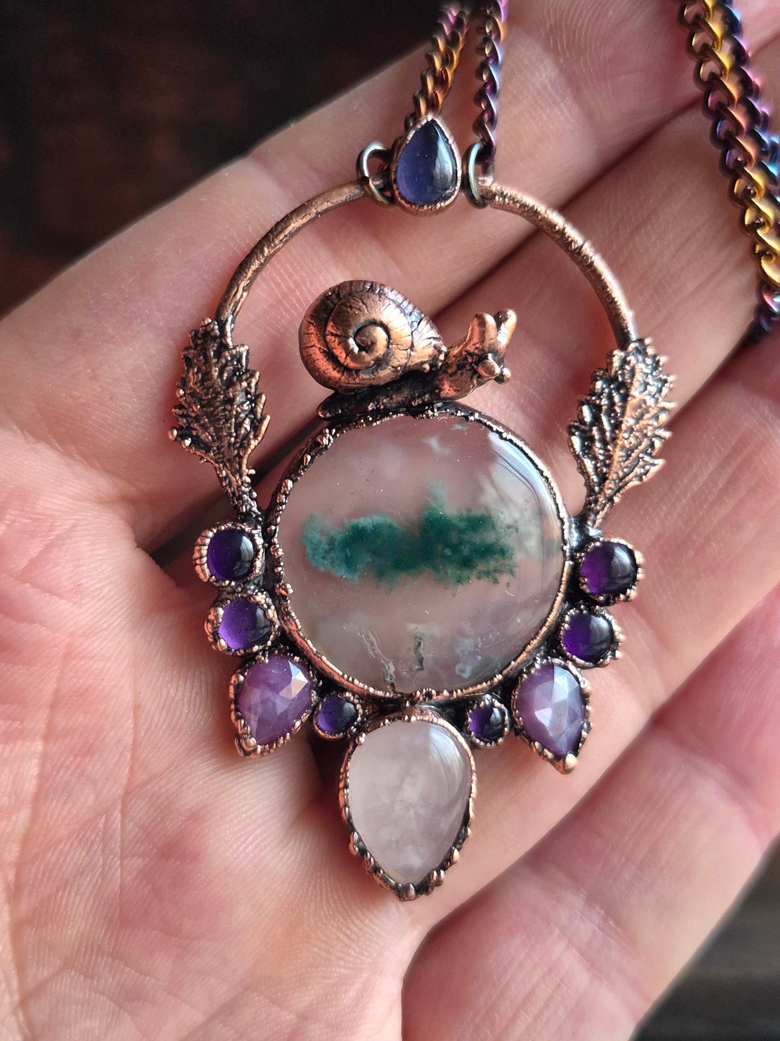 Questo pendente, opera unica d'arte orafa e spirituale, è un omaggio tangibile alla perseveranza. La chiocciola in rame, con la sua spirale aurea, simboleggia il percorso della vita: un viaggio da compiere con calma, portando con sé la propria casa, la propria storia.