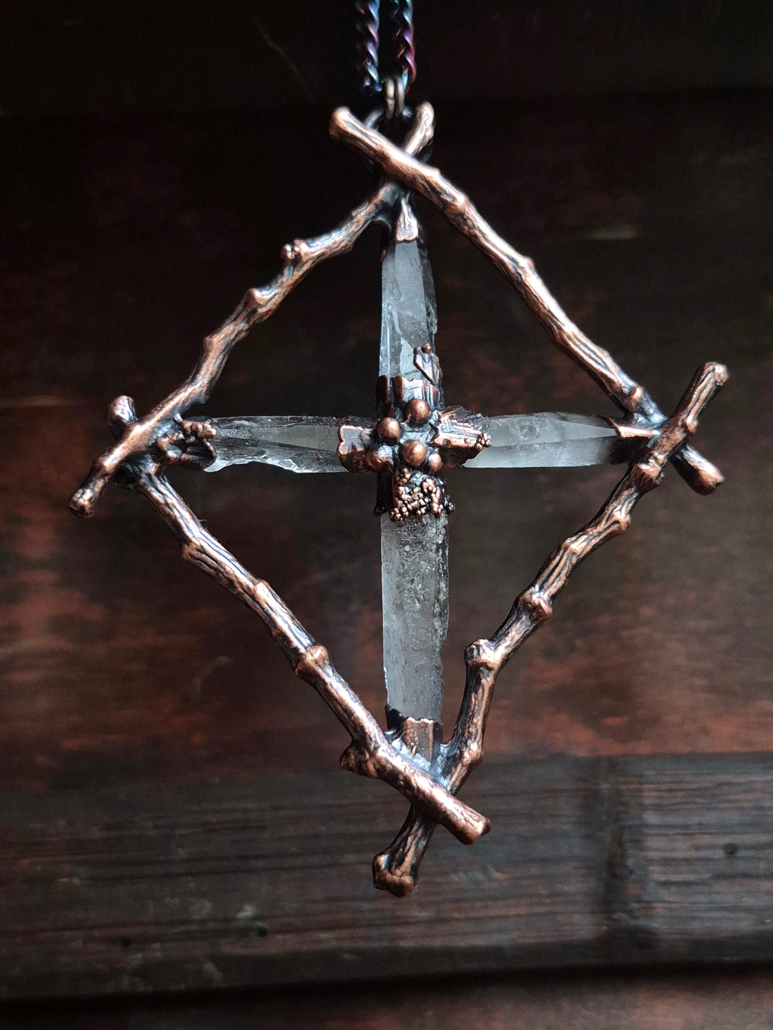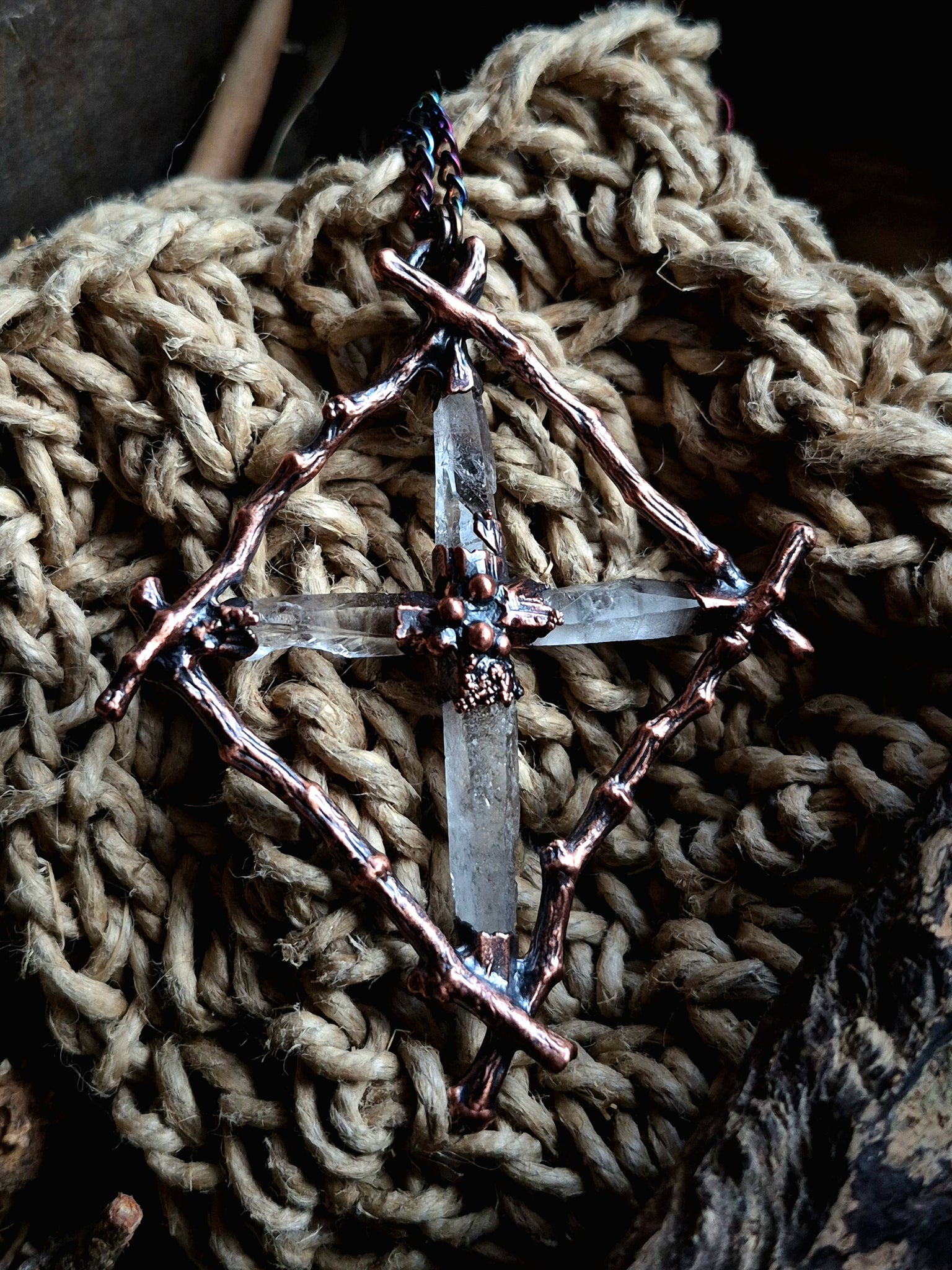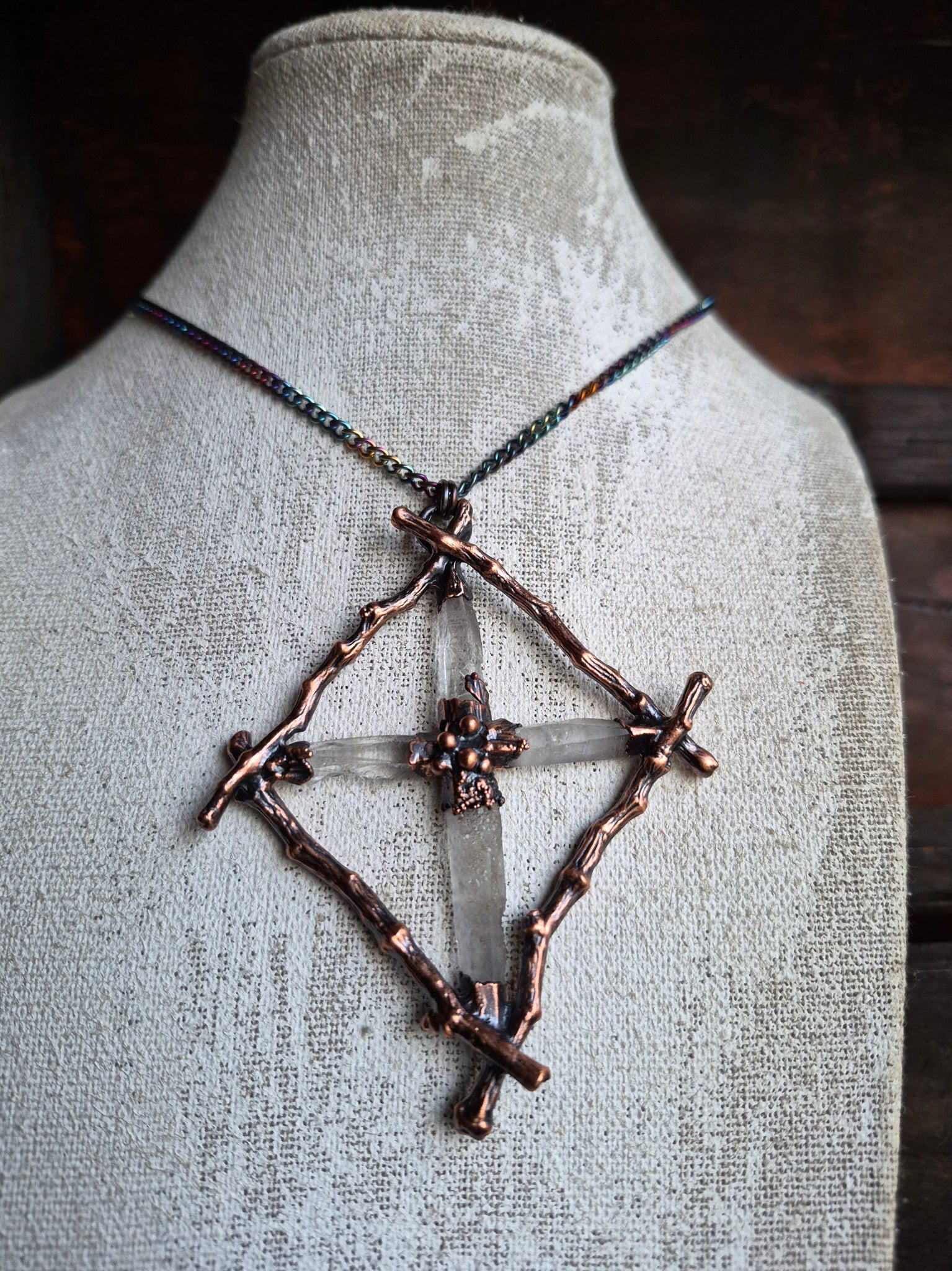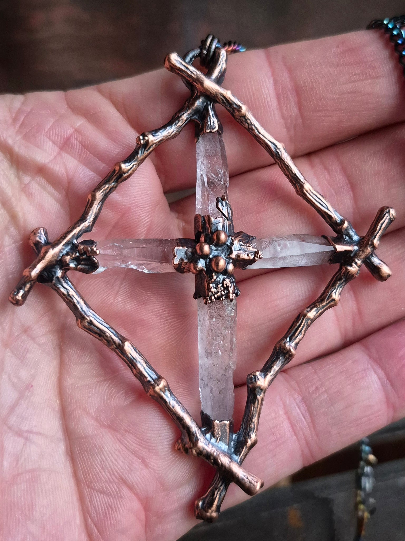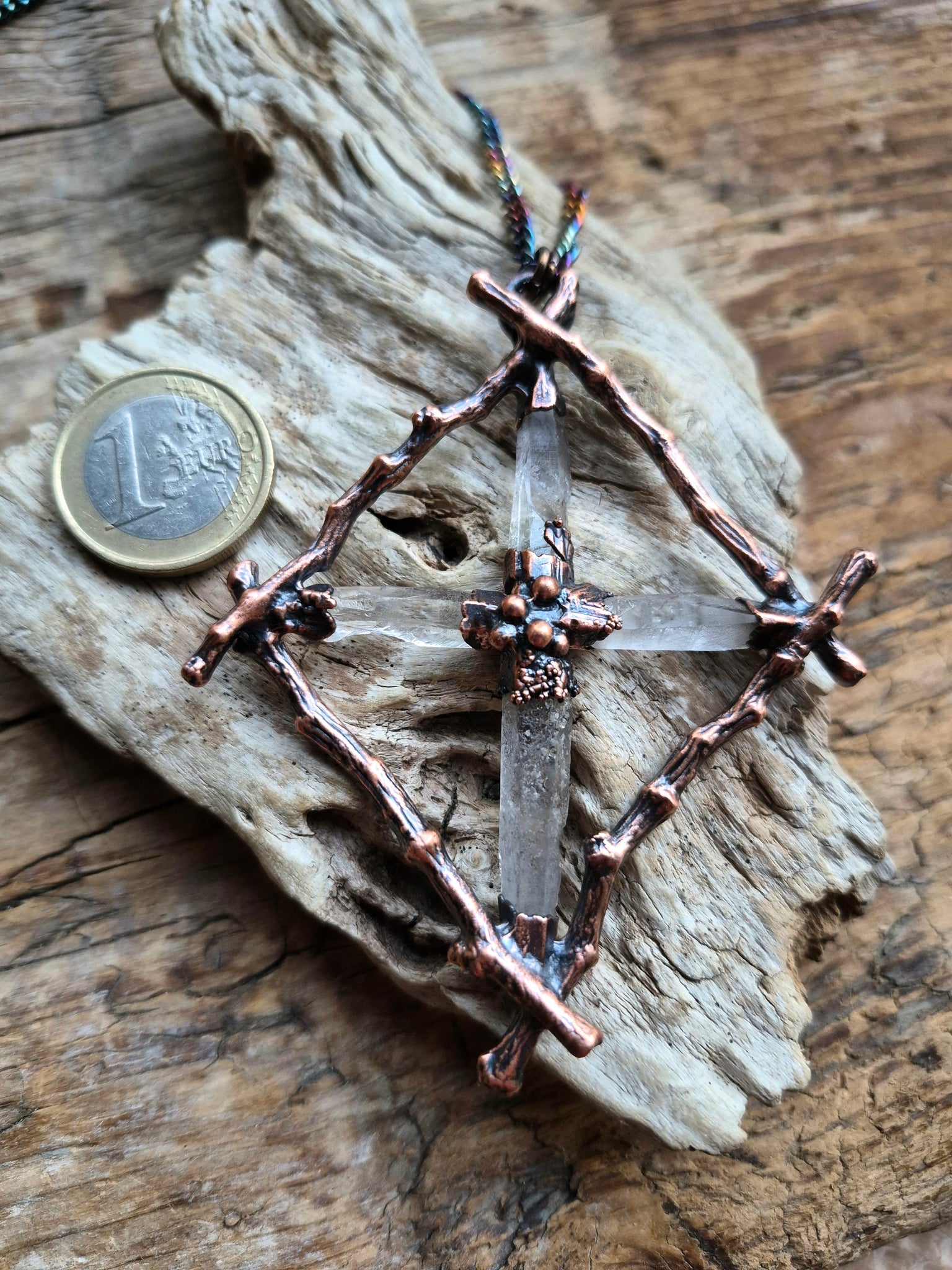 In questo esemplare unico i vertici di una croce formata da punte grezze di Quarzo ialino sono uniti tra loro da ramoscello di carpino che la iscrivono in un rombo.