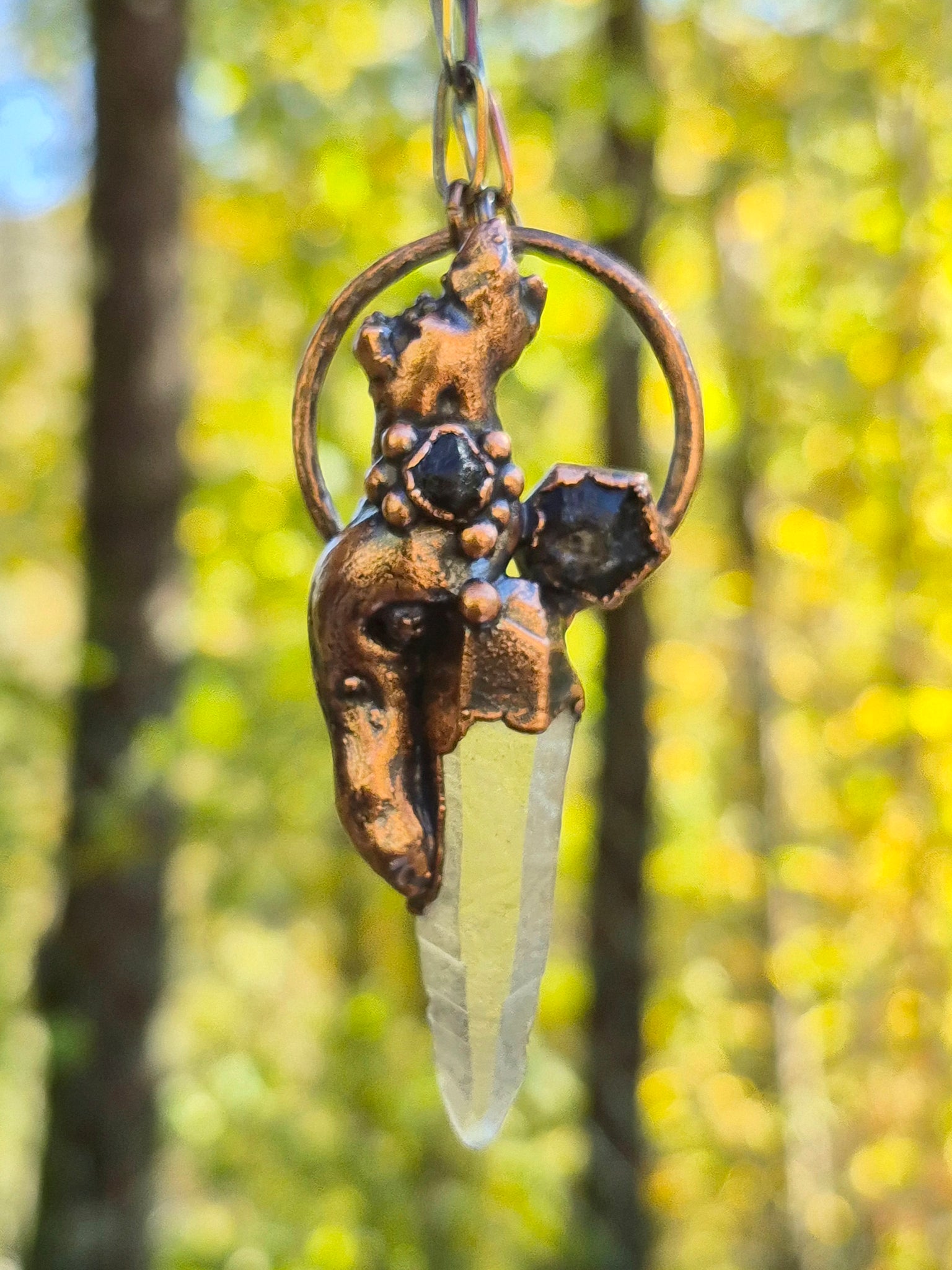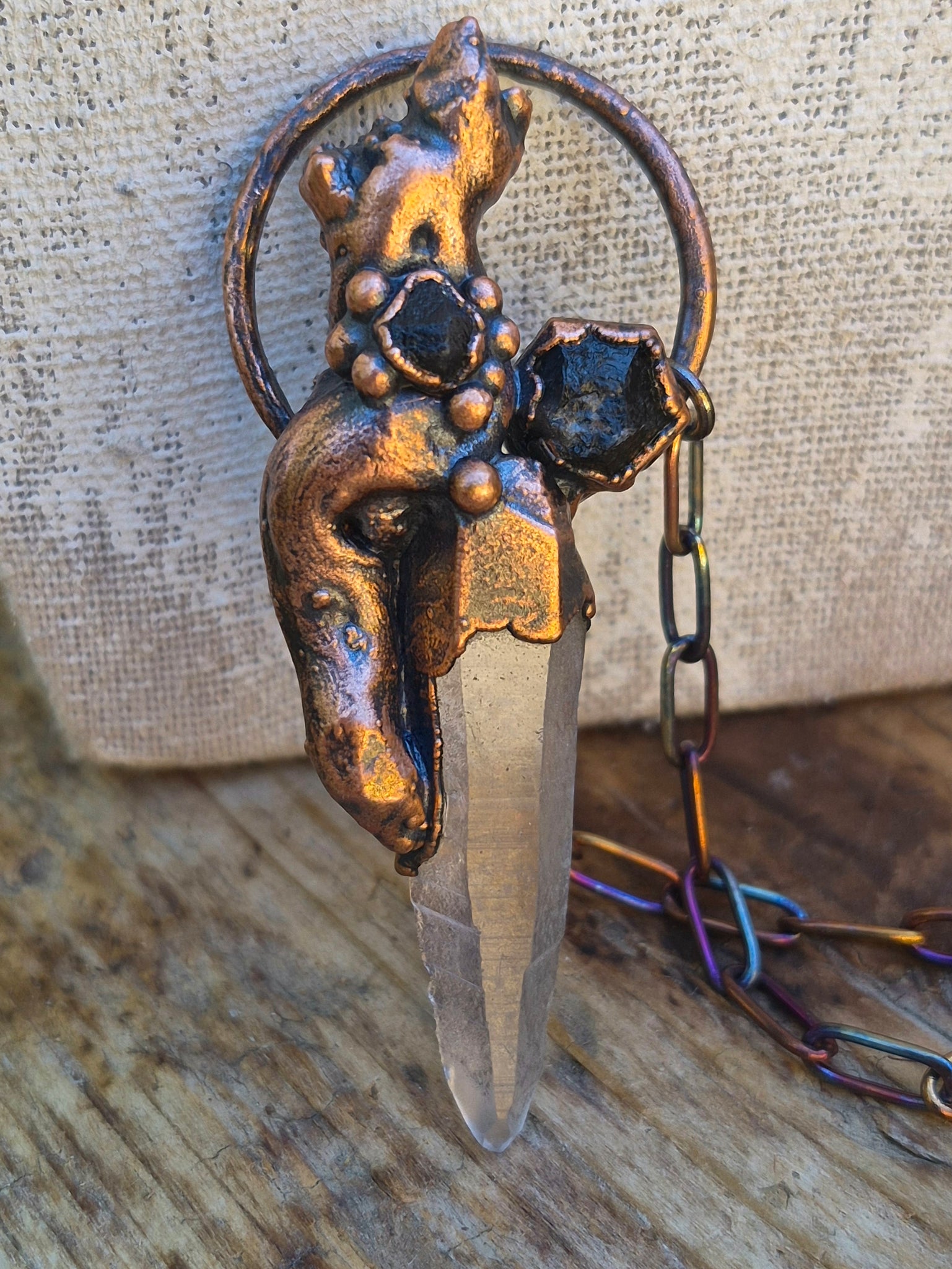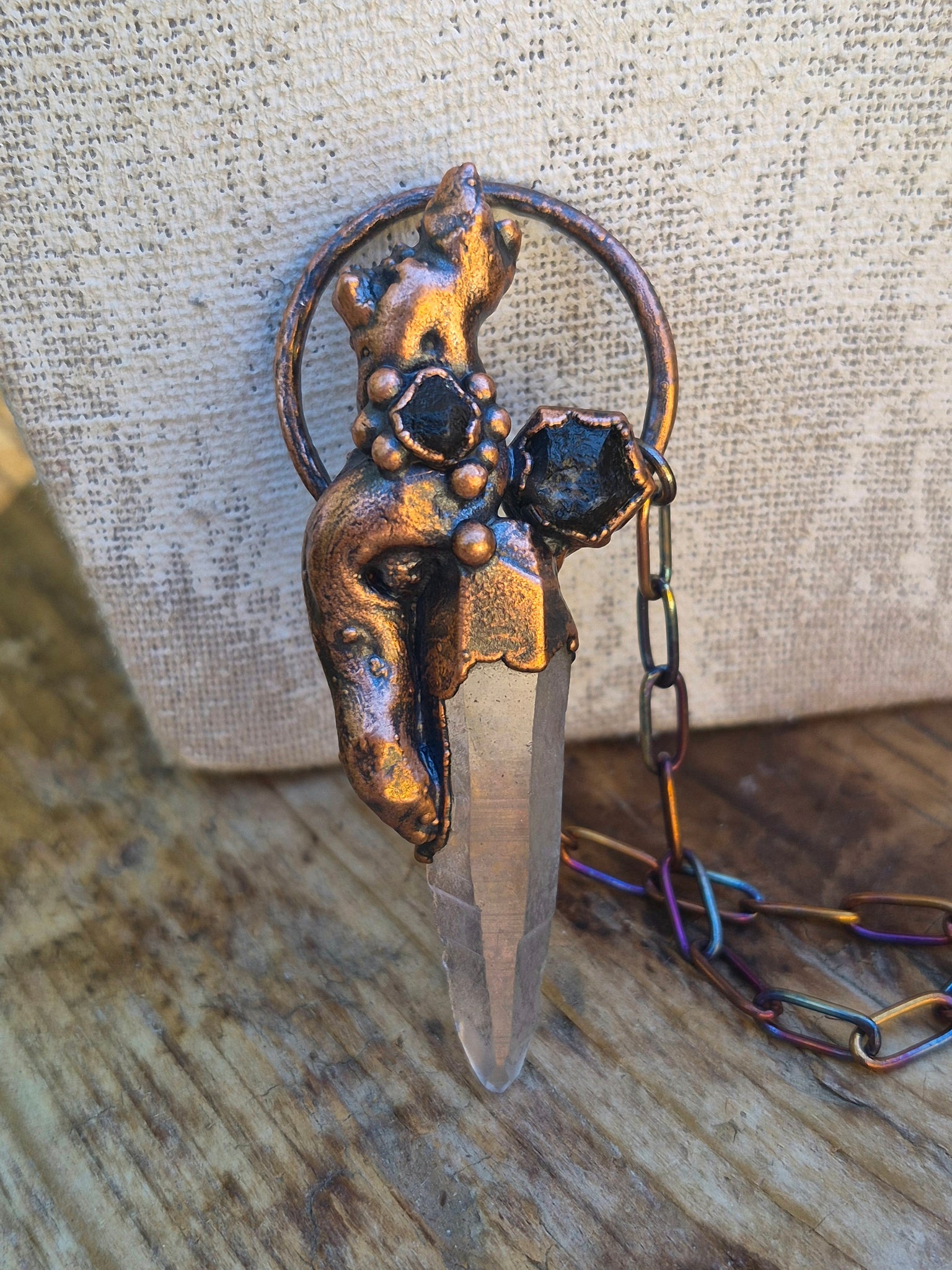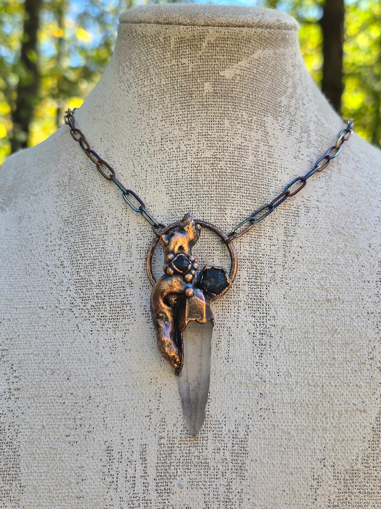 Il gioiello è un pezzo unico realizzato completamente a mano in Rame trattato con una patina anticante per un aspetto magico e fuori dal tempo.