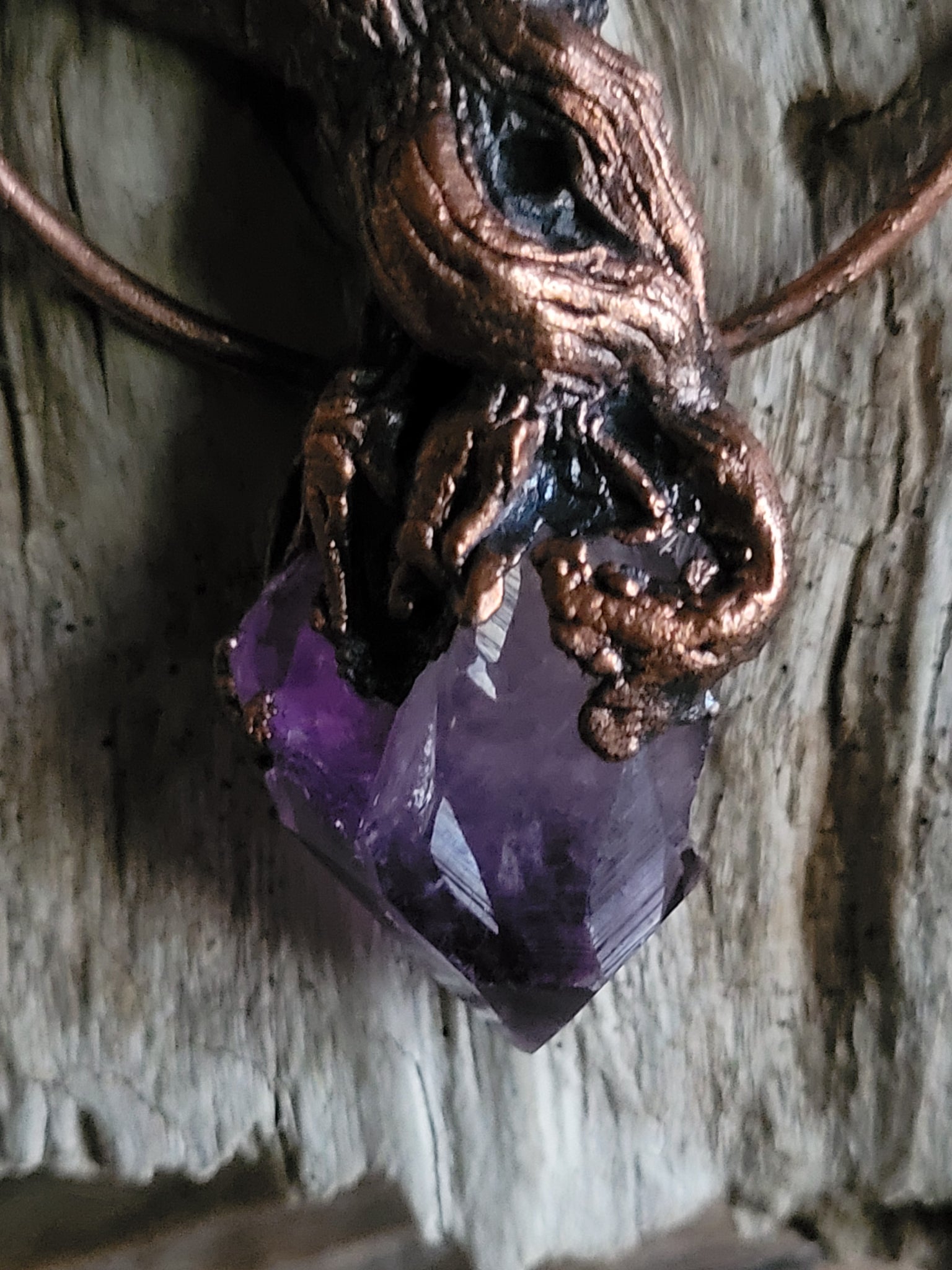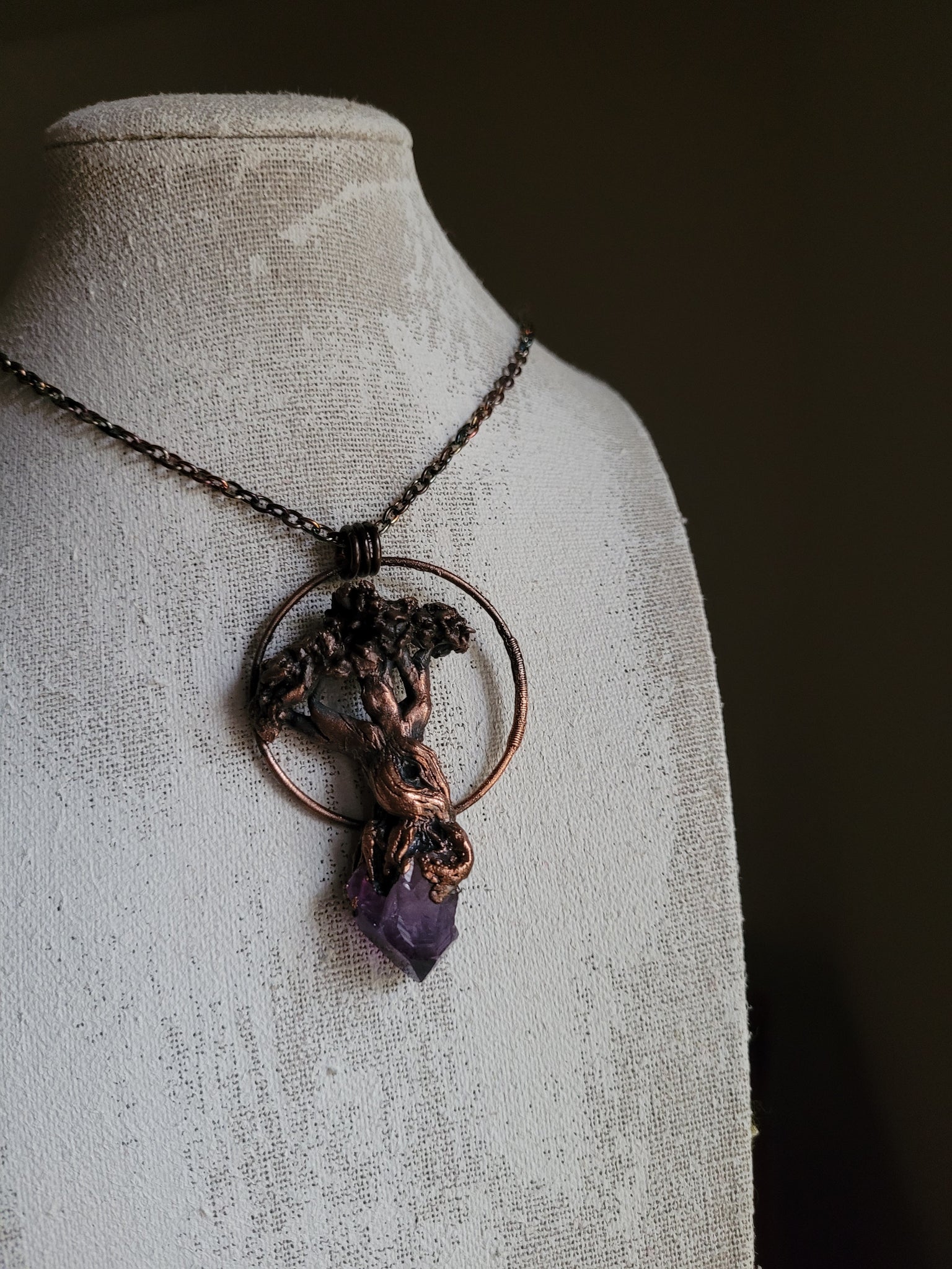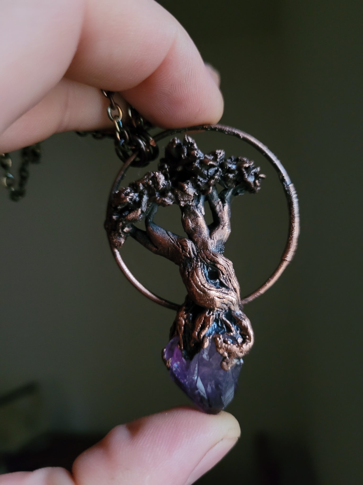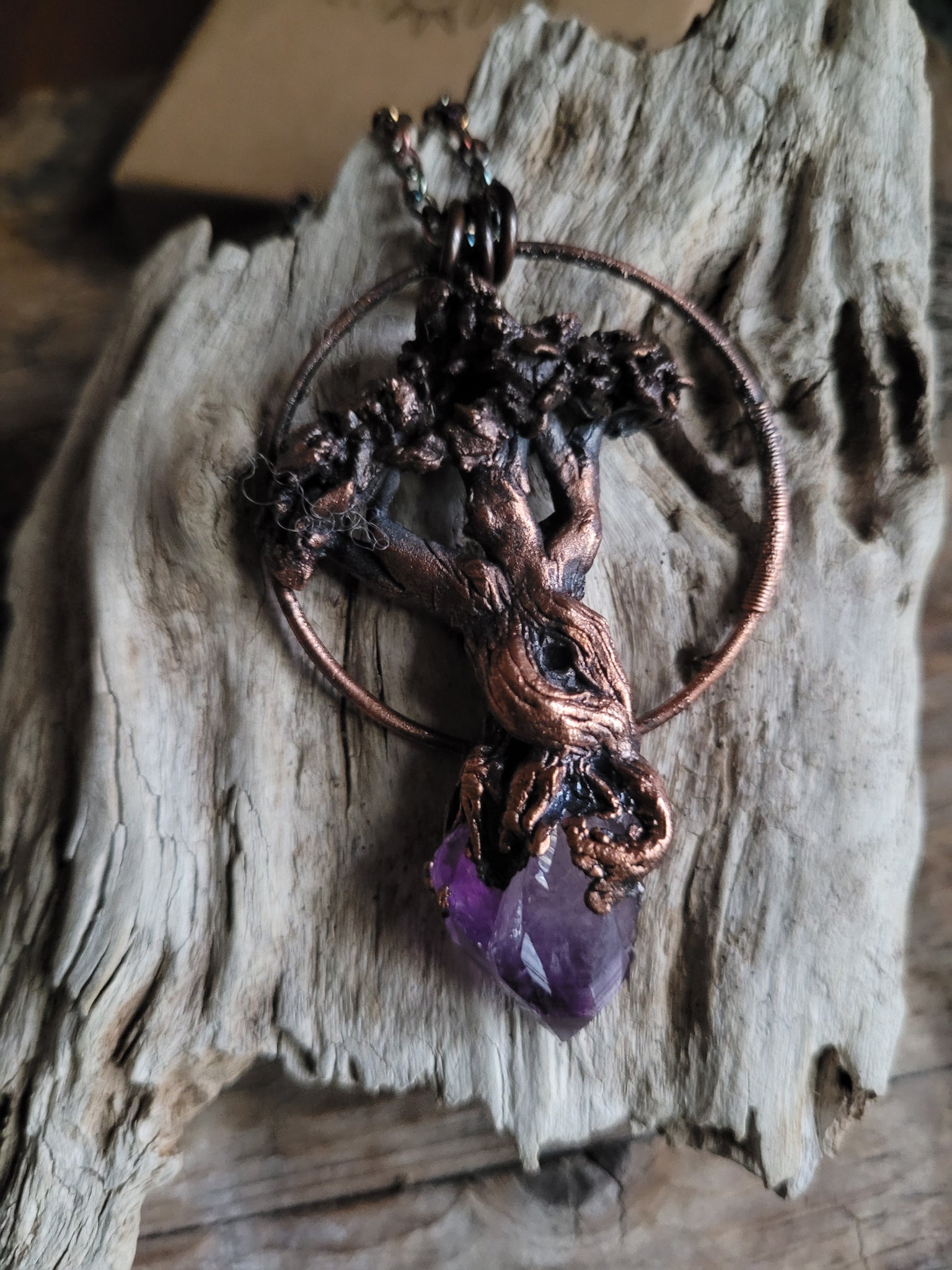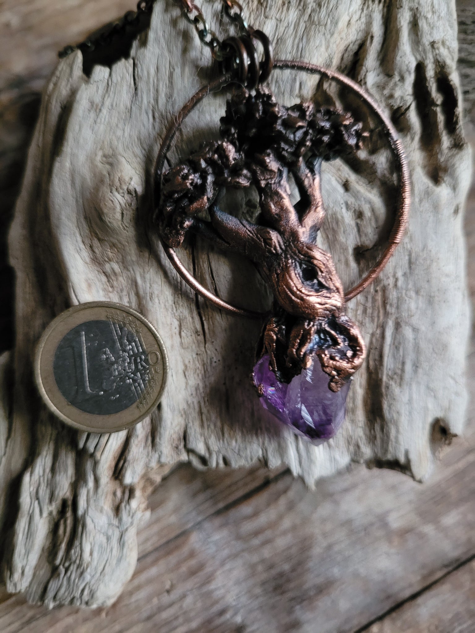 In questa creazione la figura di un essenza arborea è radicata su di un cristallo grezzo di Ametista