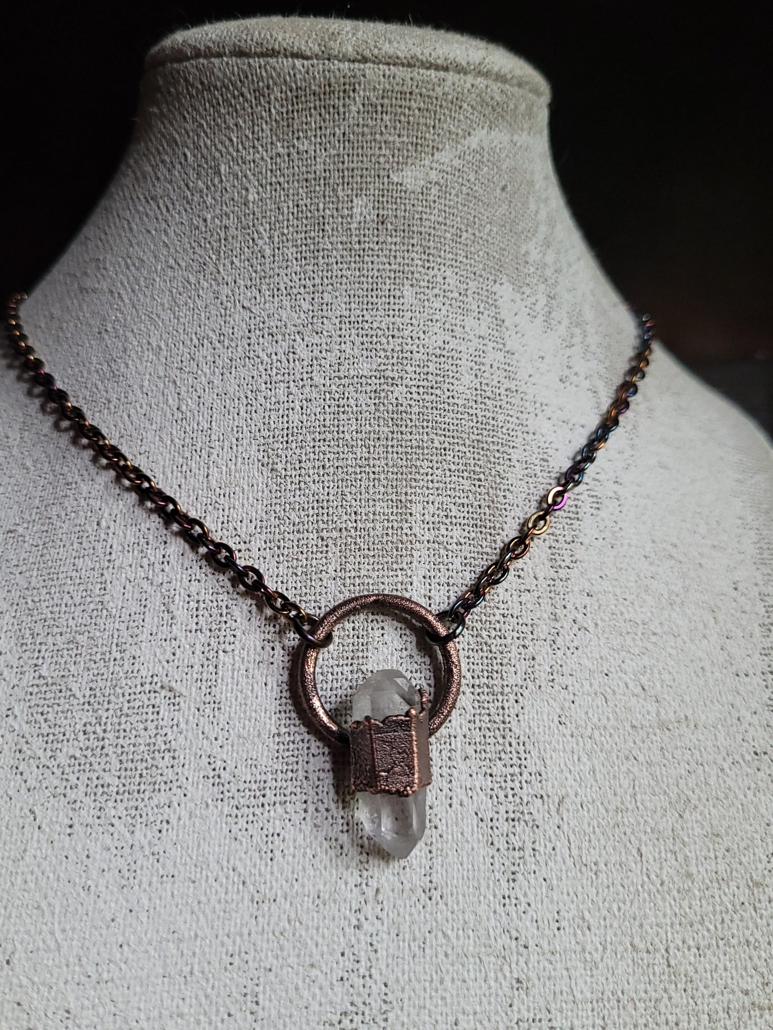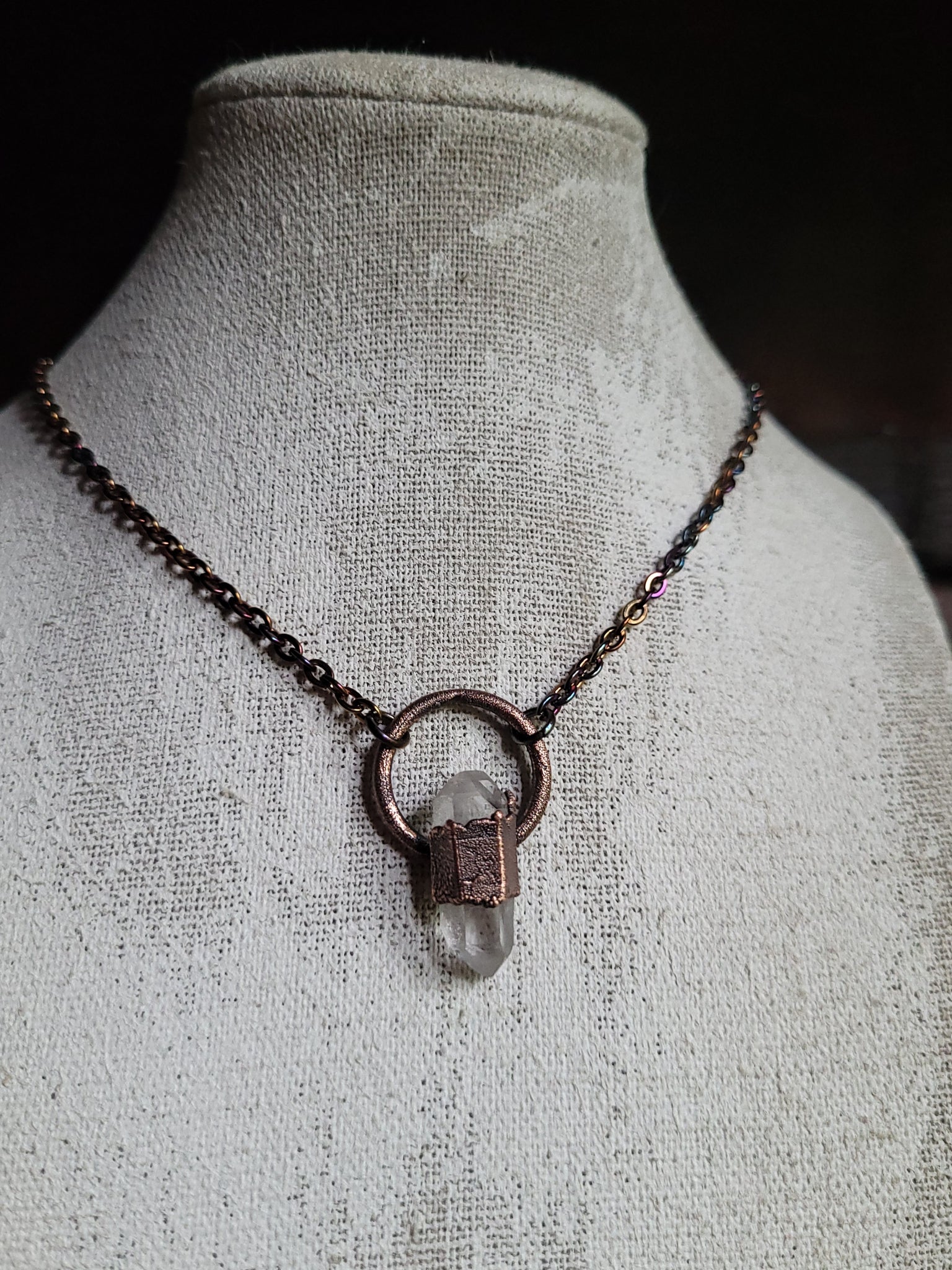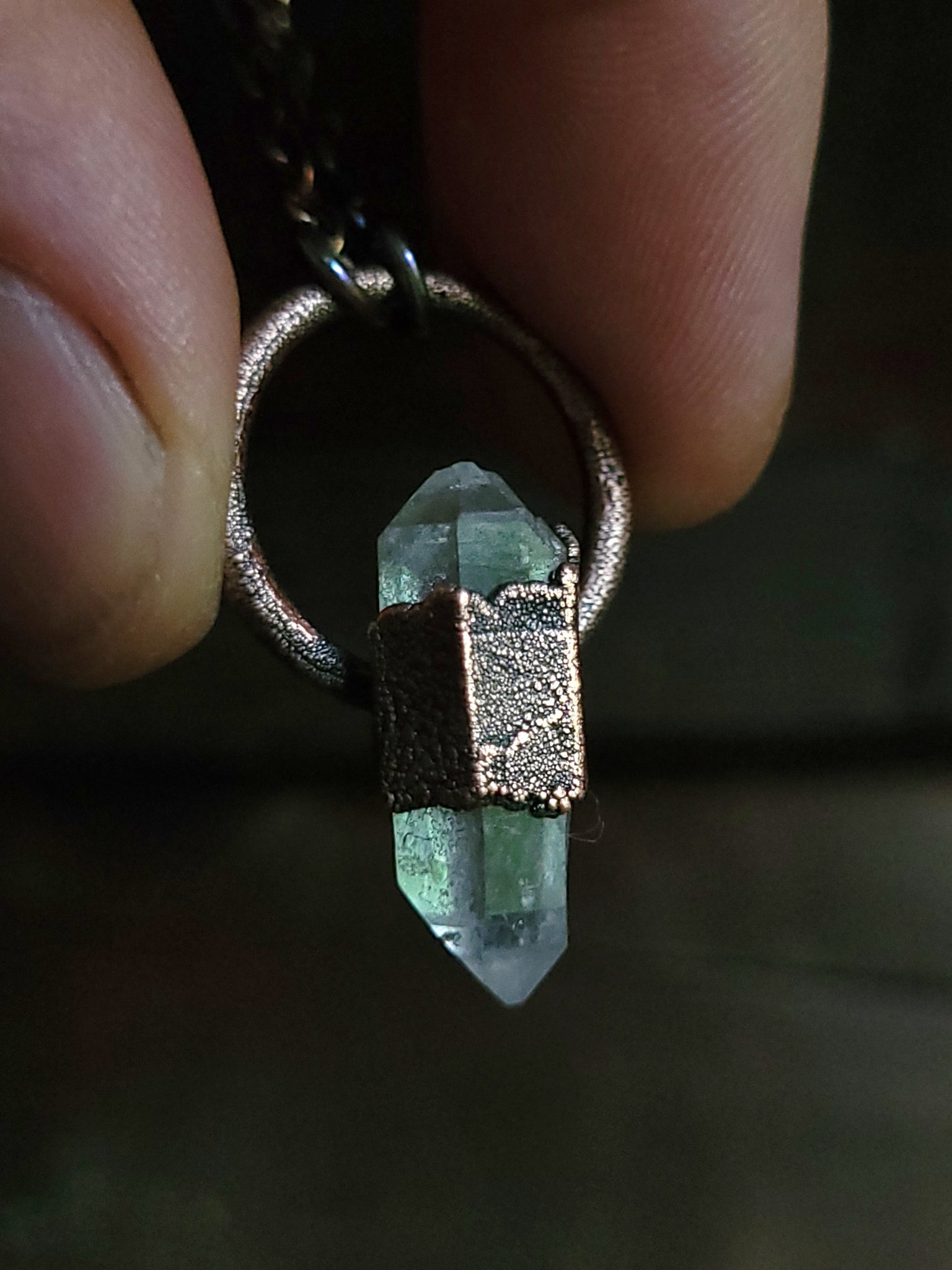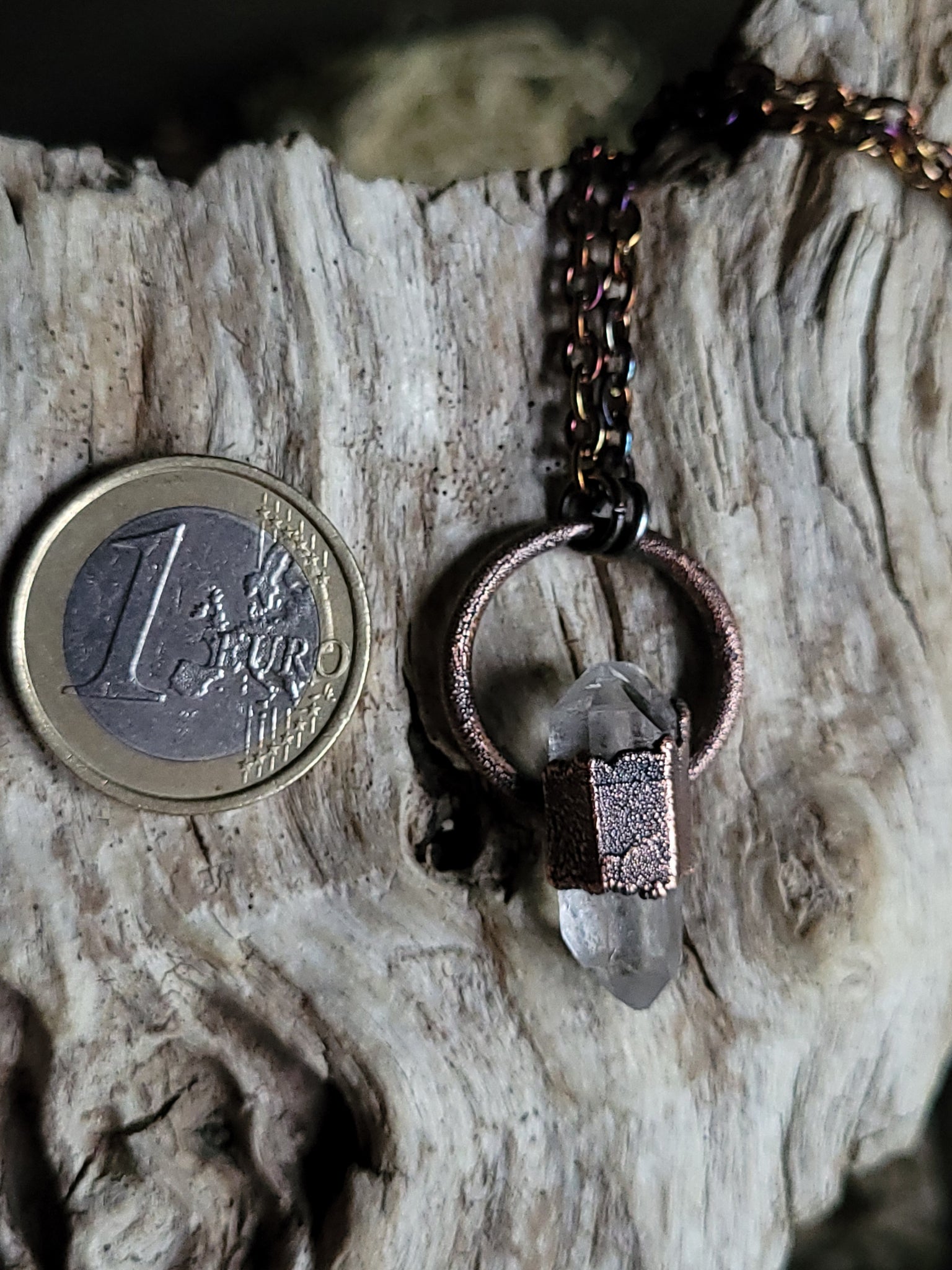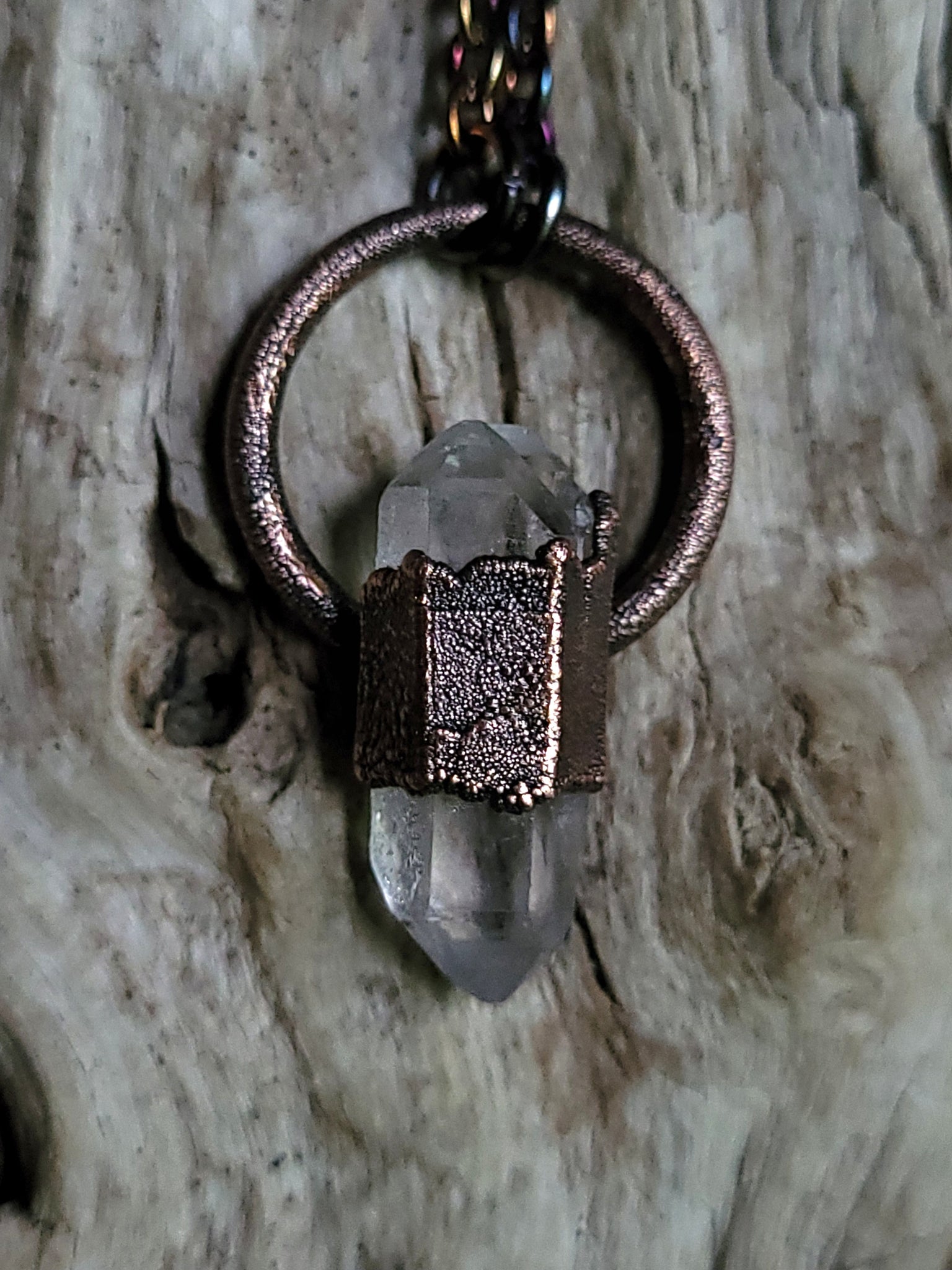 Il rame che circonda il cristallo ha una texture grezza che ricorda la terra dove questo essere minerale ha avuto origine.