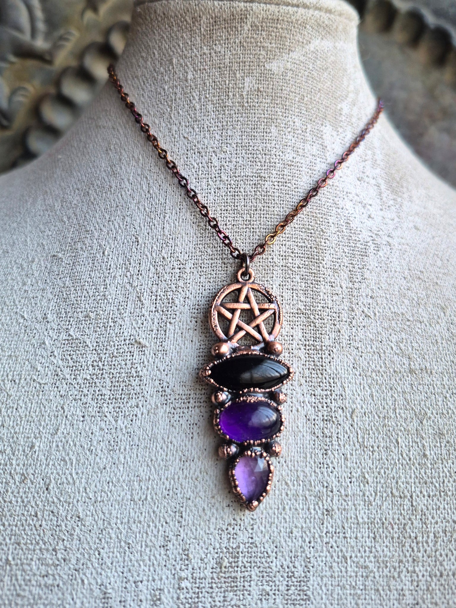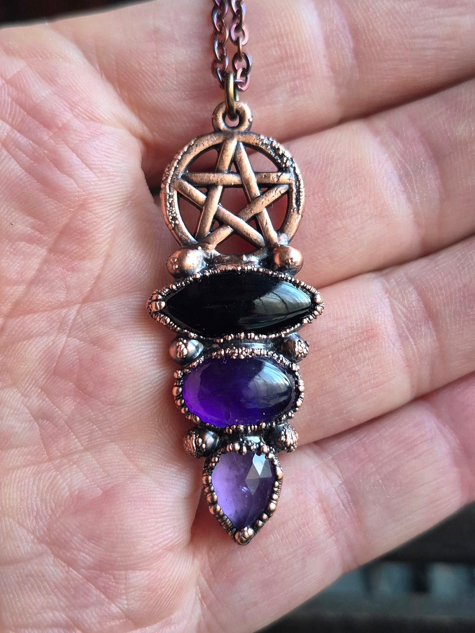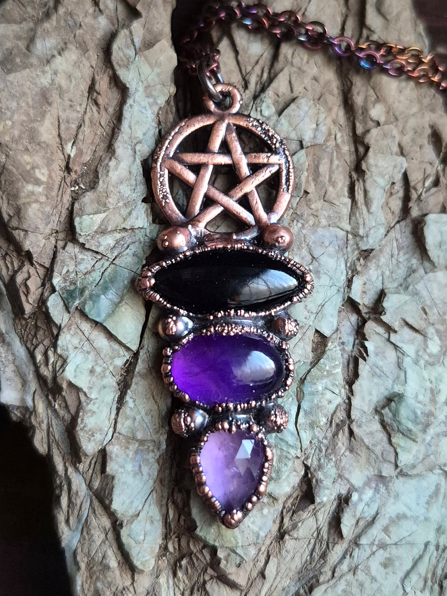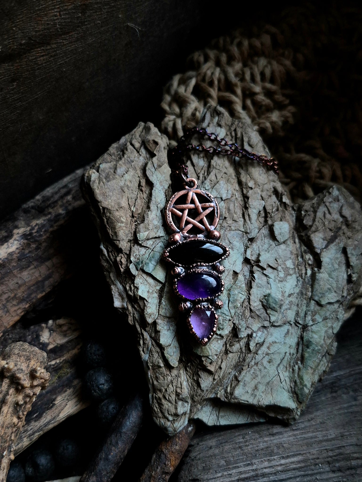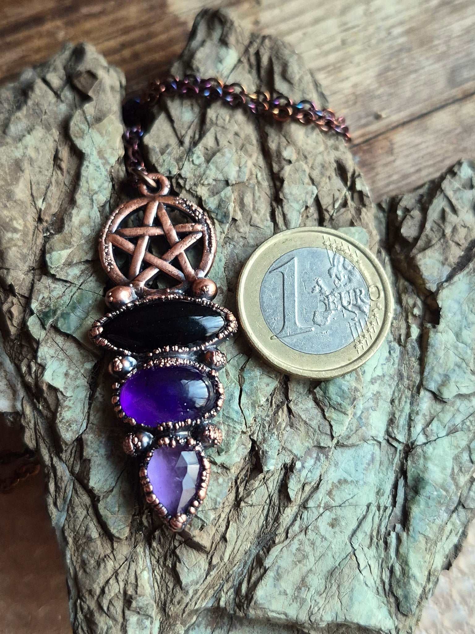 Il gioiello è realizzato in Rame trattato con patina anticante per un aspetto magico e fuori dal tempo, viene fornito con una catenina in acciaio policromo di 45 centimetri e confezionato in una robusta scatola per gioielli in cartone naturale
